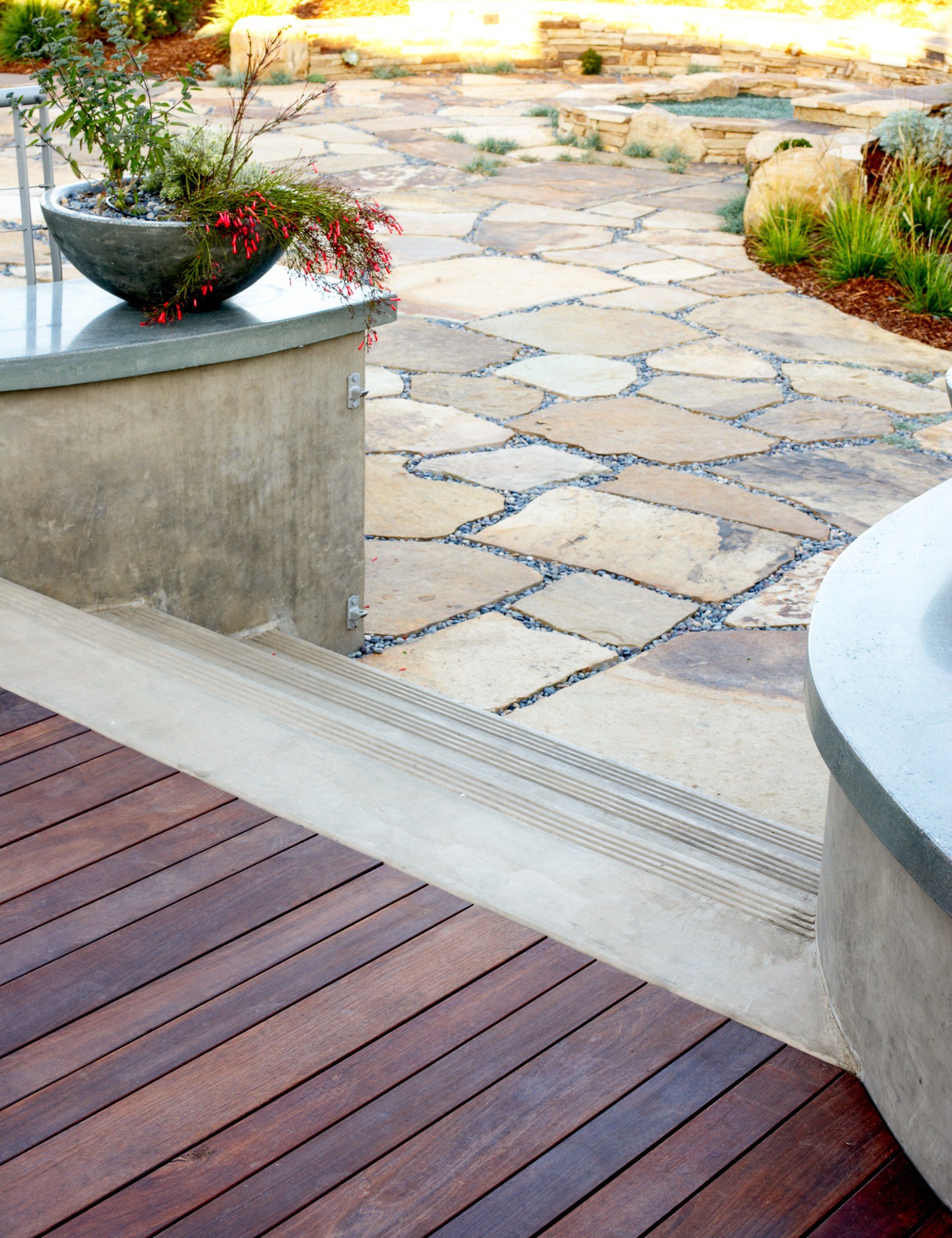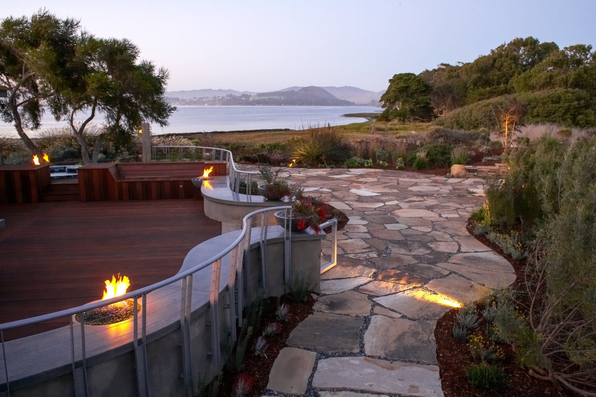 This back-bay residence melds contemporary design with rugged natural elements to reflect the regional landscape surrounding the site. The project draws on the curved shapes of the bay’s shoreline and estuary that can be seen winding away from the property’s edge. These gentle sweeps were then drawn into the smooth curving hardscape walls, more textured stone seat walls, and walk-ways. The polish of the concrete seat walls mirror the sheen on the still waters of the bay in the late afternoon sun. The main paving stone was selected to mimic the colors in the distant sand-spit which help to define this unique back bay setting. The fingers of water that drain into the bay are drawn into the hardscape through the use of dark blue Mexican pebbles that fill the joints between the flagstone. These design elements helped give the site a connection to its spirit of place or “Genius Loci”.