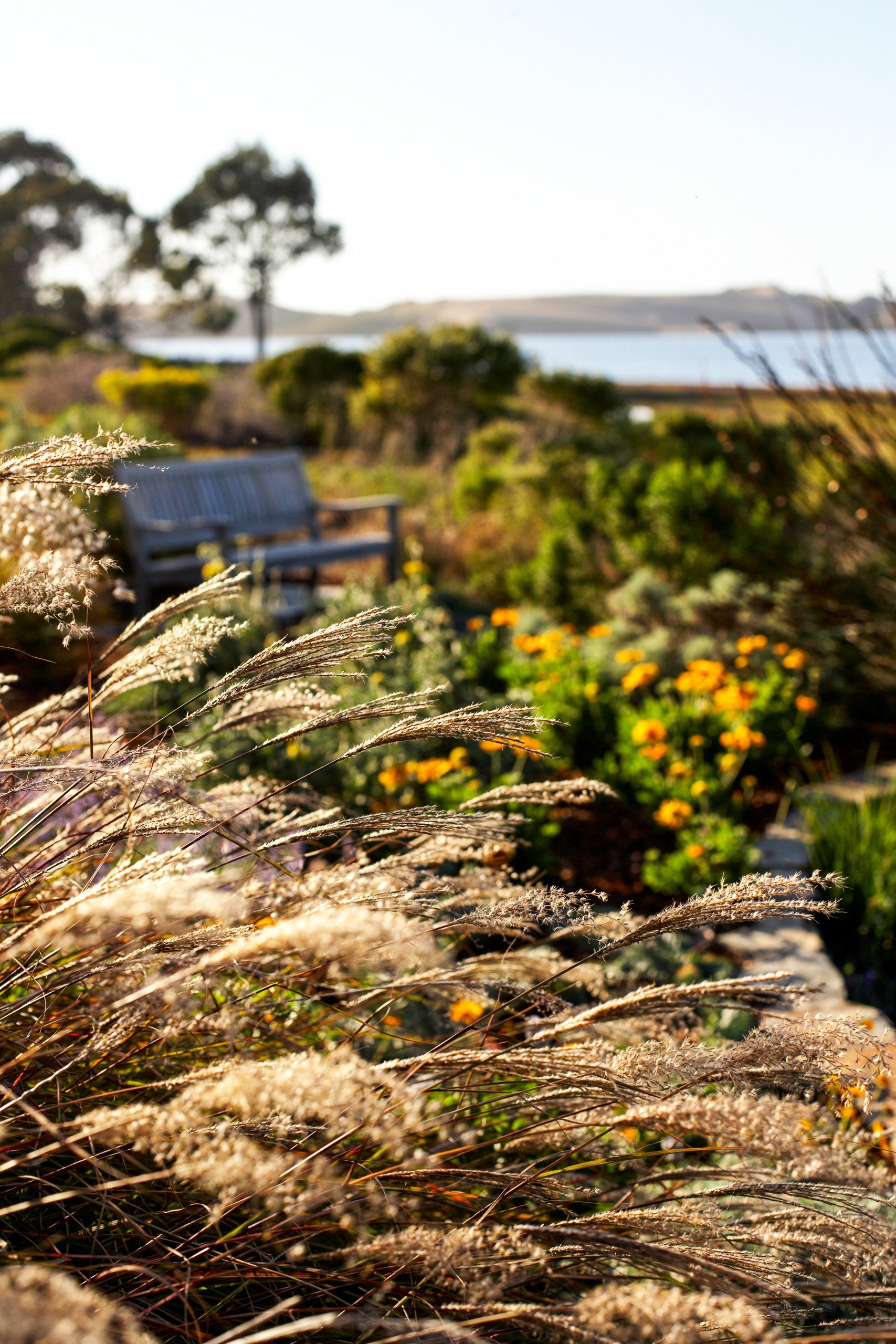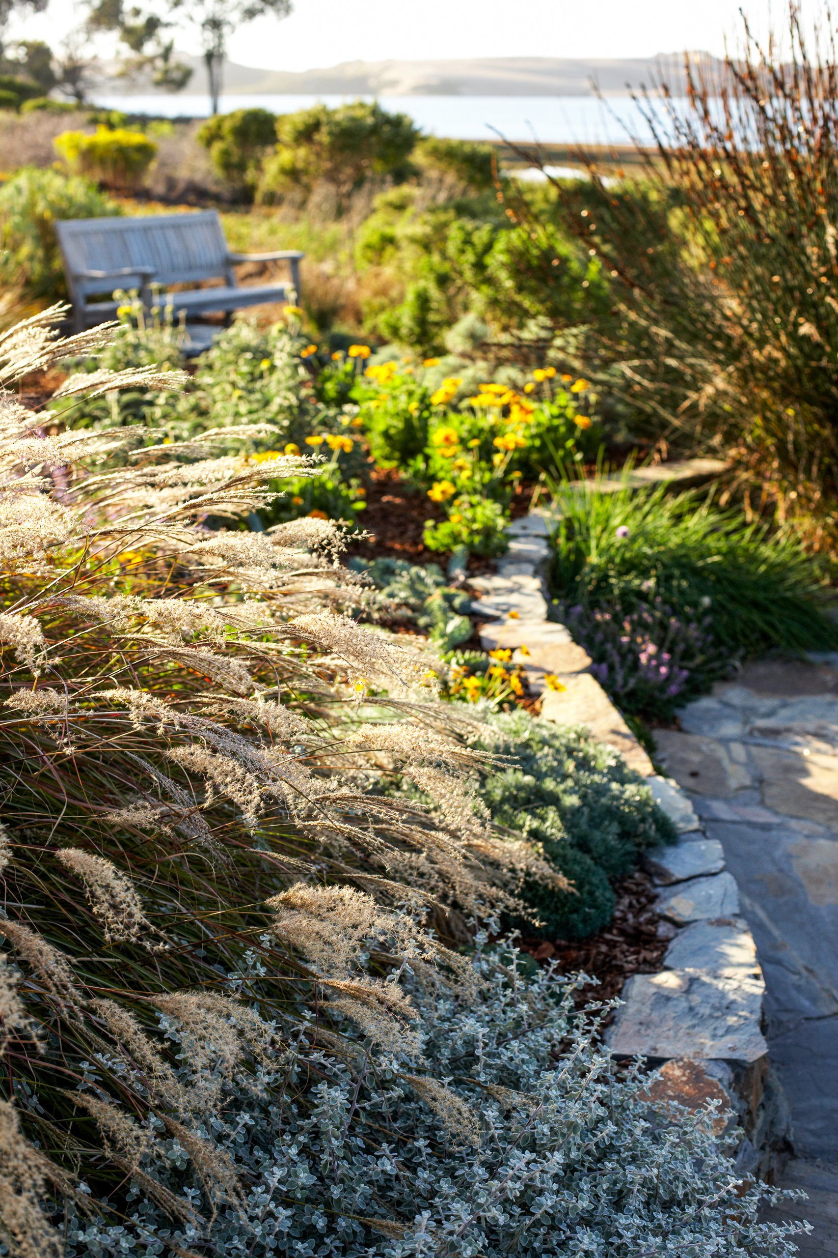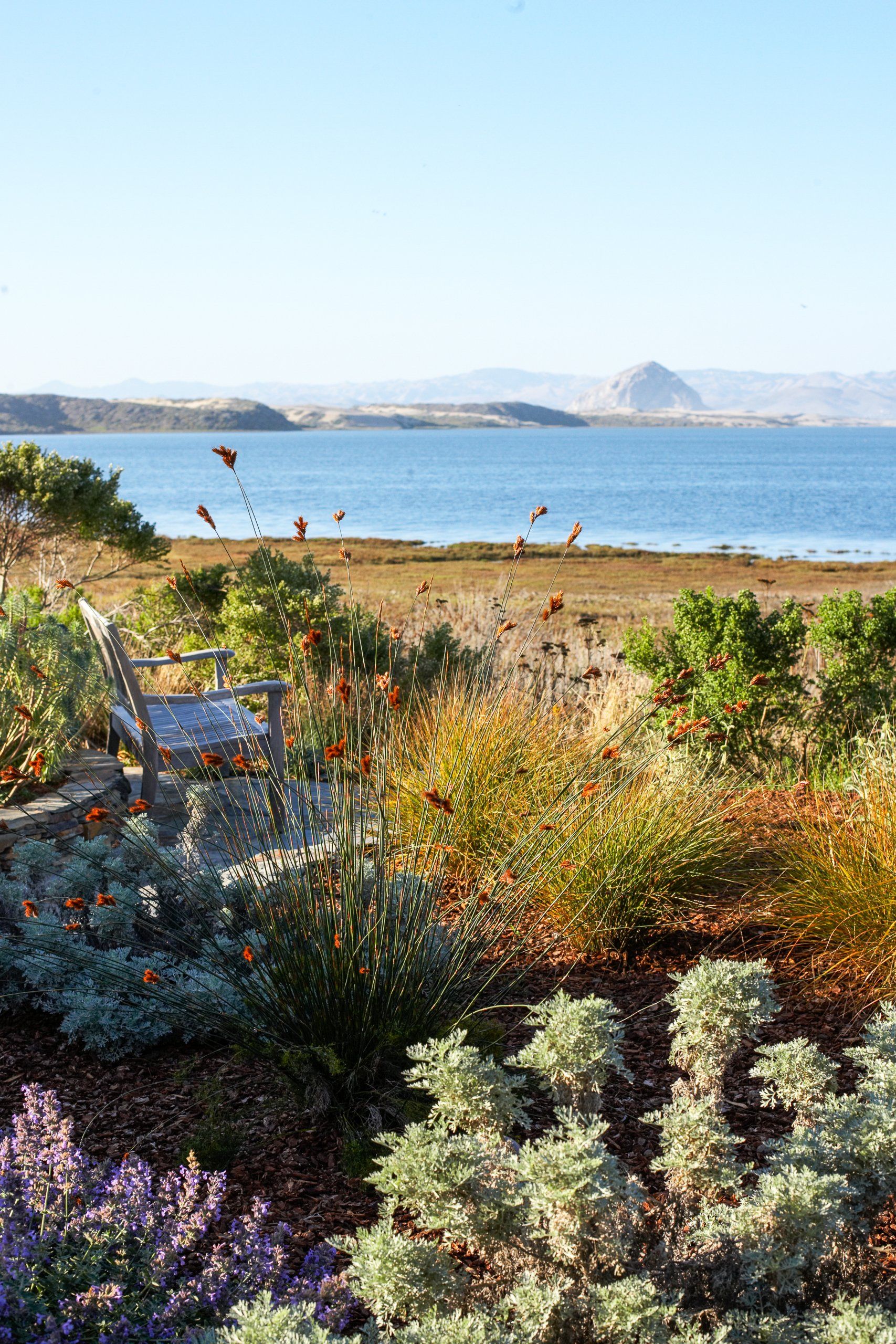 That connection to place was extremely important in creating the plant palette. The native landscape of the estuary is predominated by native juncus, pickle weed, yarrow, and coyote brush which were then pulled up into the landscape to blur the line between nature and the home. Restios, dwarf coyote brush, hybrid yarrows, artemsias, and many non-native grasses were used to draw relationships with the existing natives in the estuary as well as provide water-conscious year-long interest.
