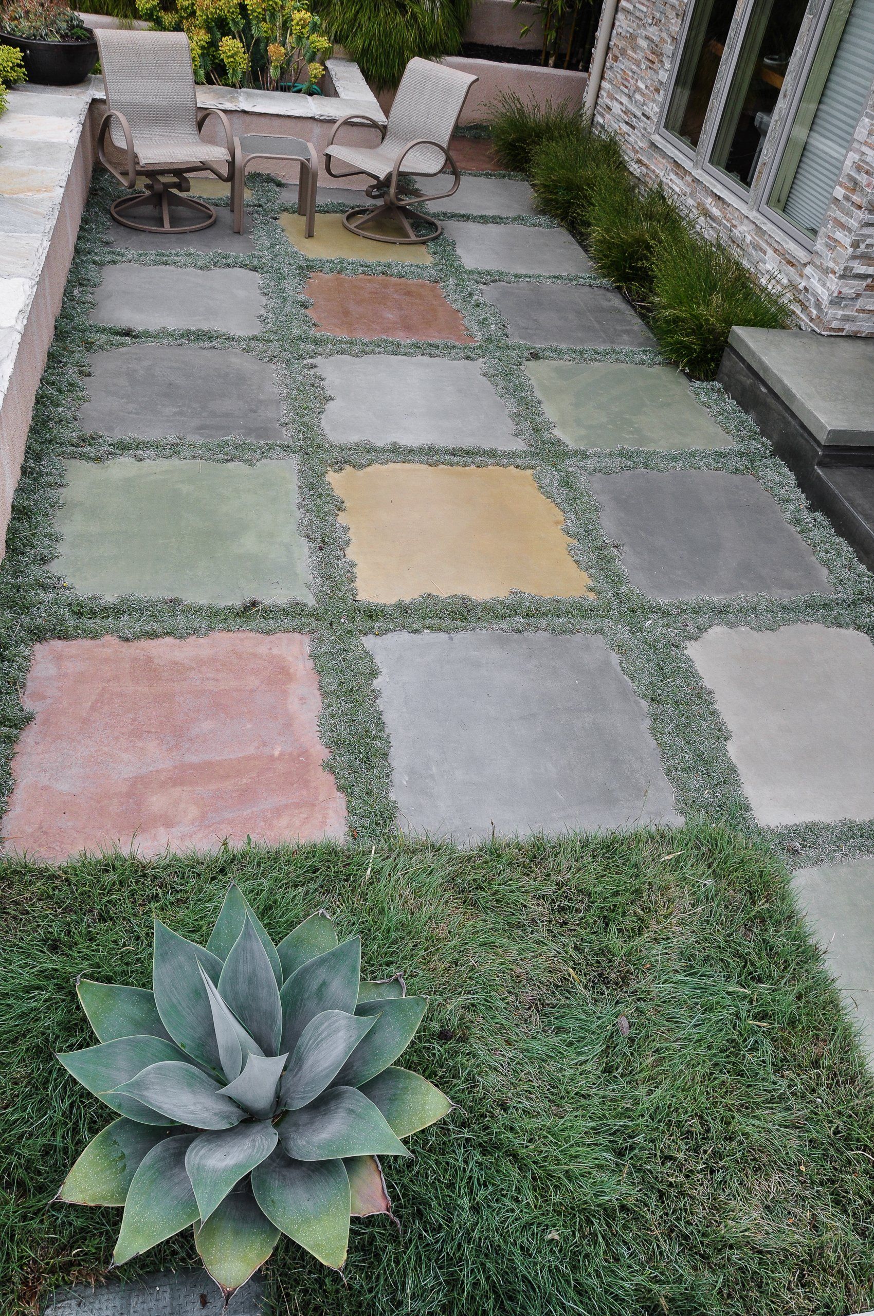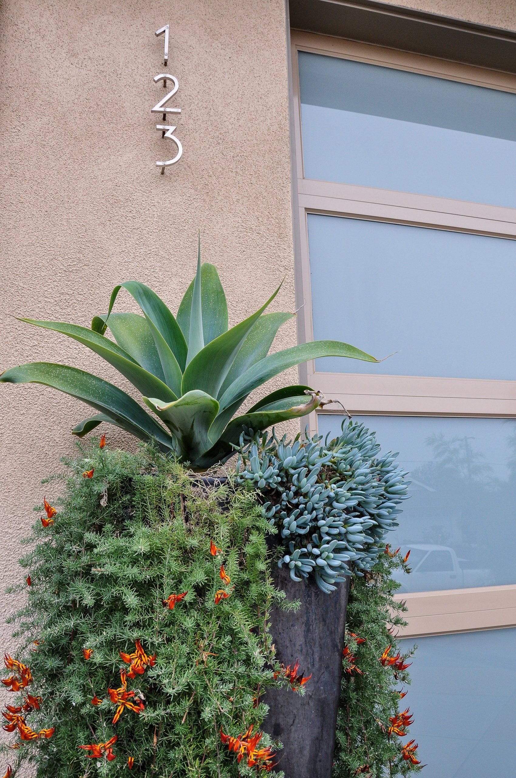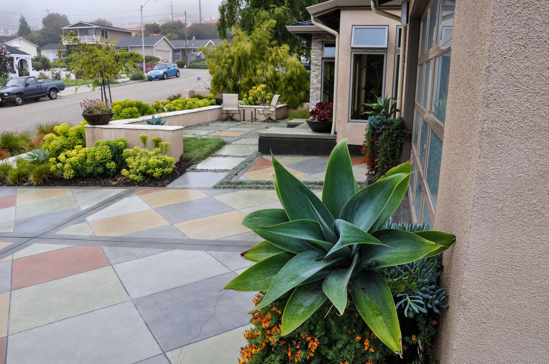 Considering the great coastal views from the front yard, but the initial lack of privacy, a shallow wall was constructed to create a comfortable front patio courtyard. Vibrant Euphorbias surround the wall creating a pop of color against the front of the house. The front yard also benefited from tall planters against the house housing showy plants bringing in more visual interest for the eye to move around the site. In order to unify the exterior with the interior of the home, the driveway pattern was continued into the garage floor as this is how the clients would most times enter their home.