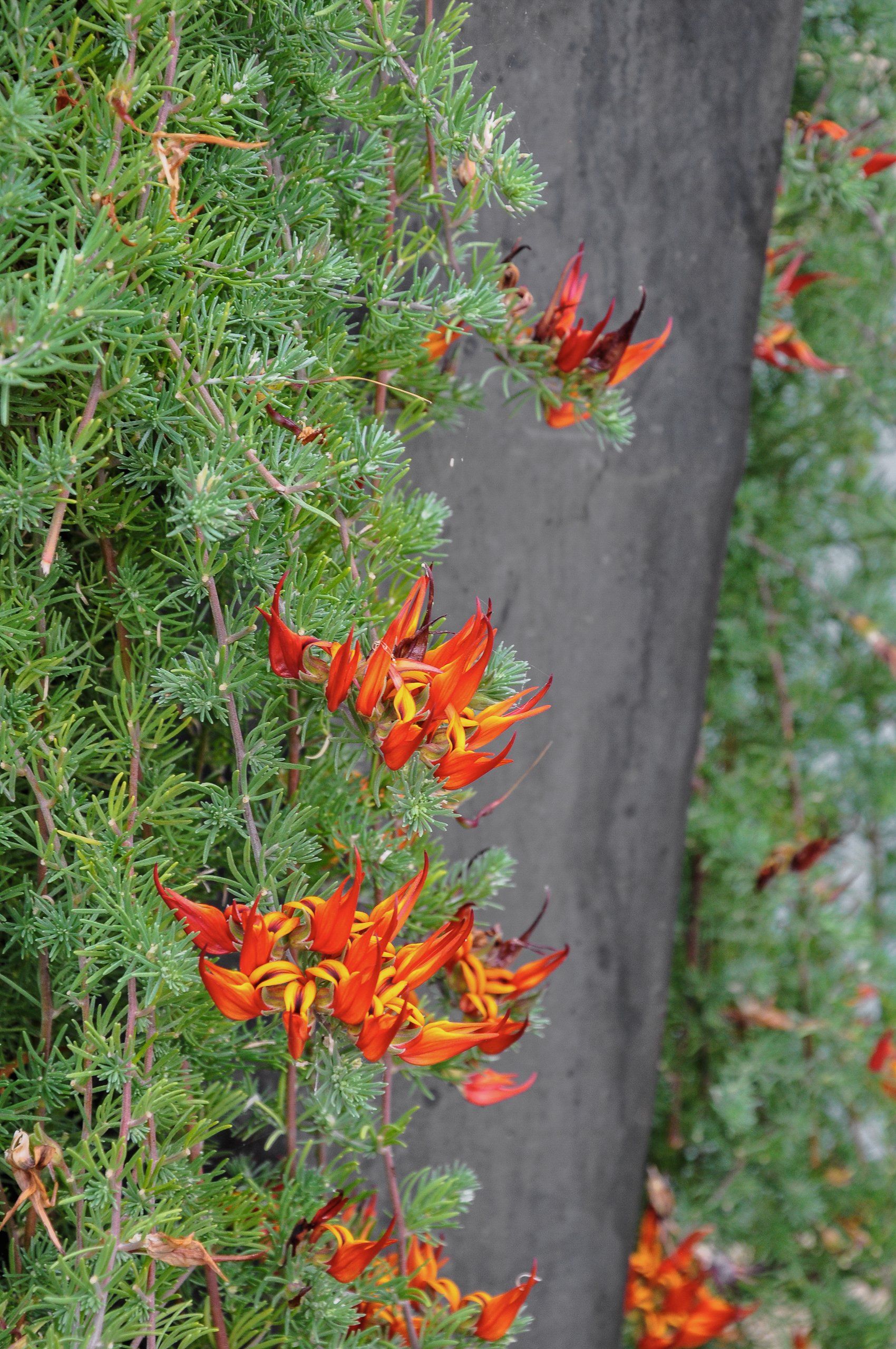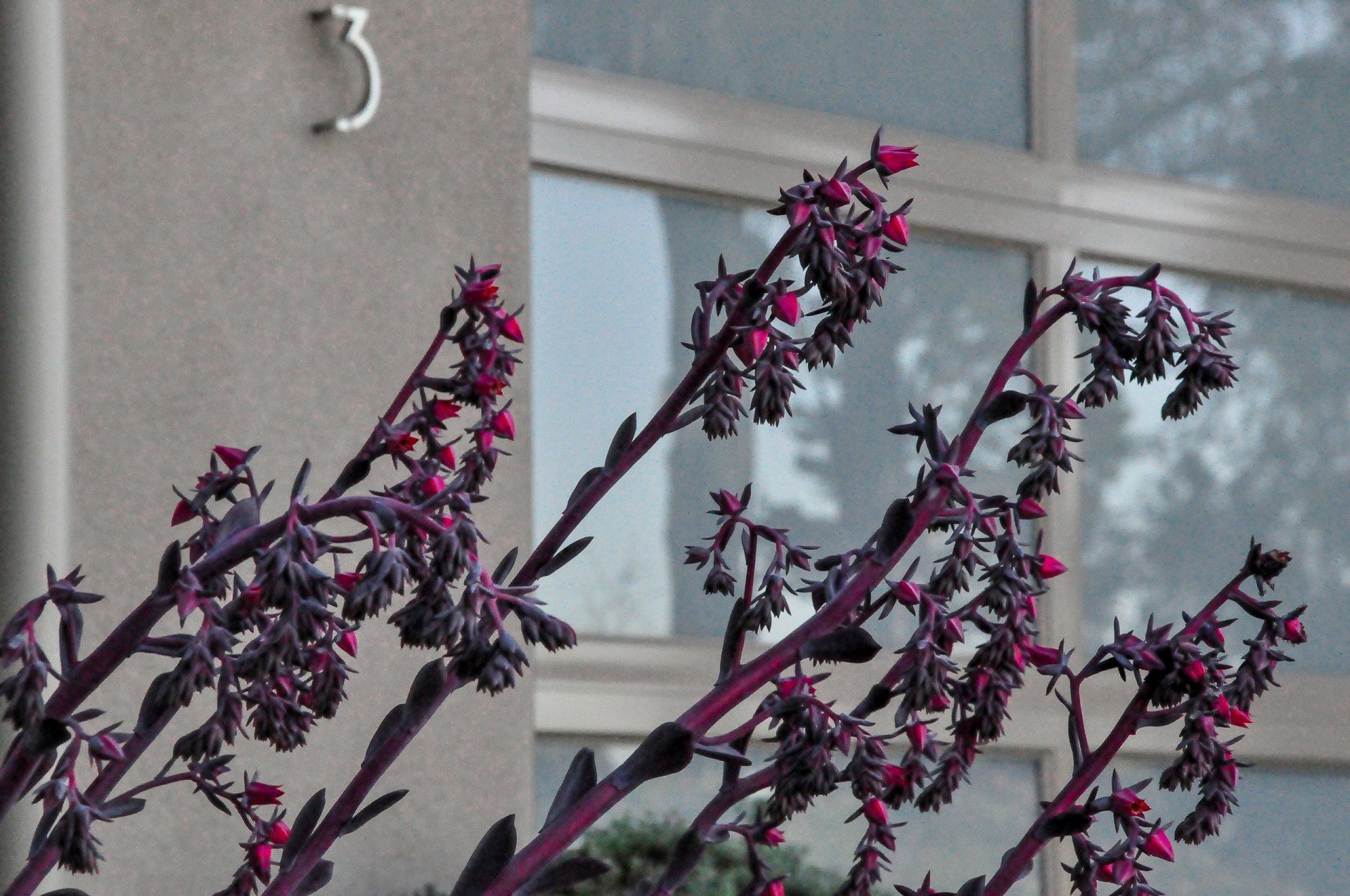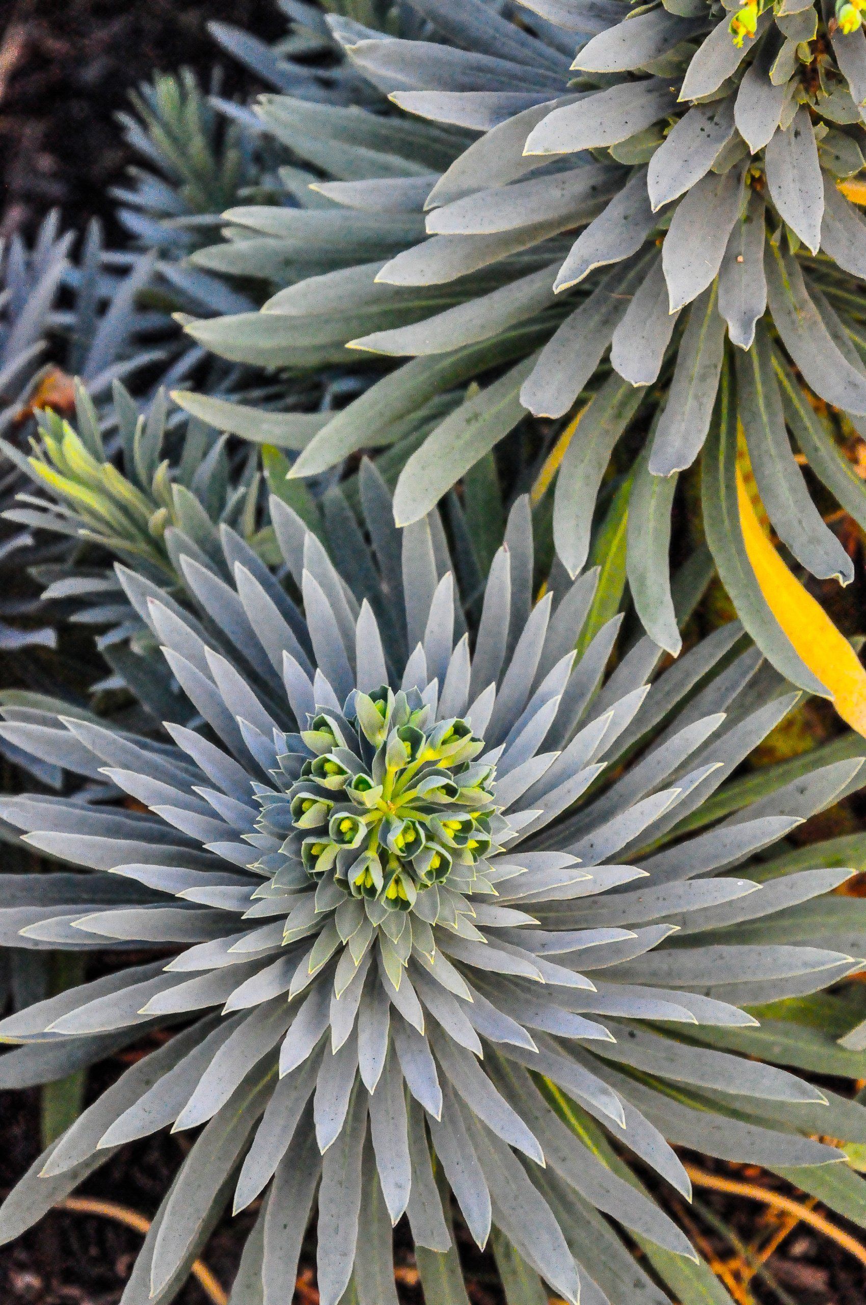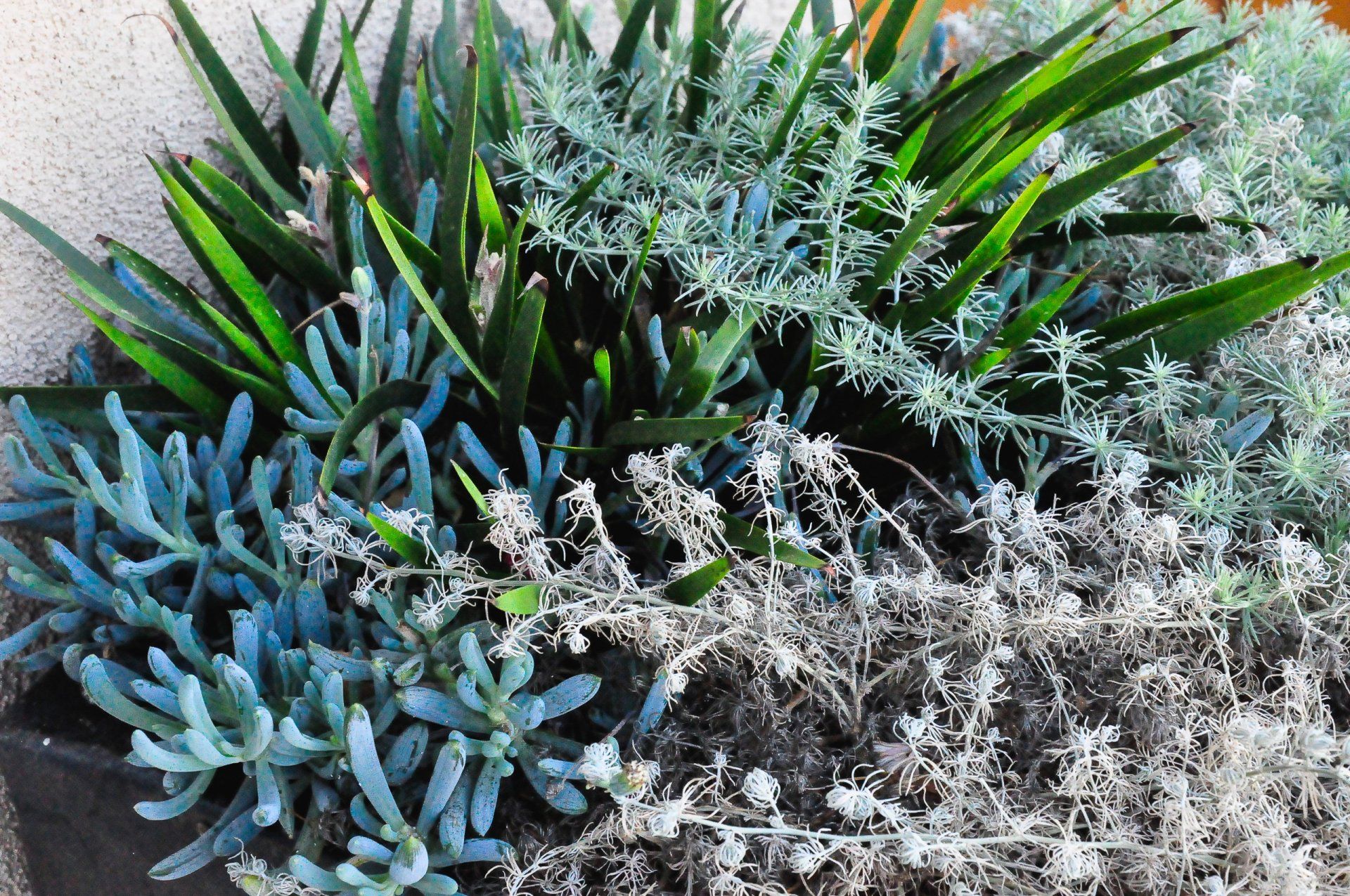 Considering the great coastal views from the front yard, but the initial lack of privacy, a shallow wall was constructed to create a comfortable front patio courtyard. Vibrant Euphorbias surround the wall creating a pop of color against the front of the house. The front yard also benefited from tall planters against the house housing showy plants bringing in more visual interest for the eye to move around the site. In order to unify the exterior with the interior of the home, the driveway pattern was continued into the garage floor as this is how the clients would most times enter their home.