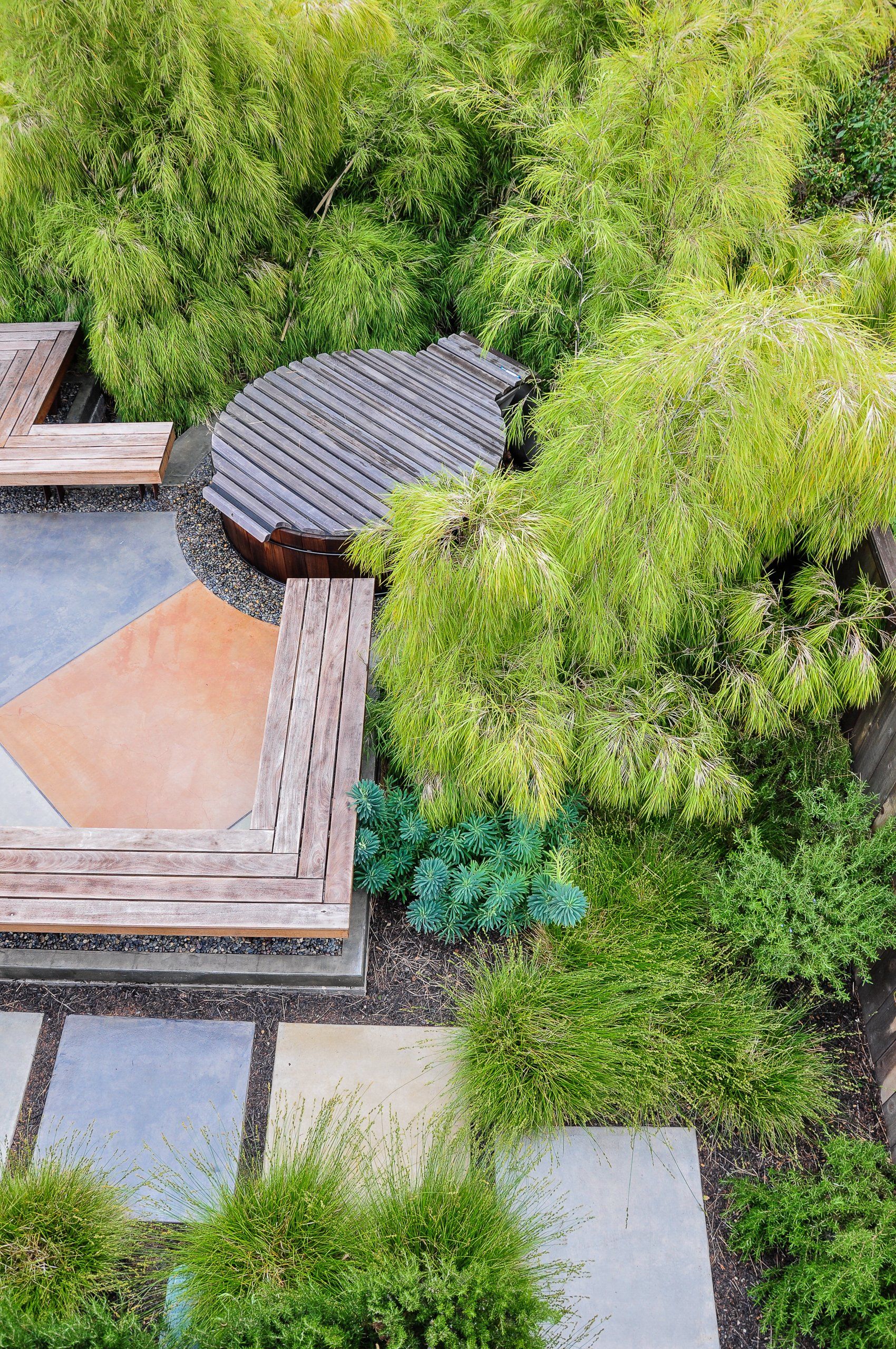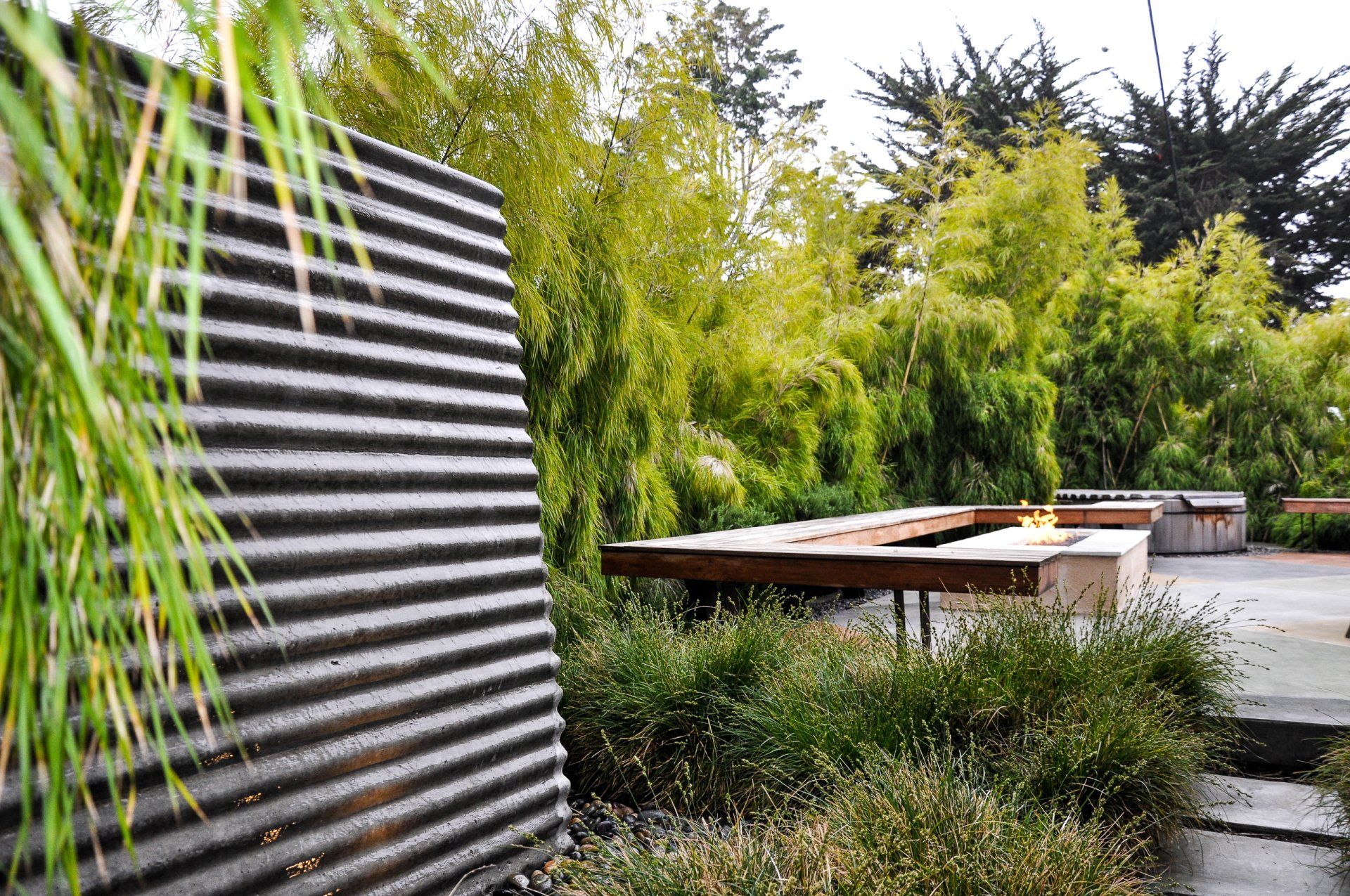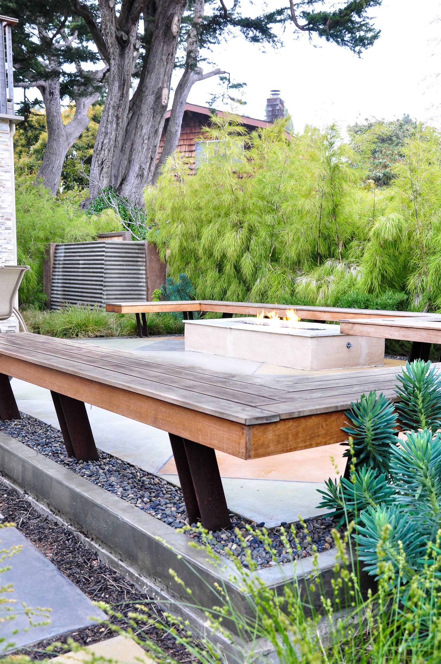 With a tight backyard, a 45 degree angle was used for the hardscape to visually expand the space. Mexican Weeping Bamboo surround the perimeter providing a bright and textural screen for privacy. Low furniture was used throughout the backyard in order for the garden to be enjoyed from inside through the low windows of the home. Taking advantage of the low windows, a corrugated panel water feature was constructed off the living room window. Corten steel supports for the bench were installed within pebble to prevent rust from bleeding onto the surrounding concrete.