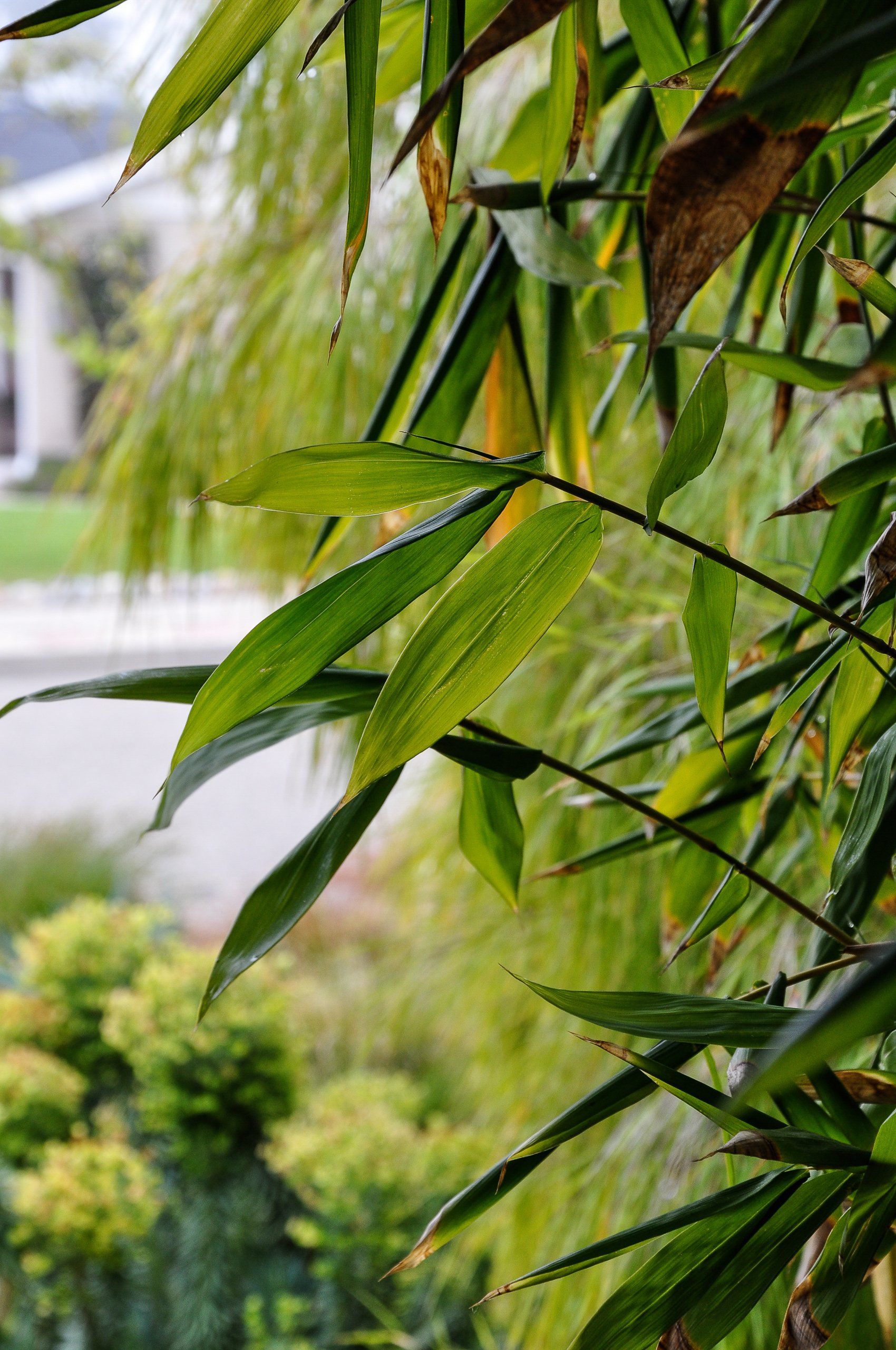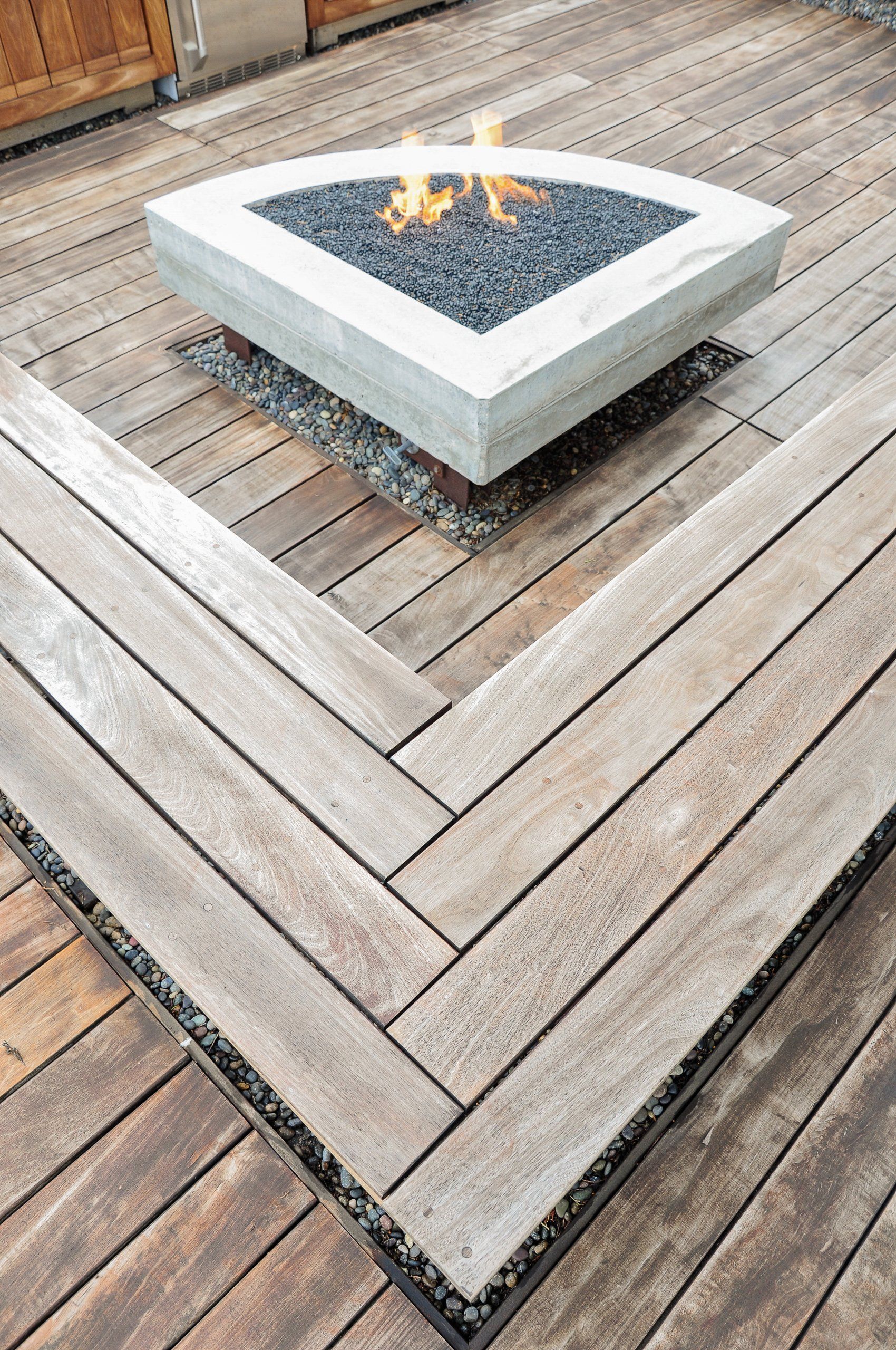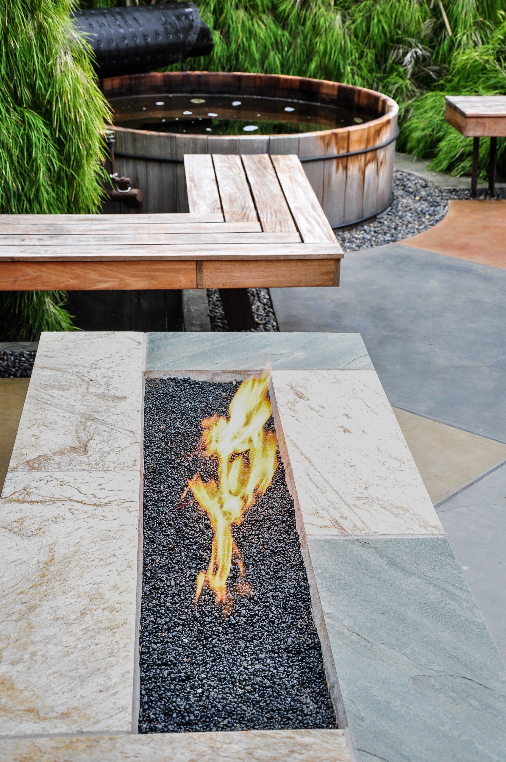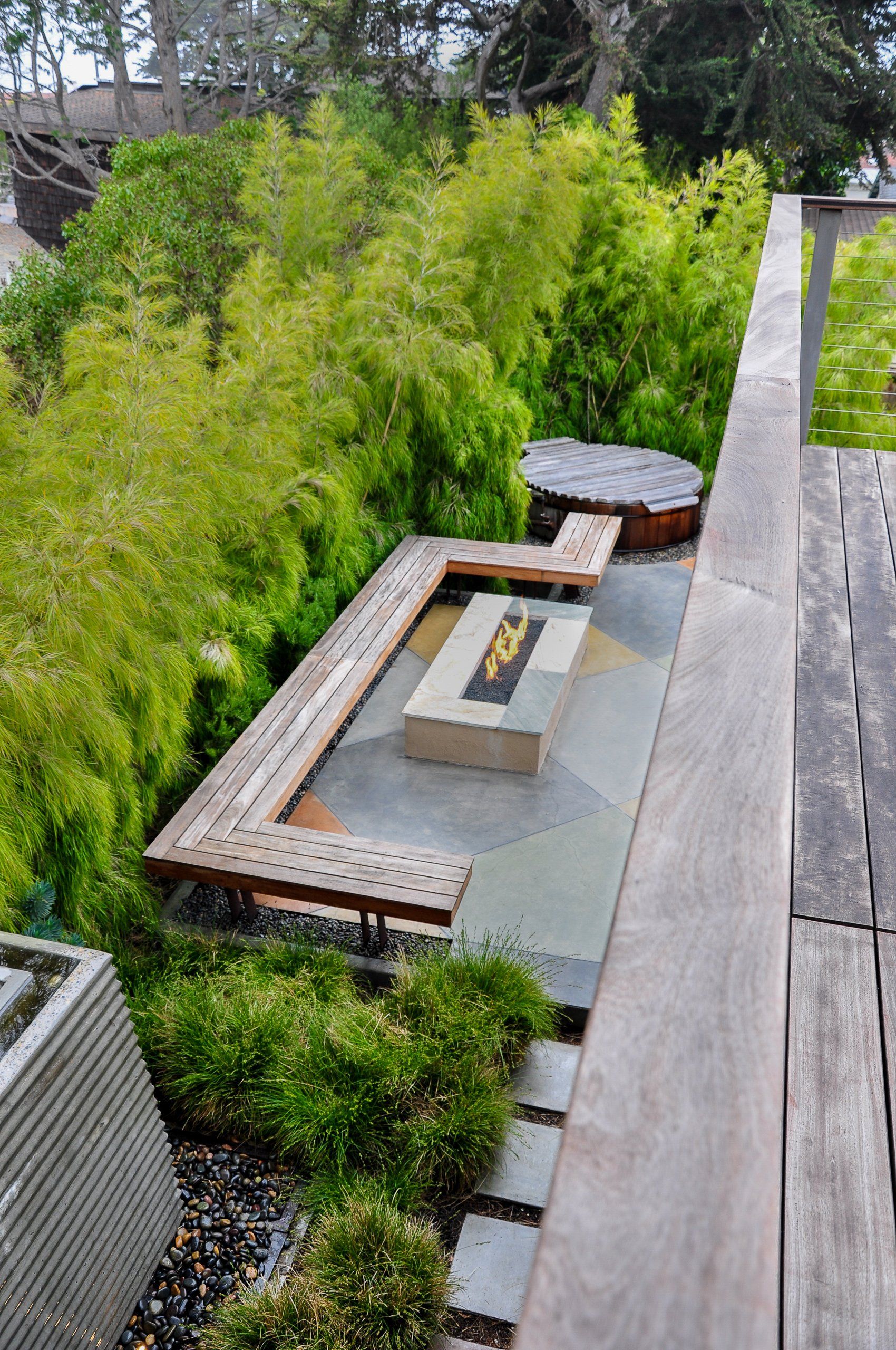 With a tight backyard, a 45 degree angle was used for the hardscape to visually expand the space. Mexican Weeping Bamboo surround the perimeter providing a bright and textural screen for privacy. Low furniture was used throughout the backyard in order for the garden to be enjoyed from inside through the low windows of the home. Taking advantage of the low windows, a corrugated panel water feature was constructed off the living room window. Corten steel supports for the bench were installed within pebble to prevent rust from bleeding onto the surrounding concrete.