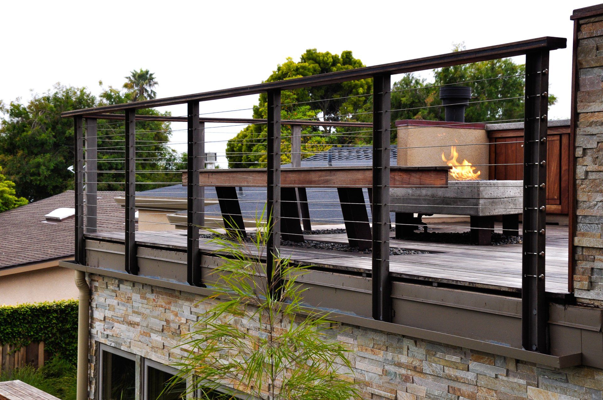 This contemporary remodel was heavily influenced by its architecture’s monochromatic color scheme, calling for a more whimsical landscape to bring life to the site. Equipped with 2 fire pits, a spa, water feature, and a roof terrace outdoor kitchen, this remodel provided new spaces to enjoy the garden and entertain guests. Pulling colors from the stone cladding of the building, stained concrete was incorporated into the project to enhance and expand the color palette. Furthermore, lush planted areas integrated energetic colors, textures, and shapes into the otherwise dampened tone throughout the site.