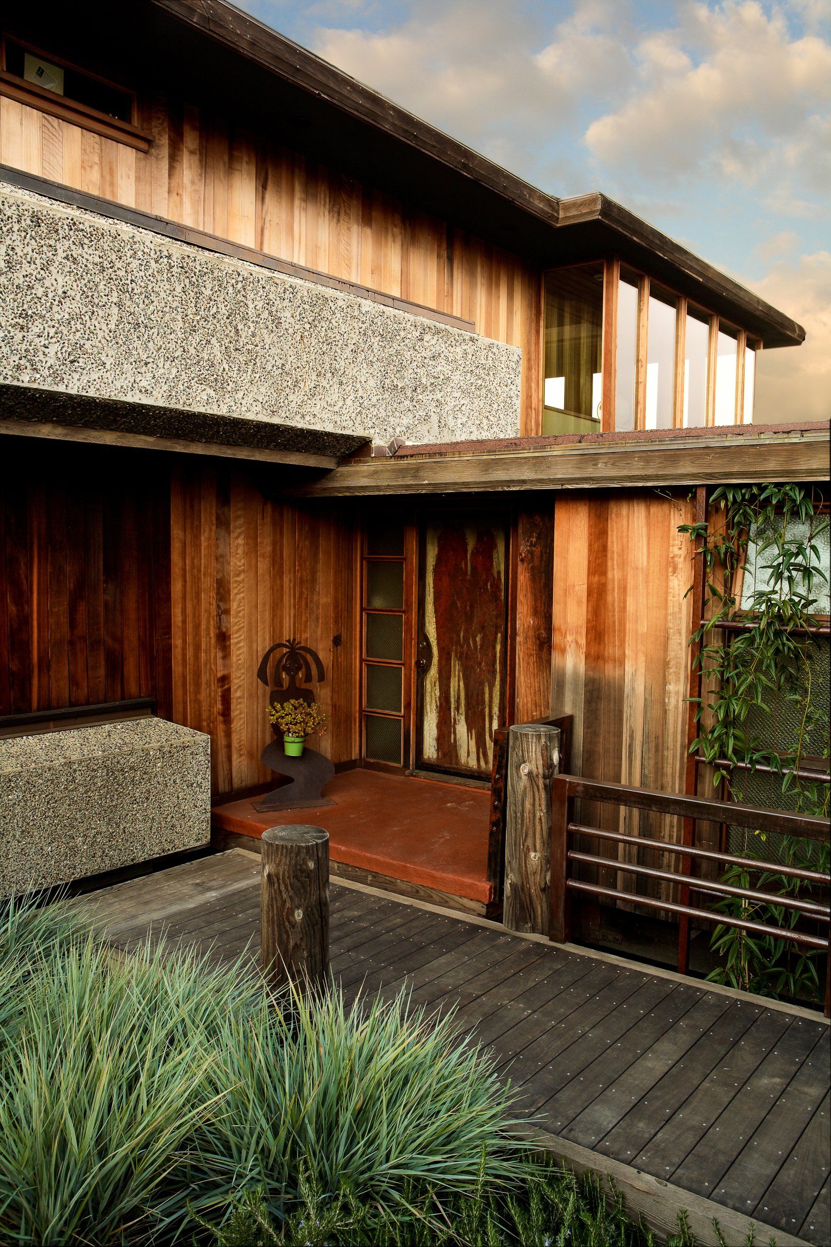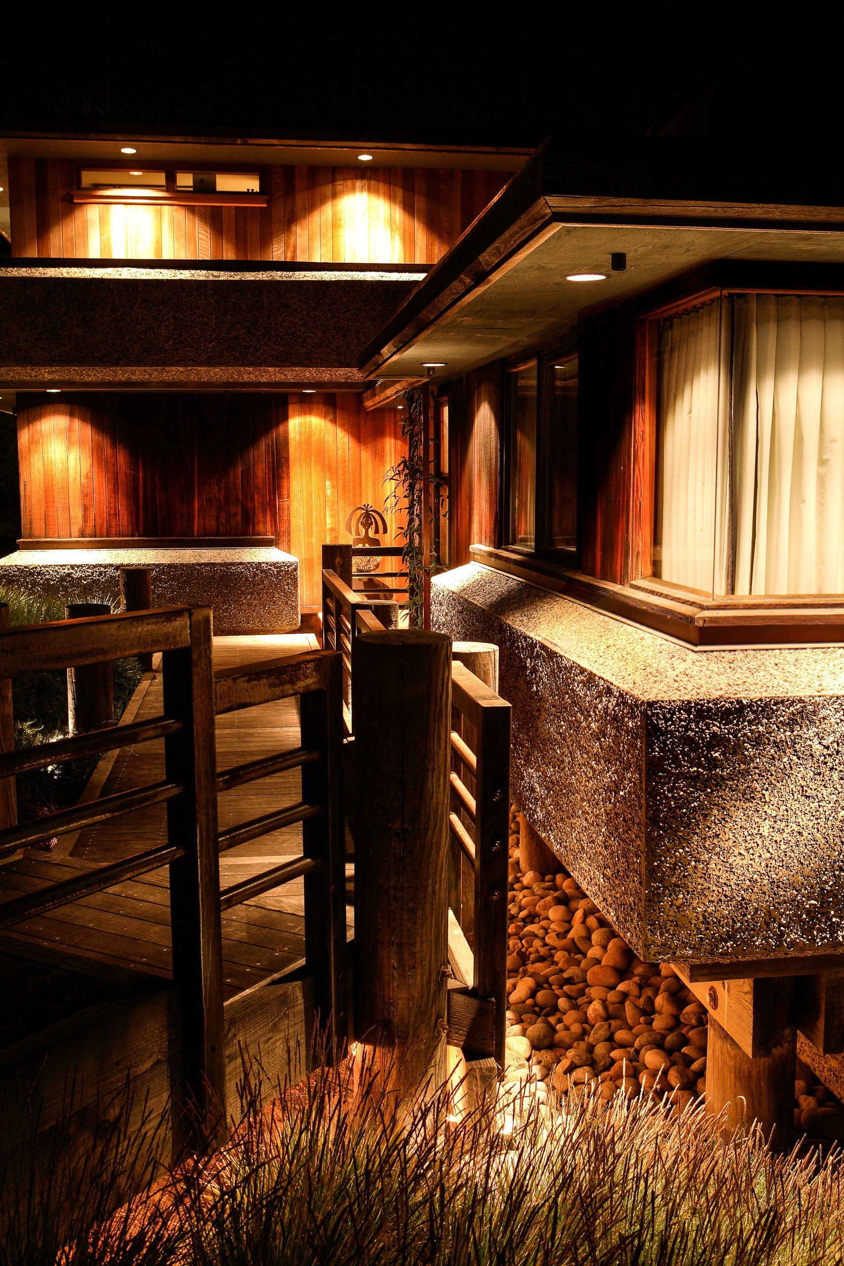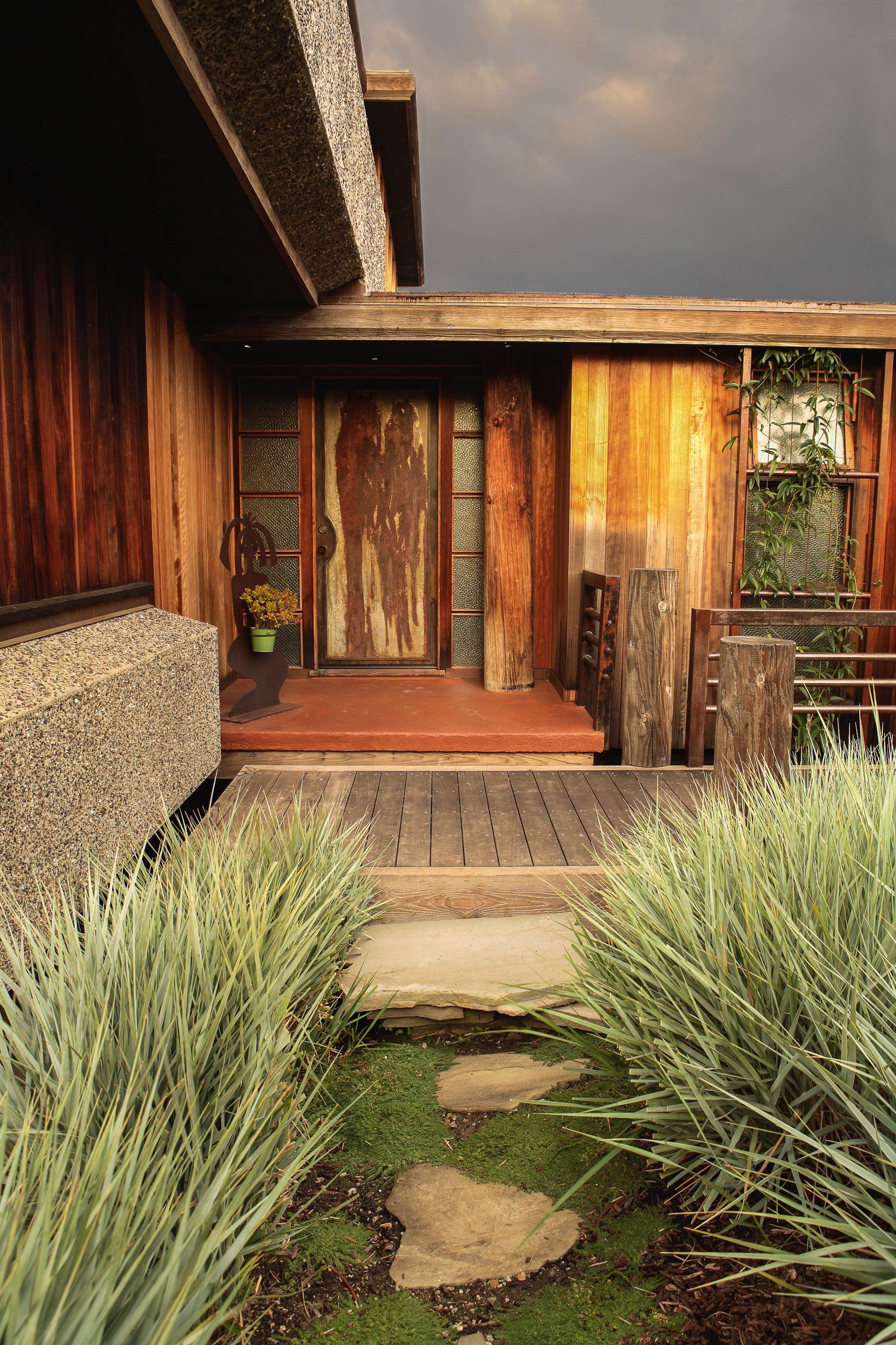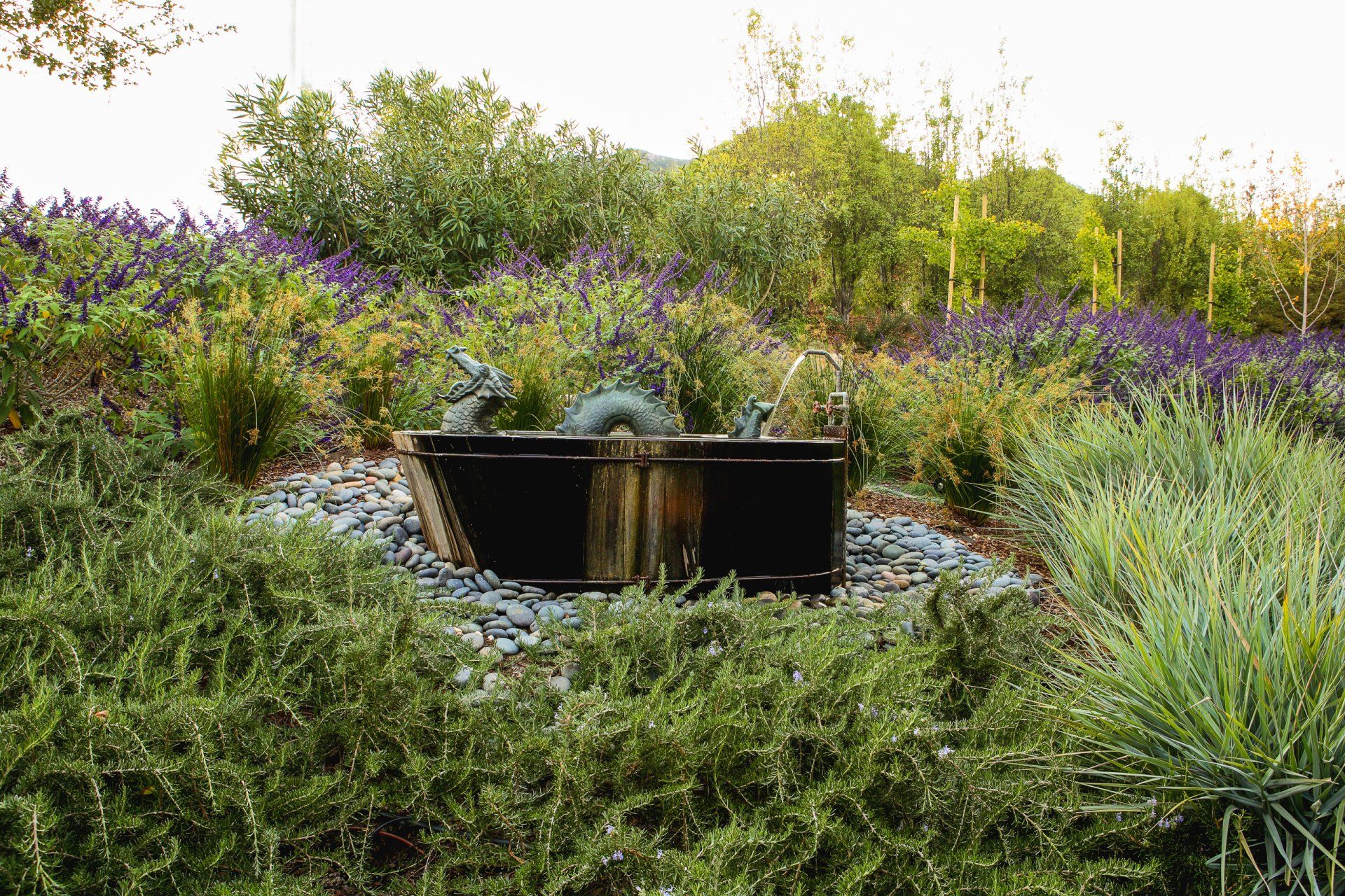 The home’s architecture is further enhanced by a floating deck pathway highlighted by large river rocks to give the illusion that the house floating on site. Midway towards the front door is a water feature utilizing a Japanese Ofuro tub left by the previous homeowners. The new homeowners’ son added a serpent to the tub which brought a whimsical nature to the site. This addition further inspired the planting of rosemary “Boule” which mirrors the structure and texture of the serpent.