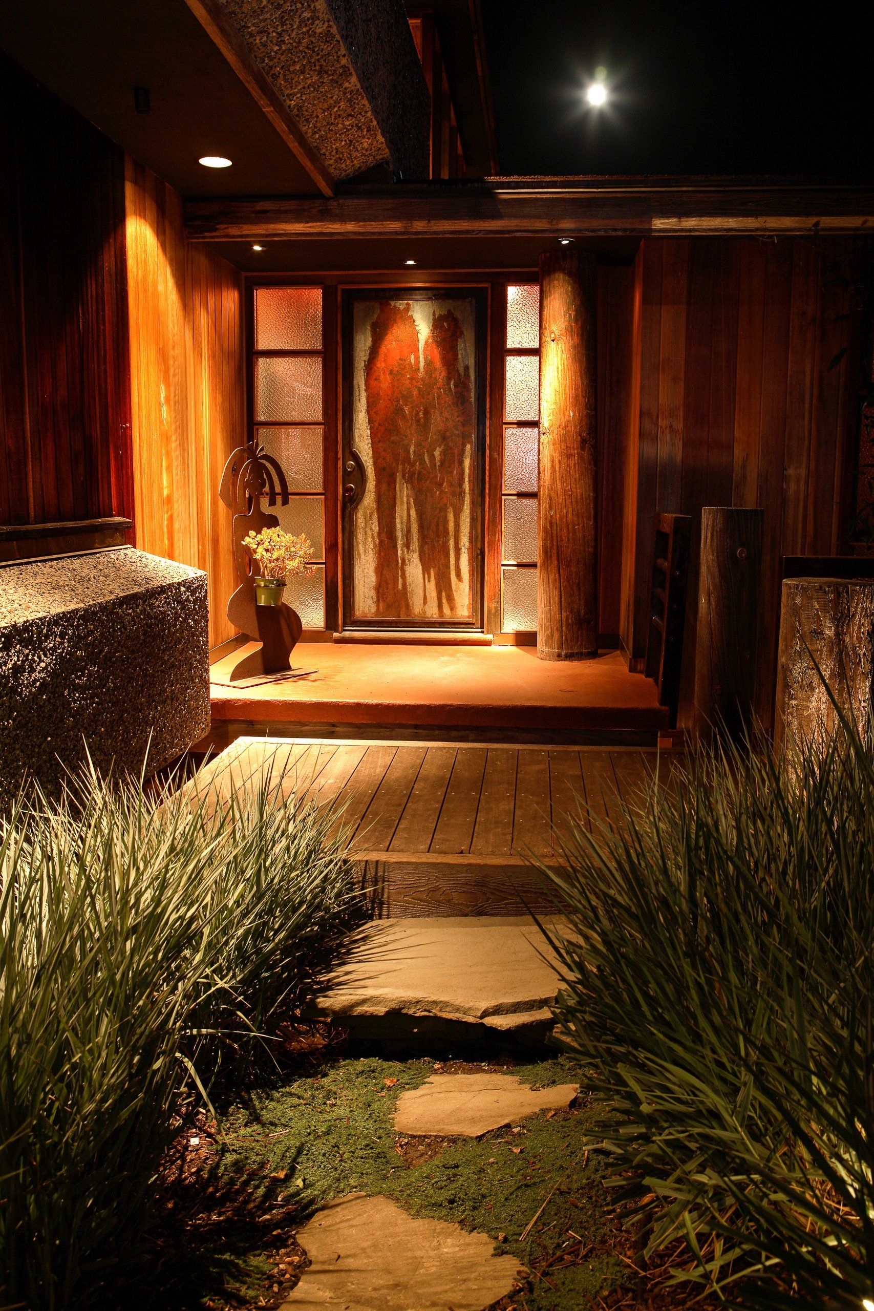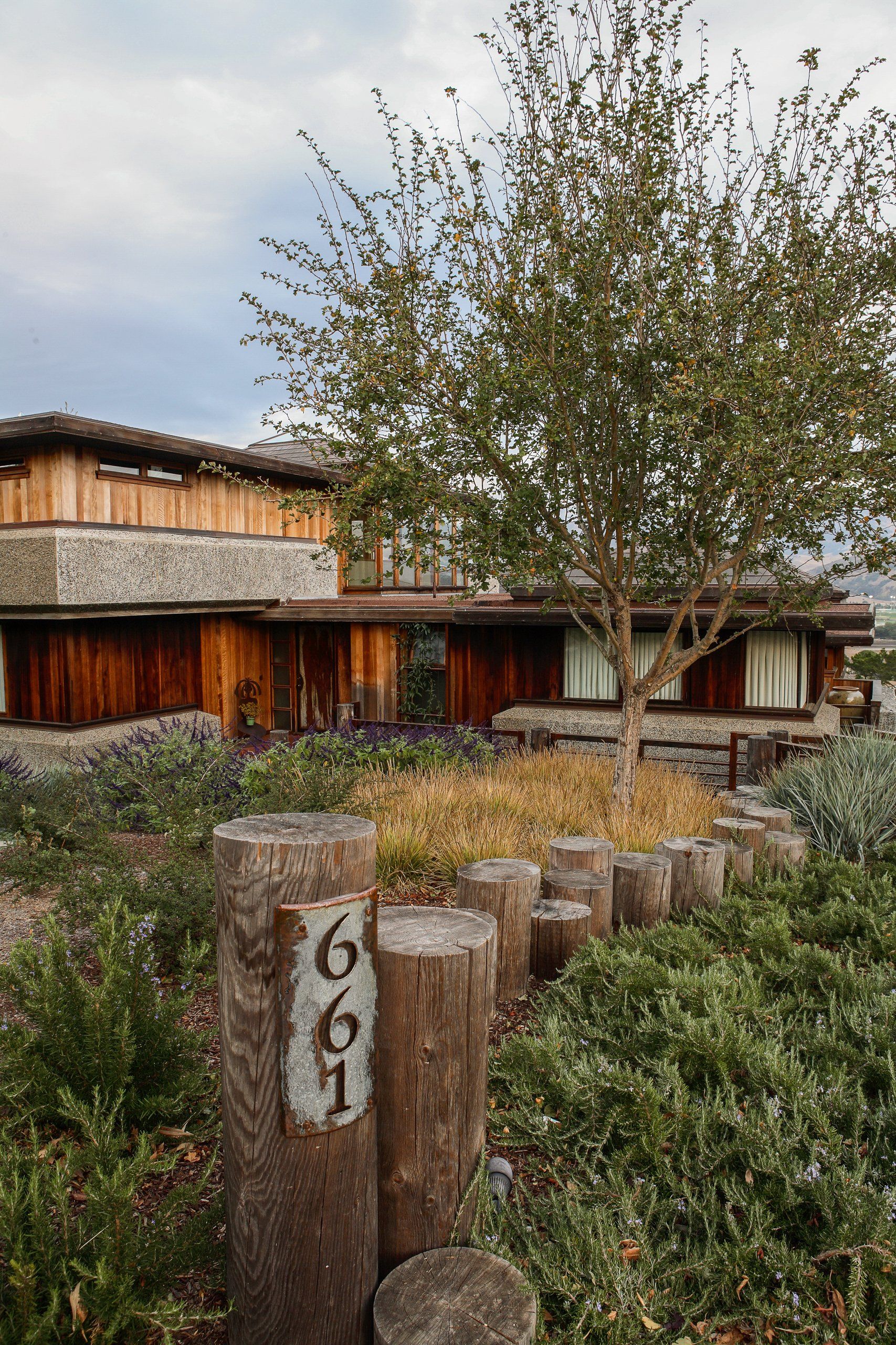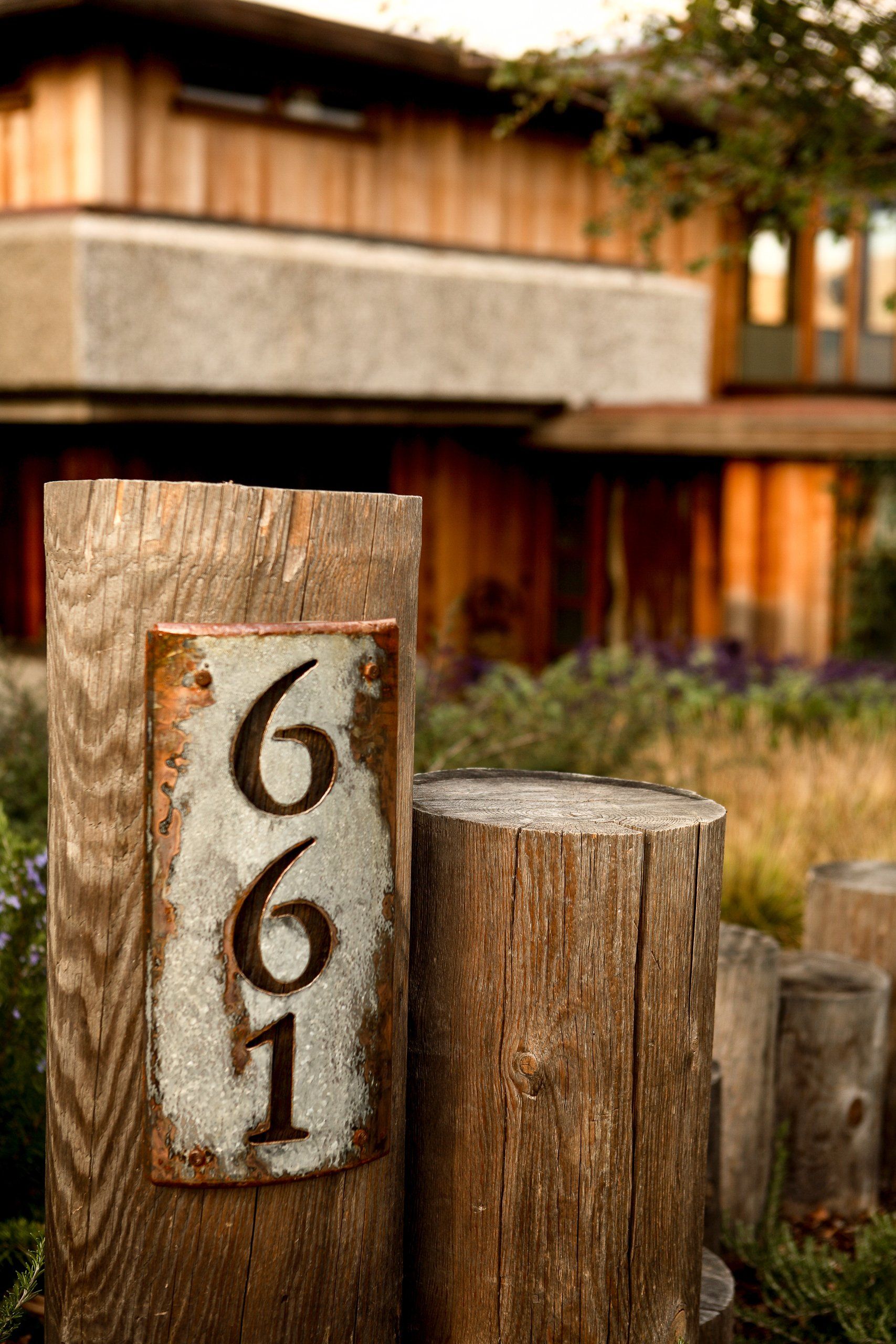 As the home had lost its distinguishing characteristics, the landscape redesign took its cue from the architecture by using the lodge poles as a way finder to the front door. The lodge poles begin at the street with the largest pole highlighting the custom crafted steel house numbers that become back-lit in the evening.