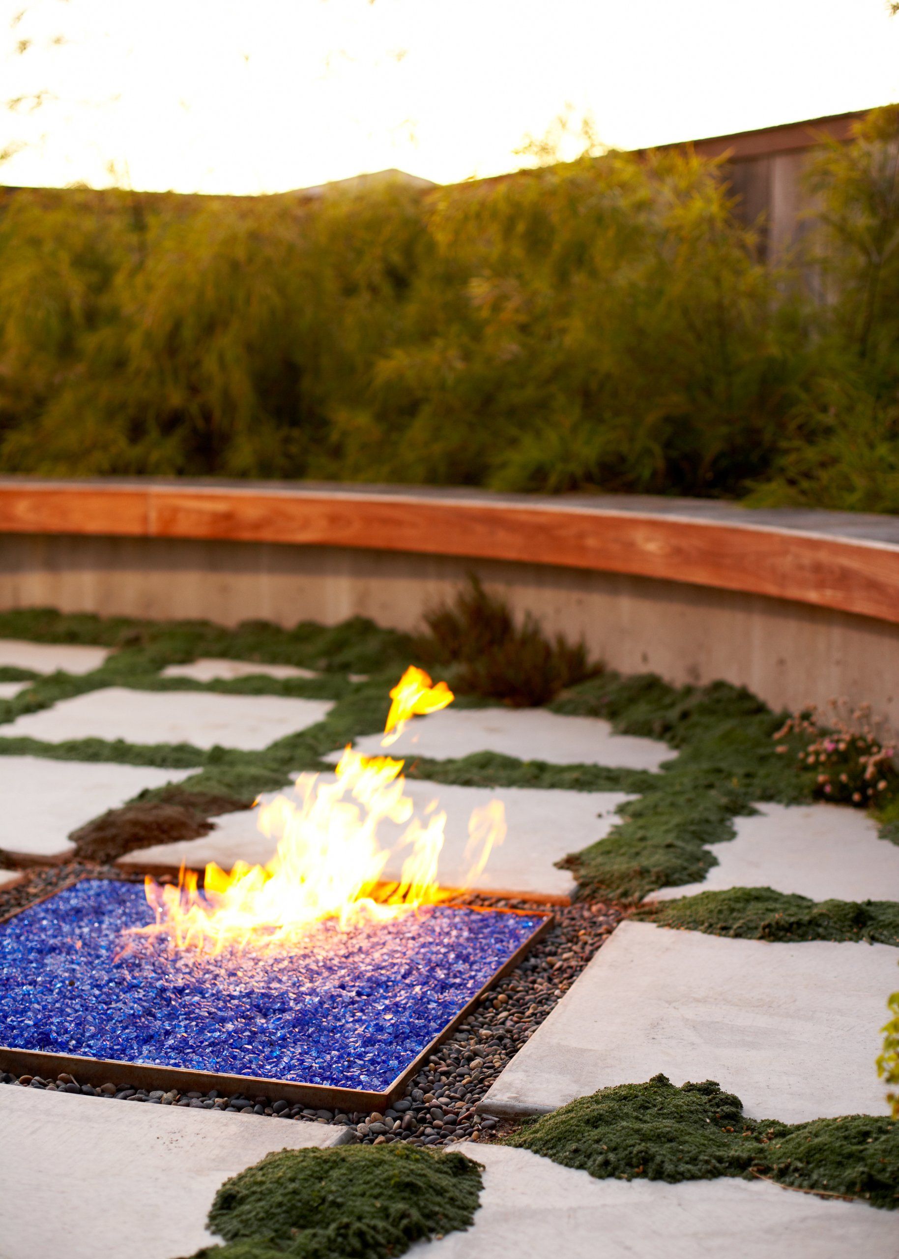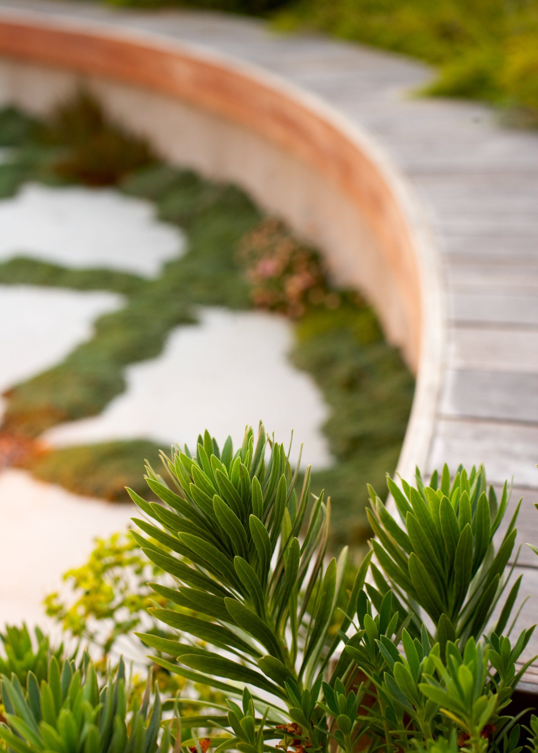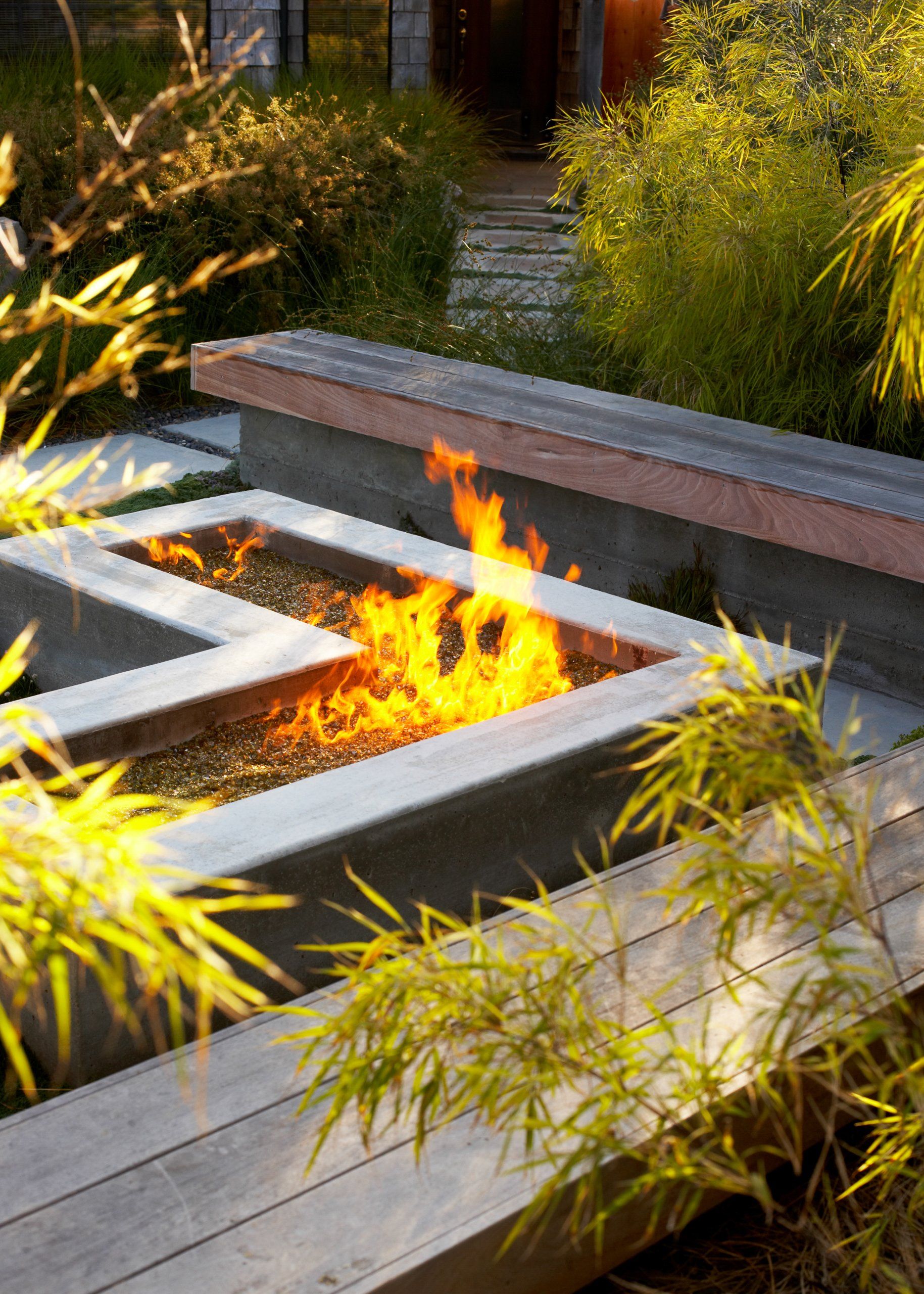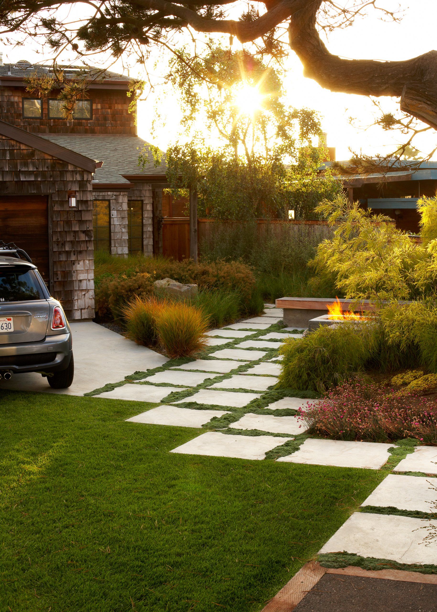 A lush garden seating room equipped with a fire pit was designed in the front yard utilize an often untapped outdoor space. Using the house as a powerful windbreak from the Pacific winds, this gave the clients more options for outdoor entertainment on windy days.