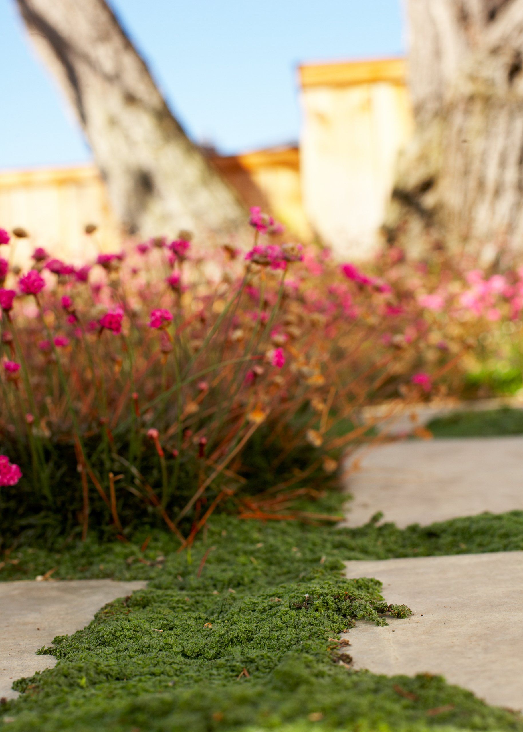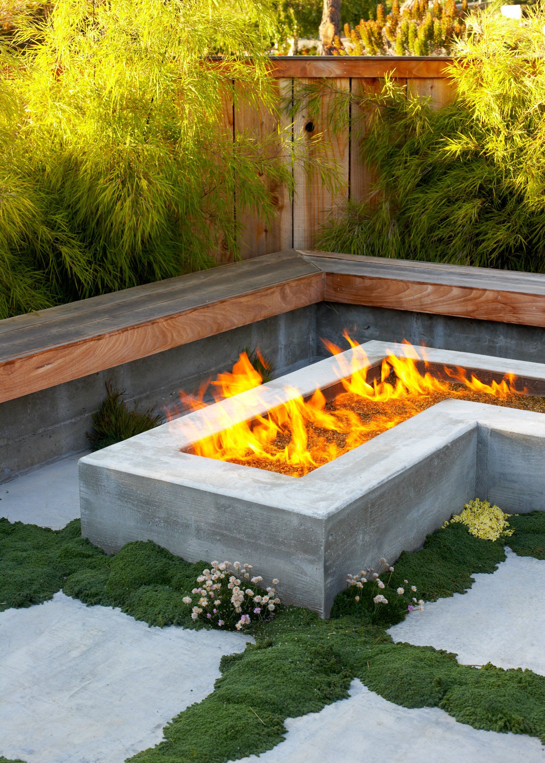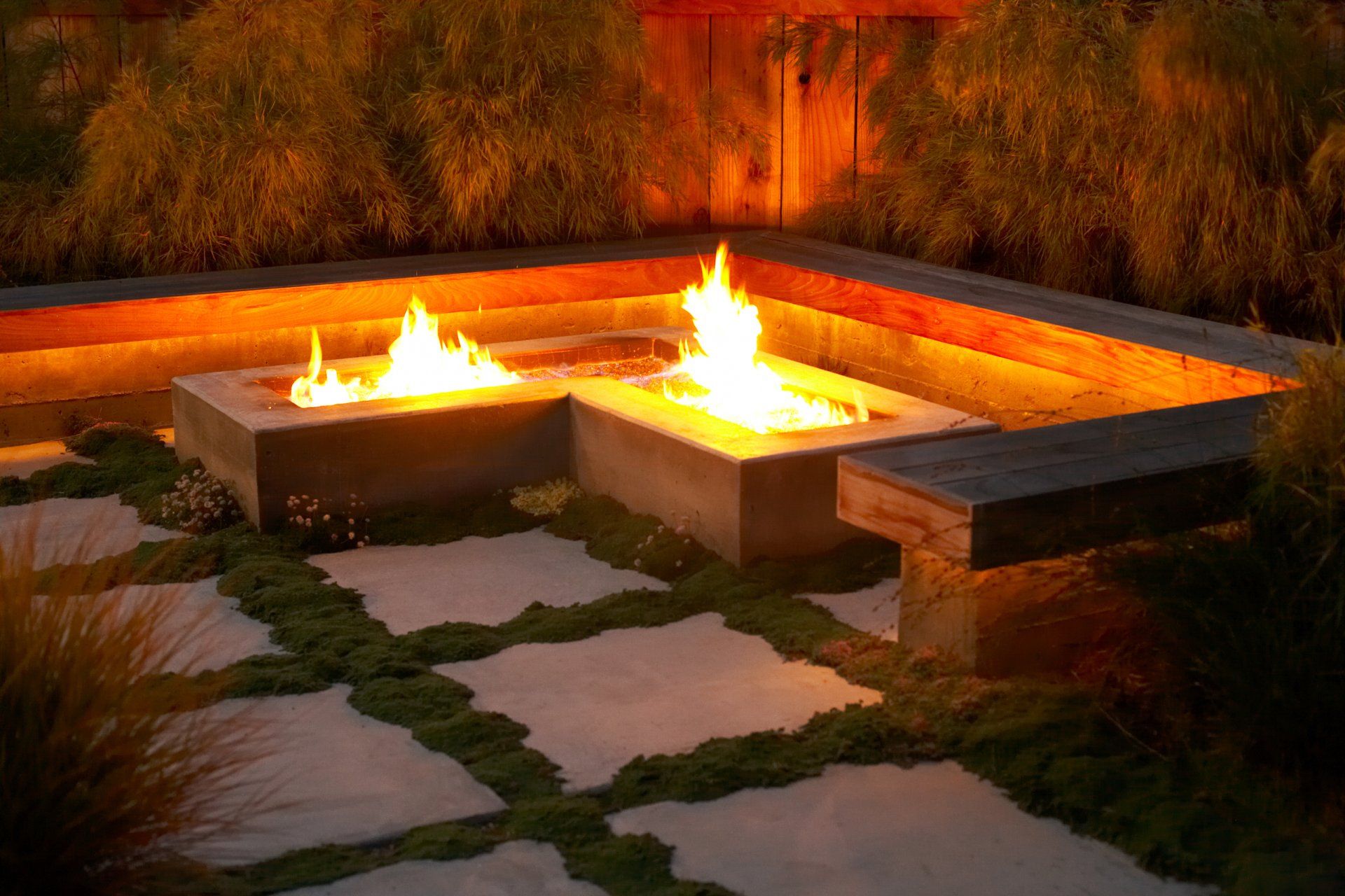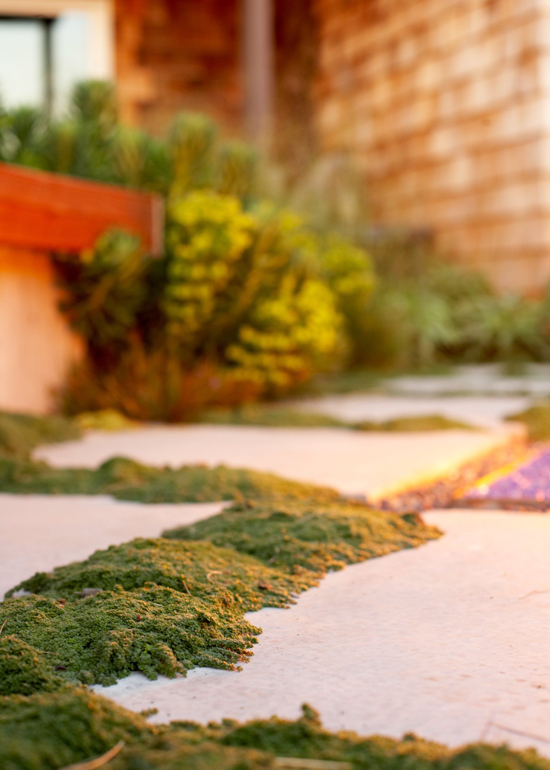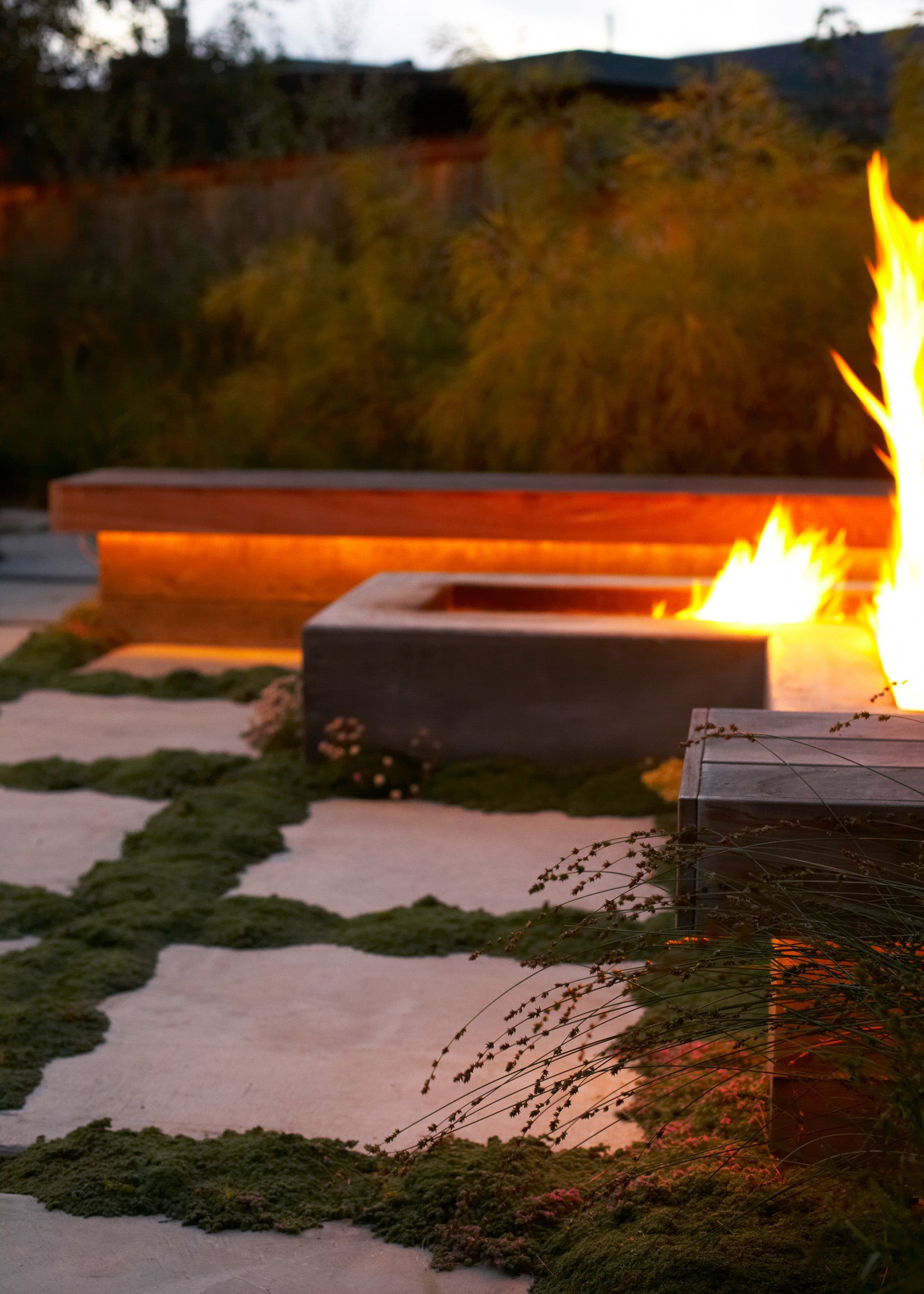 A lush garden seating room equipped with a fire pit was designed in the front yard utilize an often untapped outdoor space. Using the house as a powerful windbreak from the Pacific winds, this gave the clients more options for outdoor entertainment on windy days.