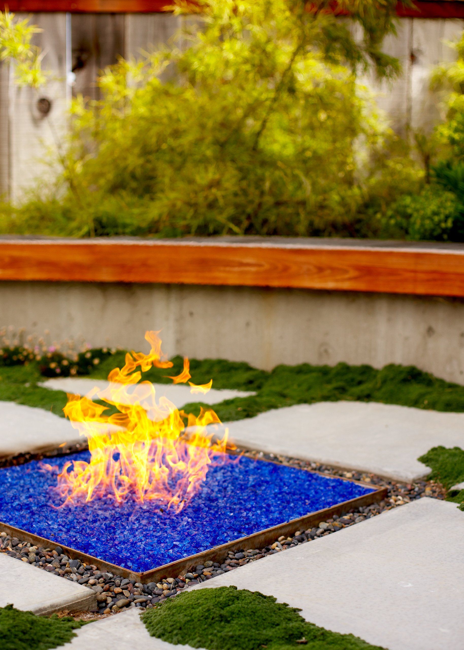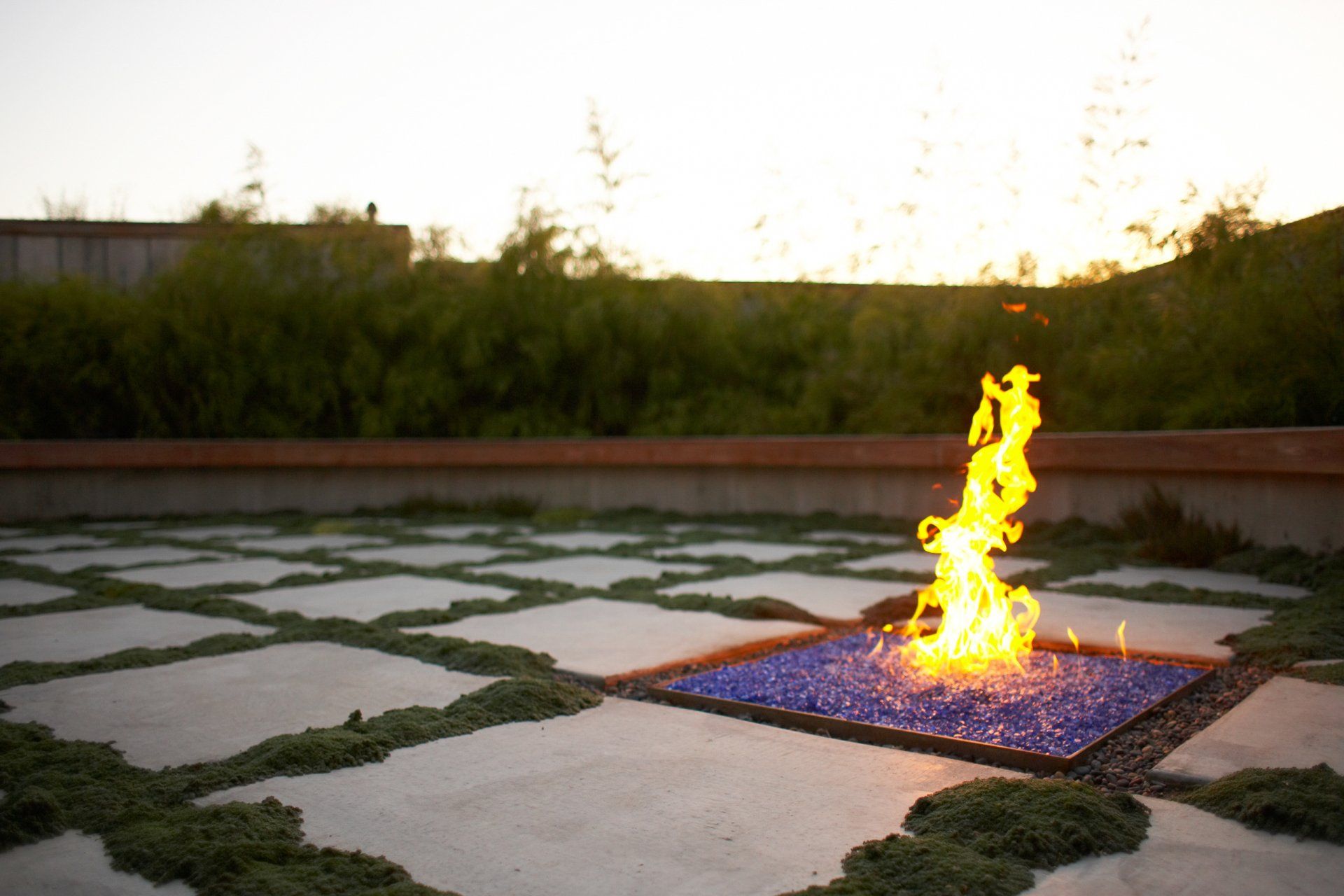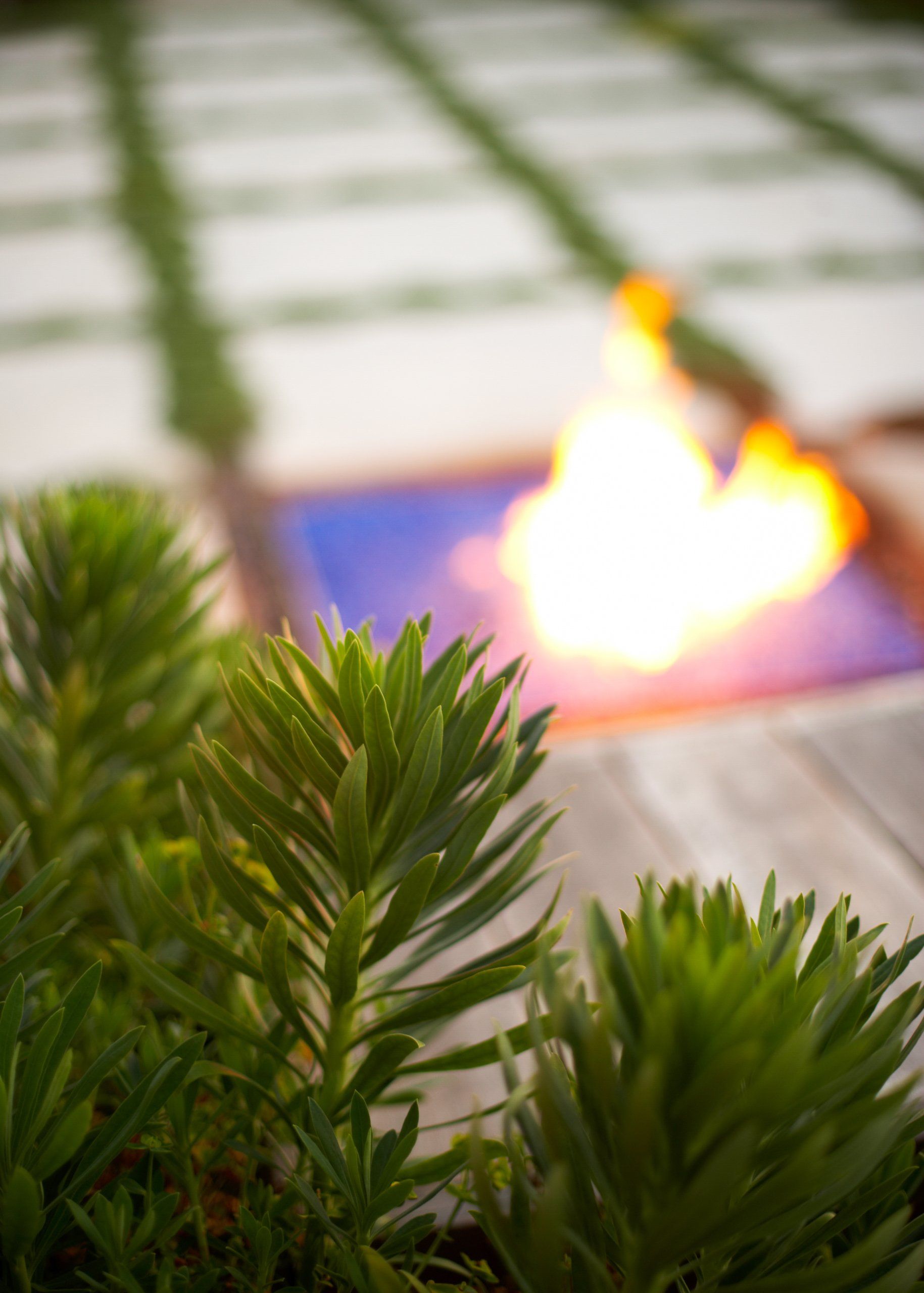 In the back of the house, a hot tub was installed with a spilling water feature across from a vibrant at-grade fire pit creating 2 focal points that carry one’s eye across the garden. These 2 design features also provide a visual play between the juxtaposing elements of fire and water.