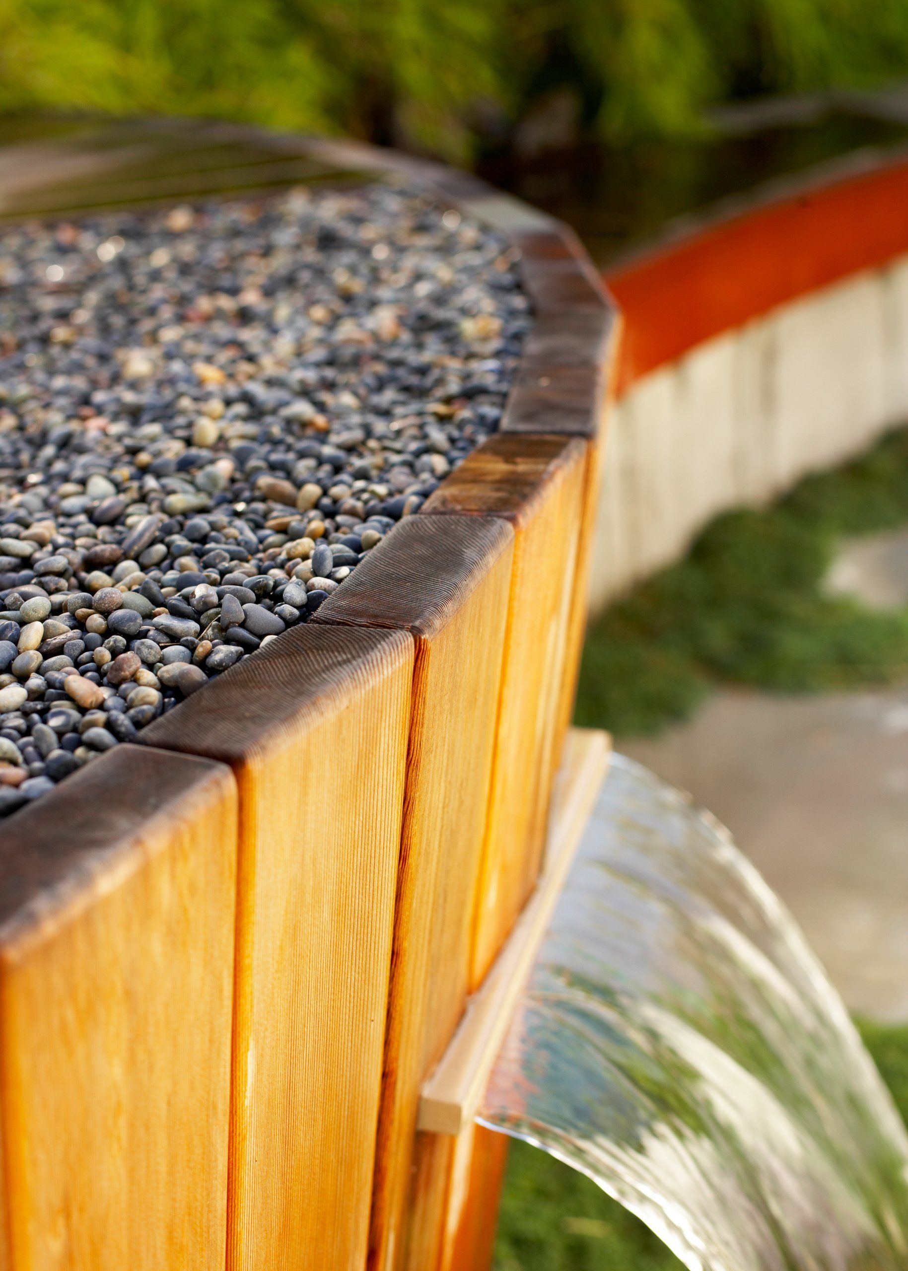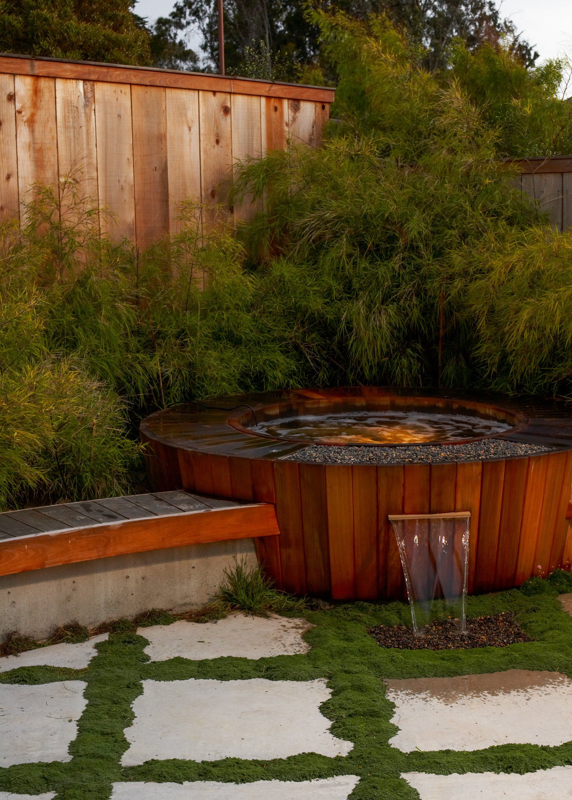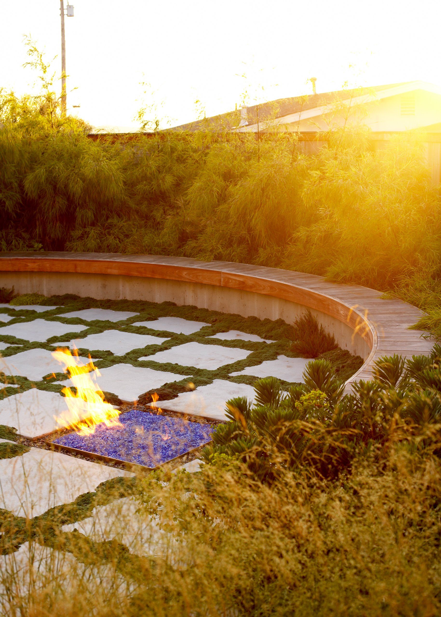 The patio is encircled by as ipe bench banded by a lush ring of Mexican Weeping Bamboo, disguising property line fences and providing guests with a cozy private feel.