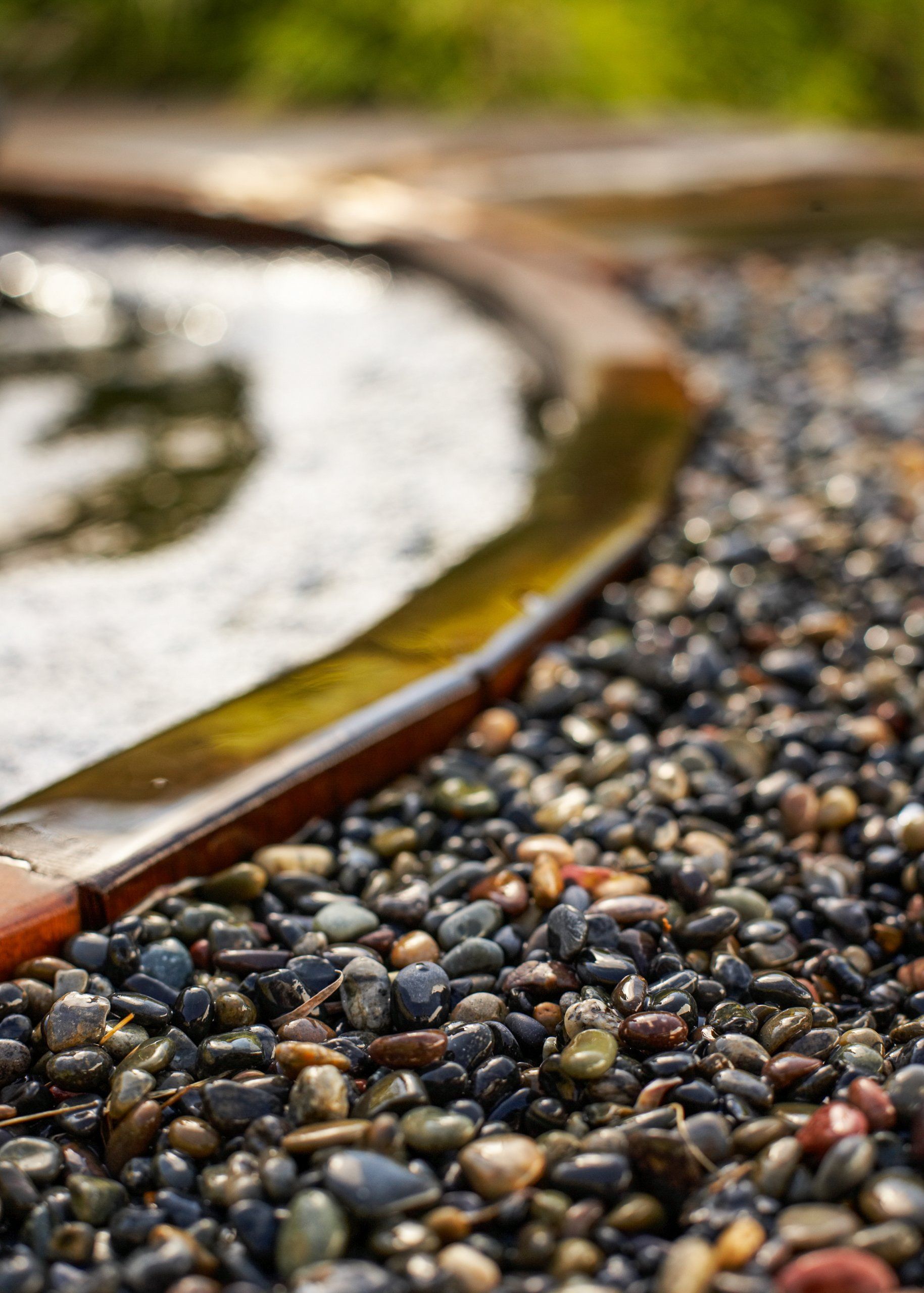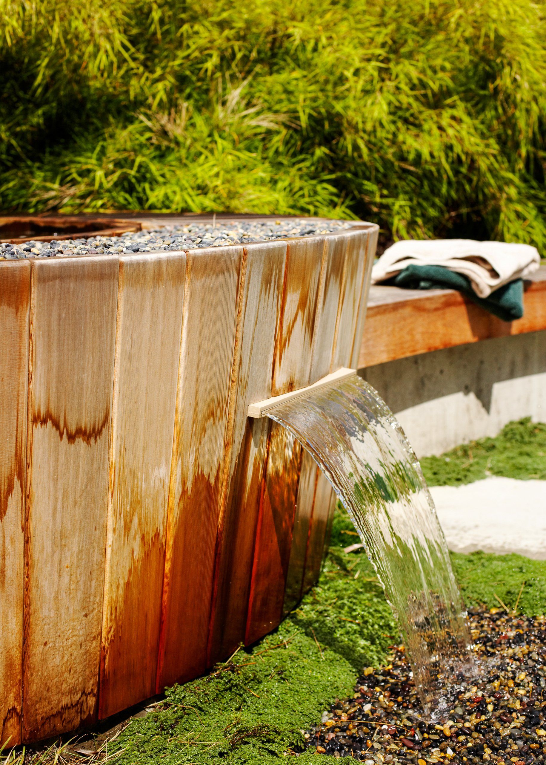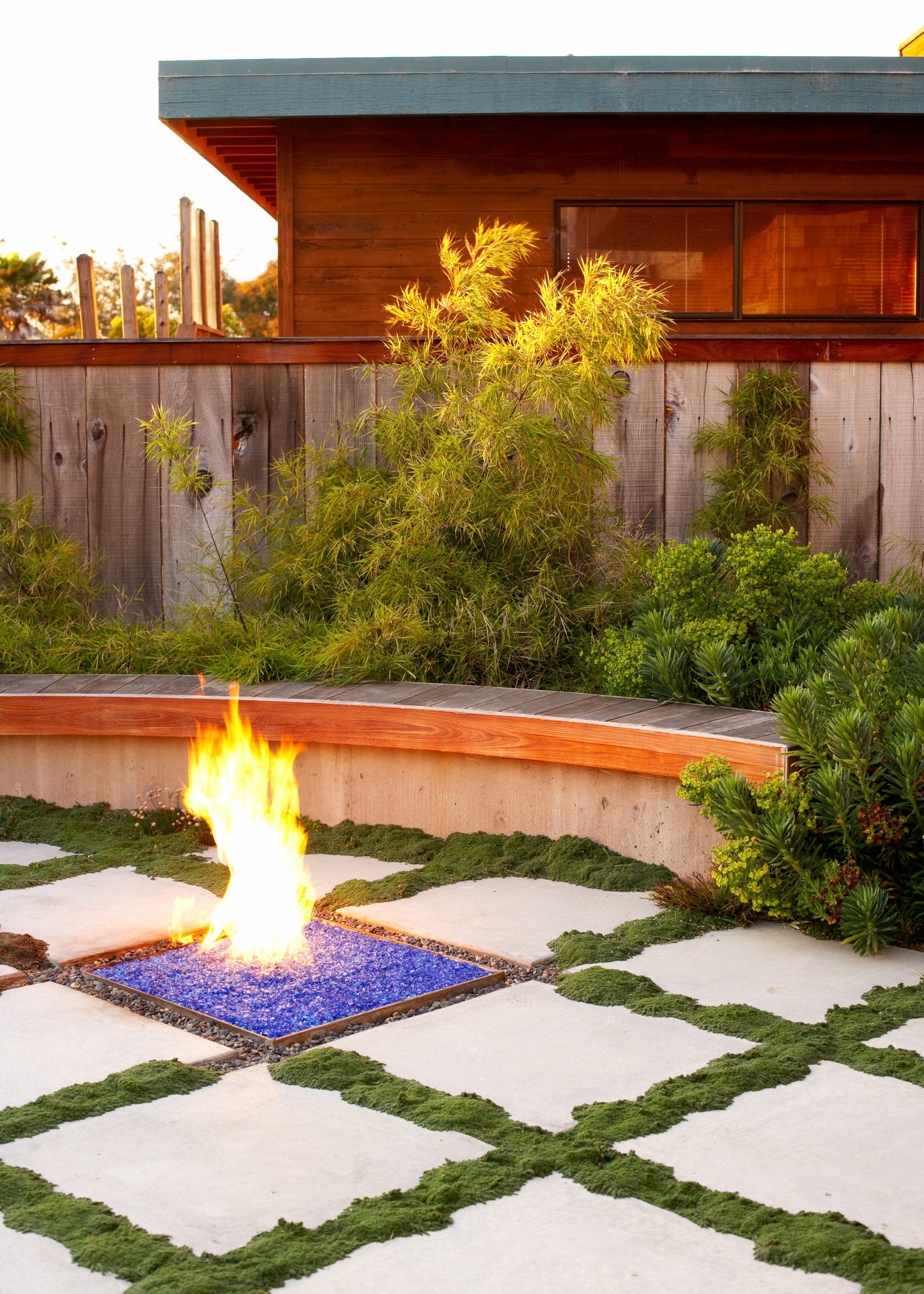The patio is encircled by as ipe bench banded by a lush ring of Mexican Weeping Bamboo, disguising property line fences and providing guests with a cozy private feel.