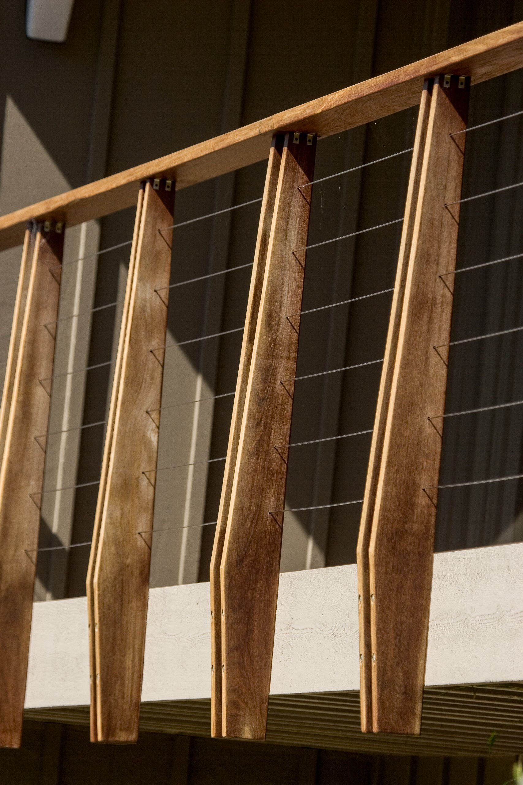 These entry steps were designed as a playful twist on the horizontal lines of the home. Further playing on the house’s horizontal lines, the balcony was redesigned in a Brazilian hardwood with cable railing unifying the house to the Ipe wood screen near the street.