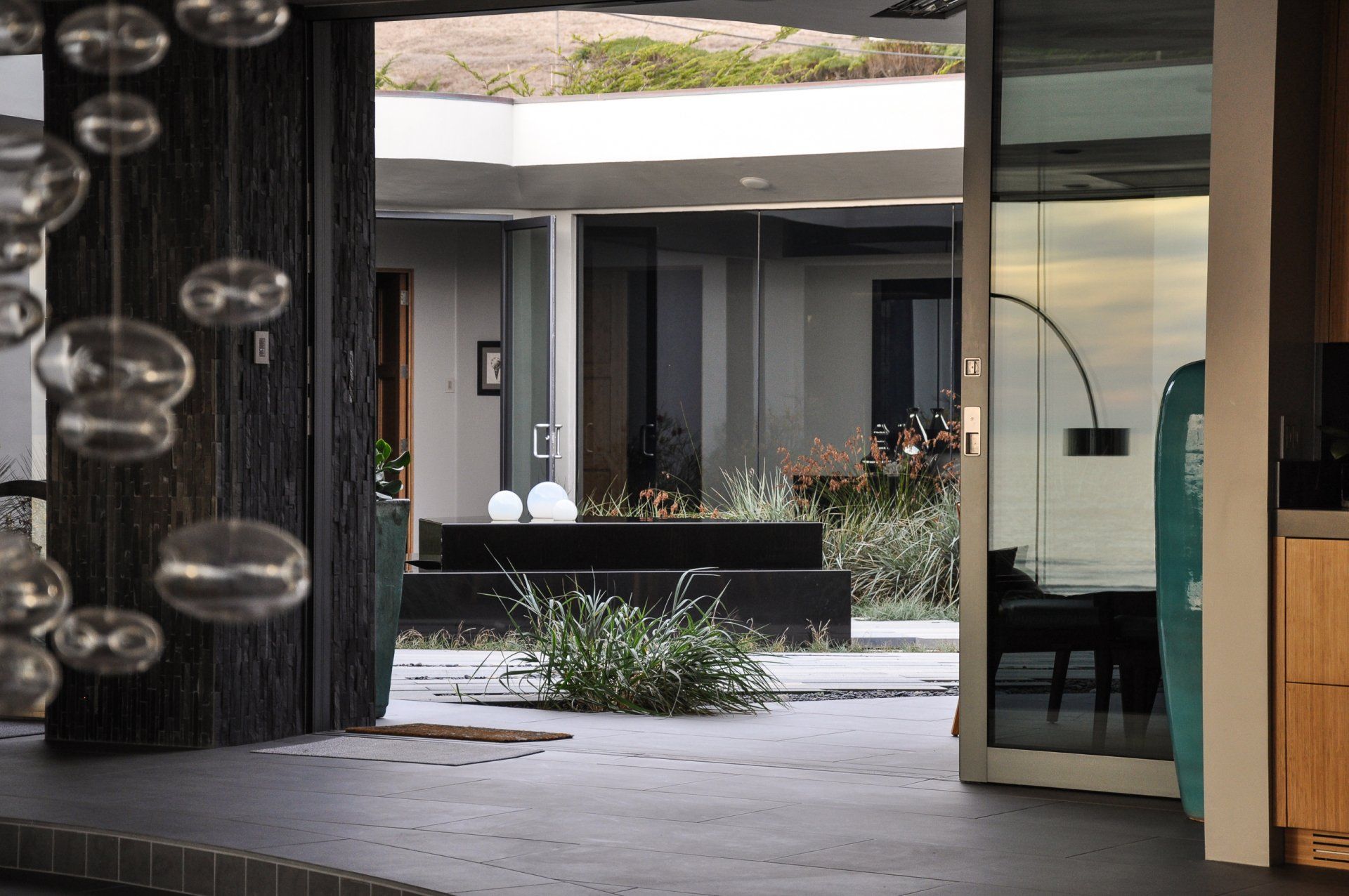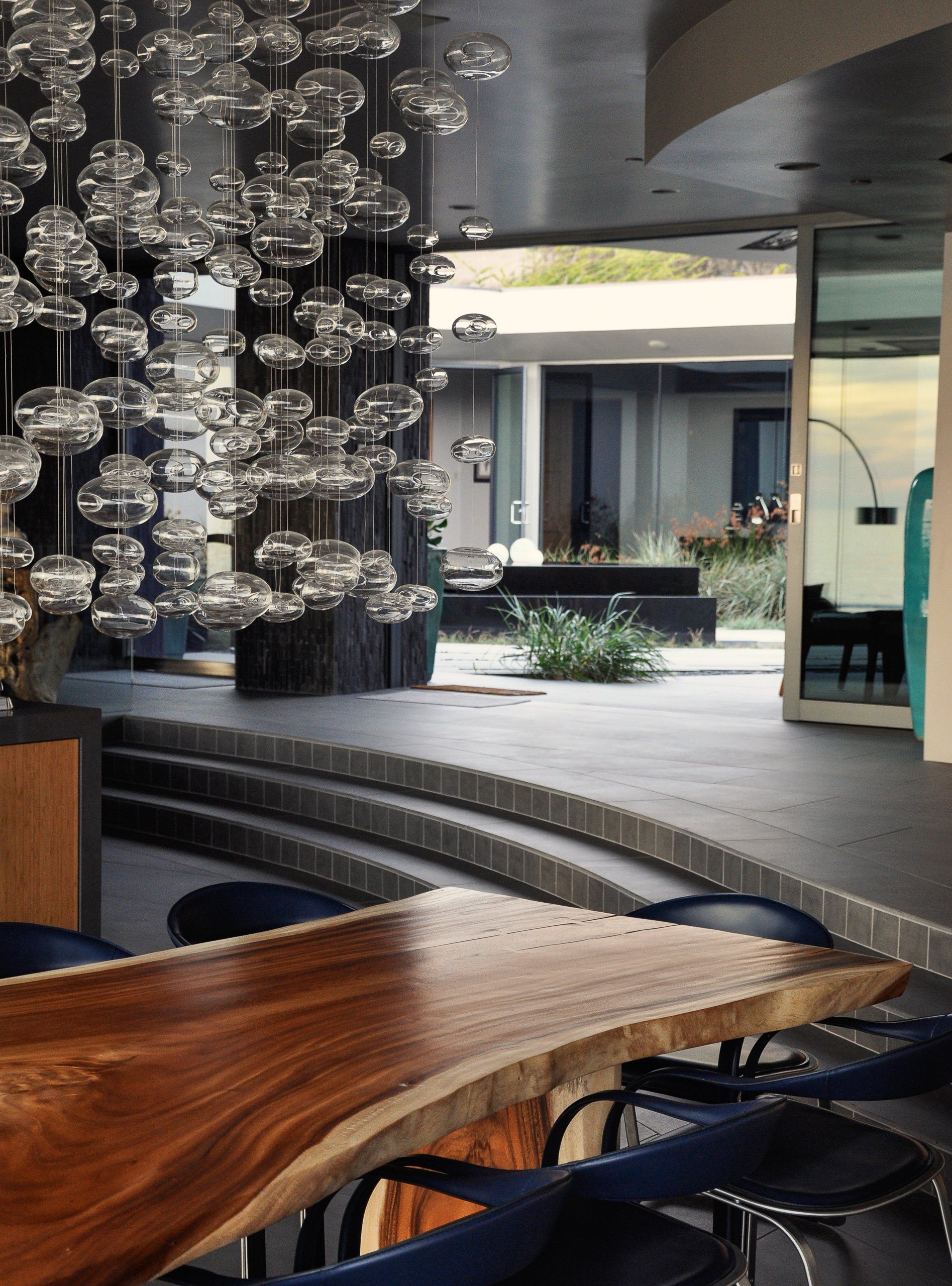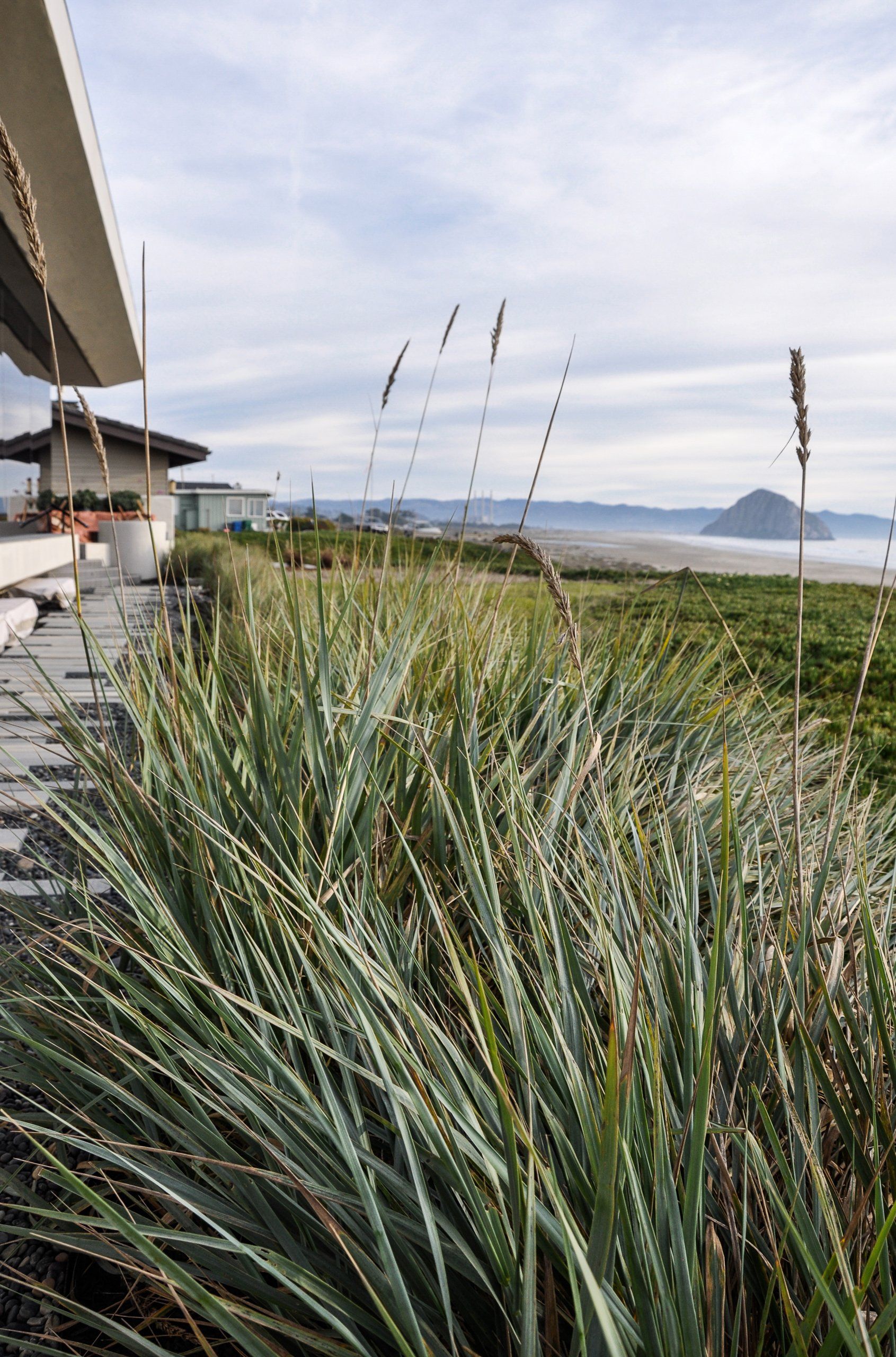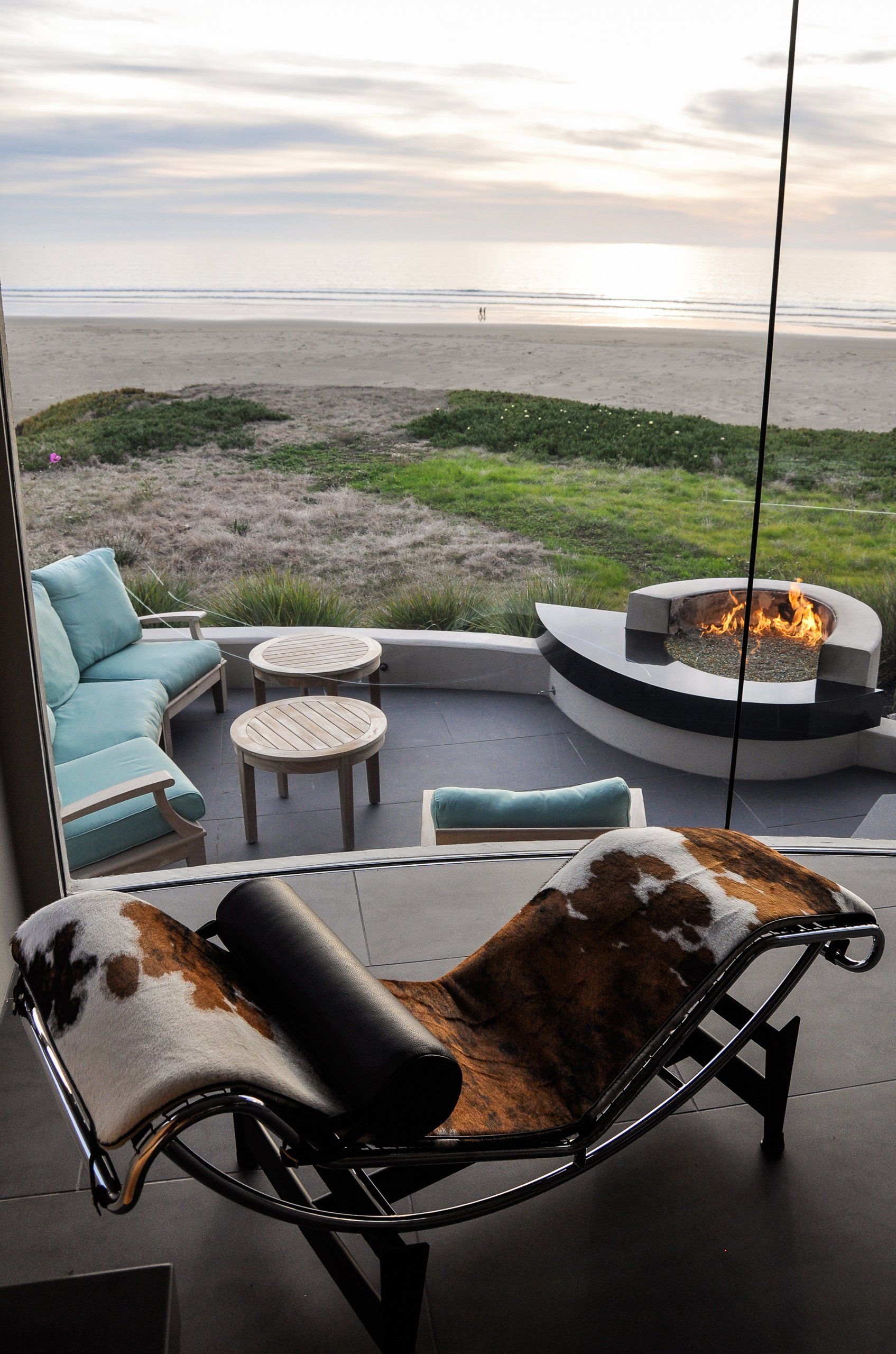 Glass walls all collapse back making a true indoor-outdoor experience that is softened by flowing beach grasses and beach pebbles of different sizes.