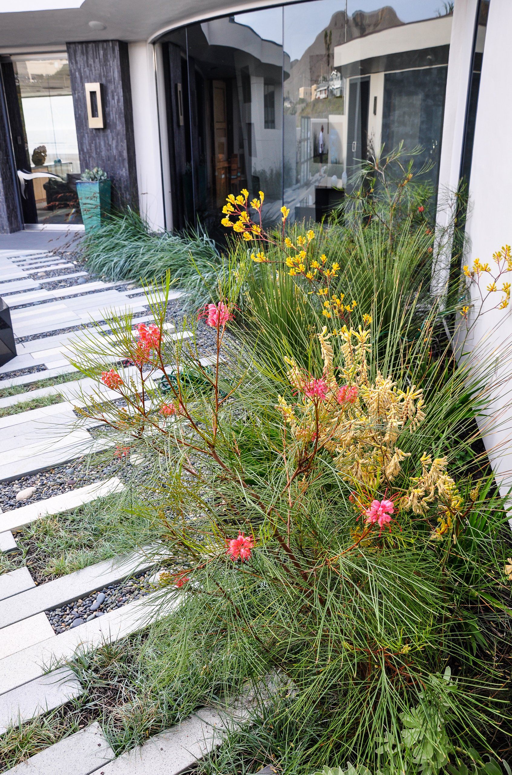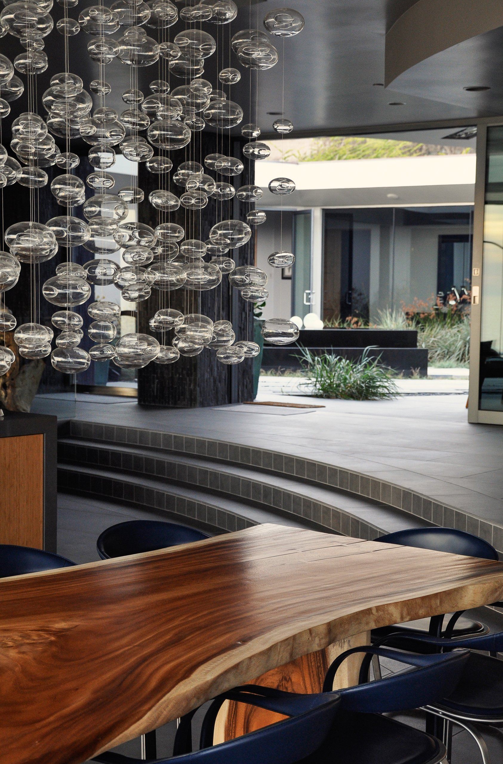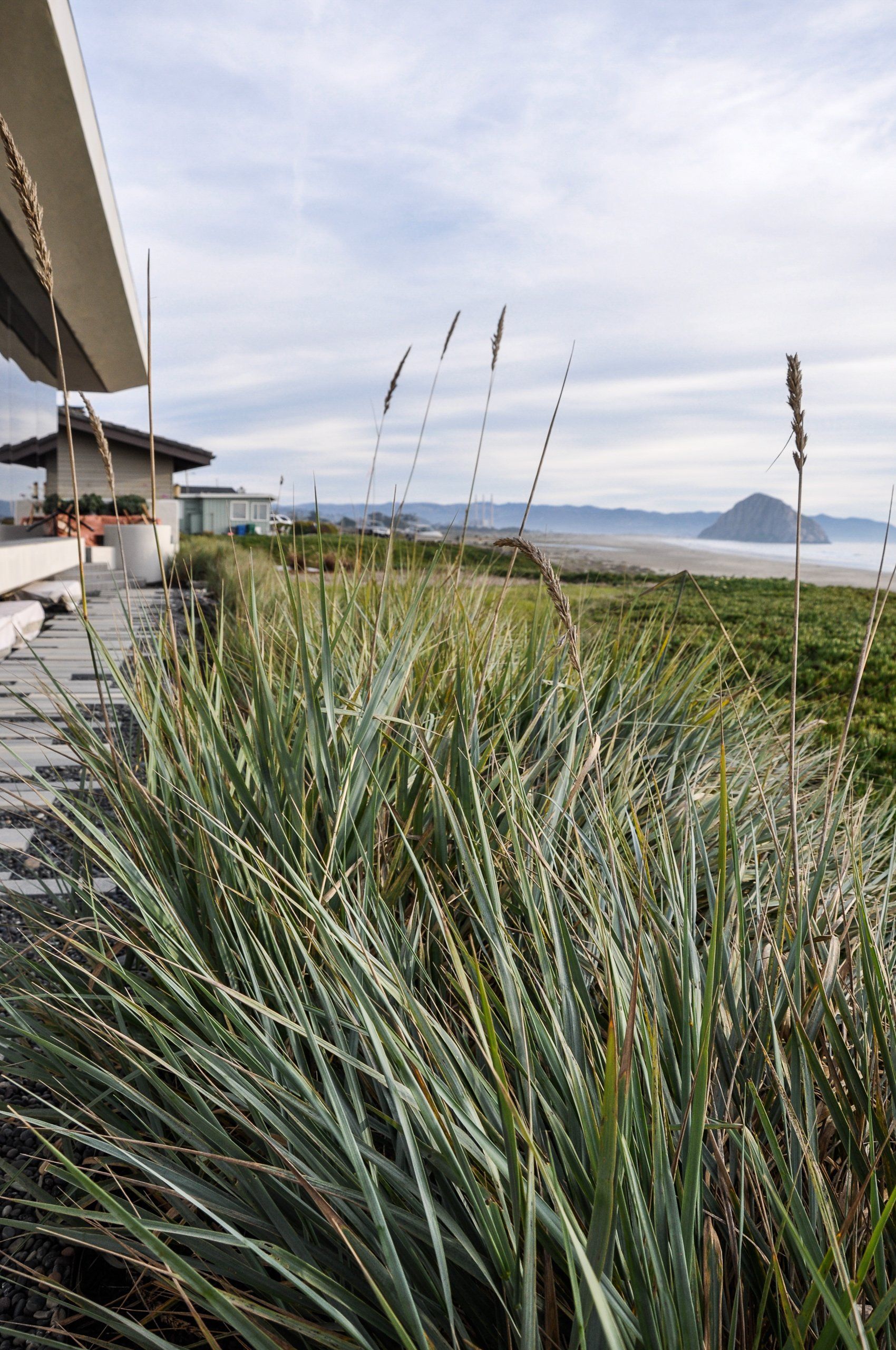 Glass walls all collapse back making a true indoor-outdoor experience that is softened by flowing beach grasses and beach pebbles of different sizes.