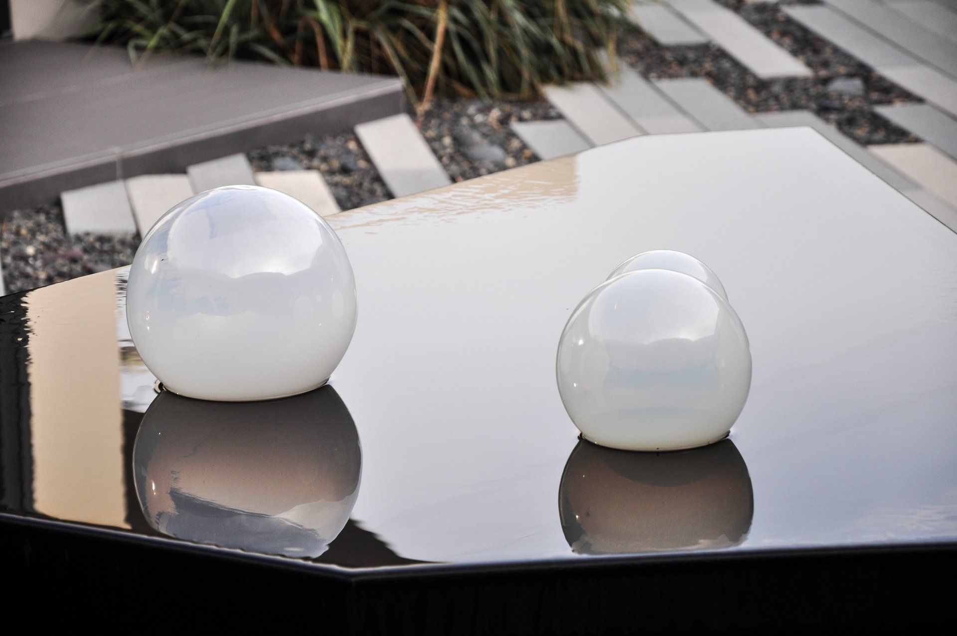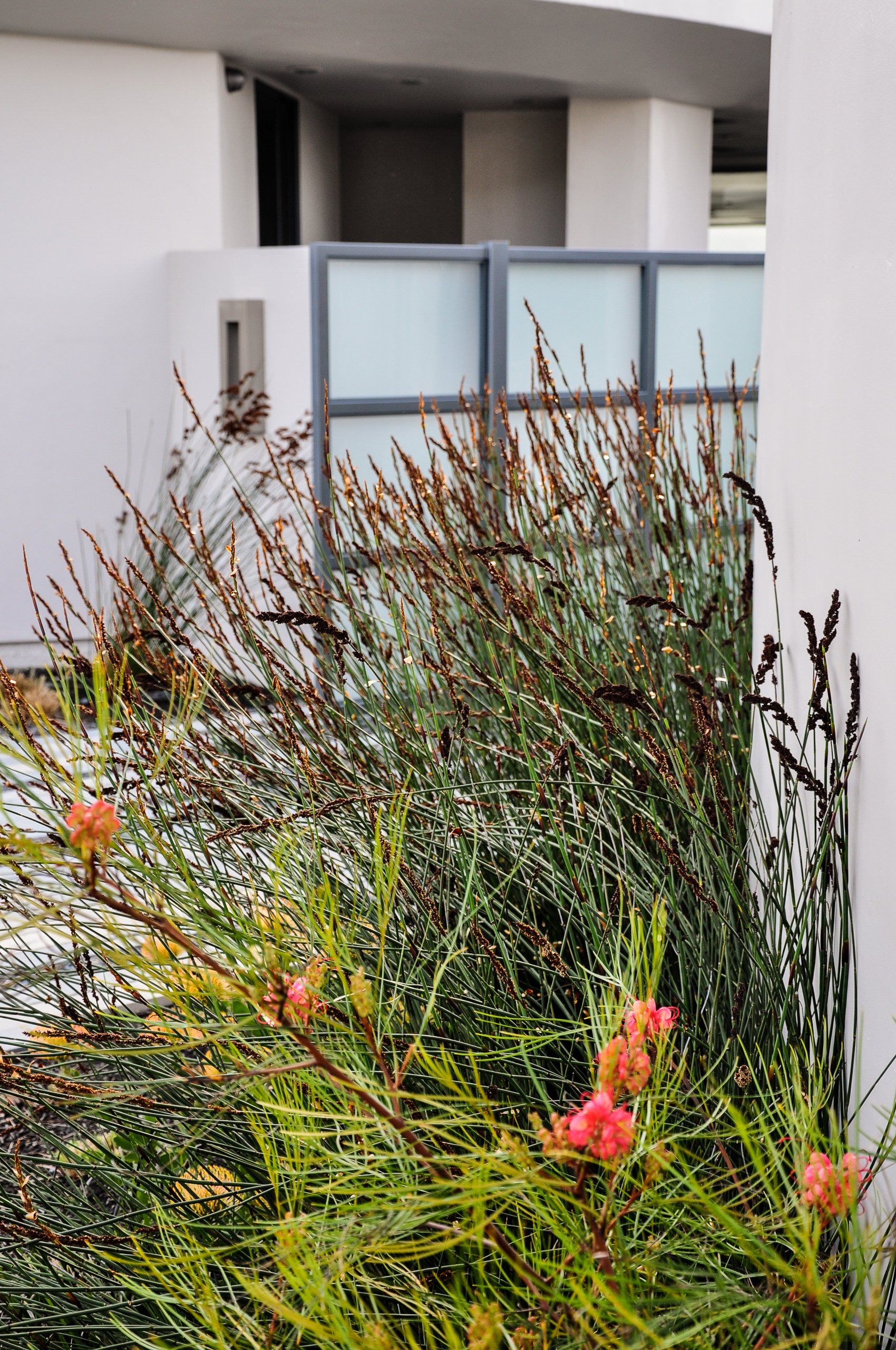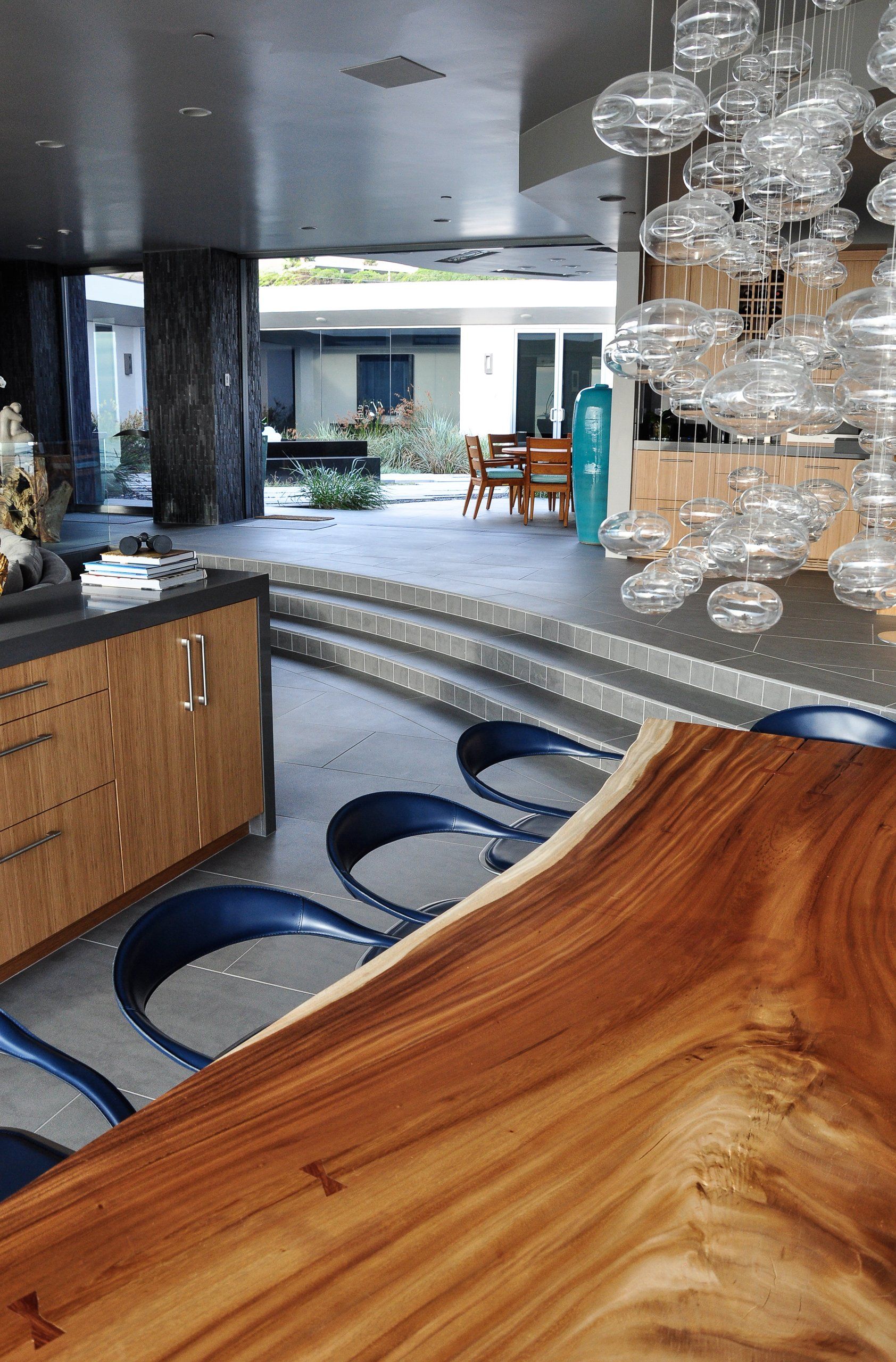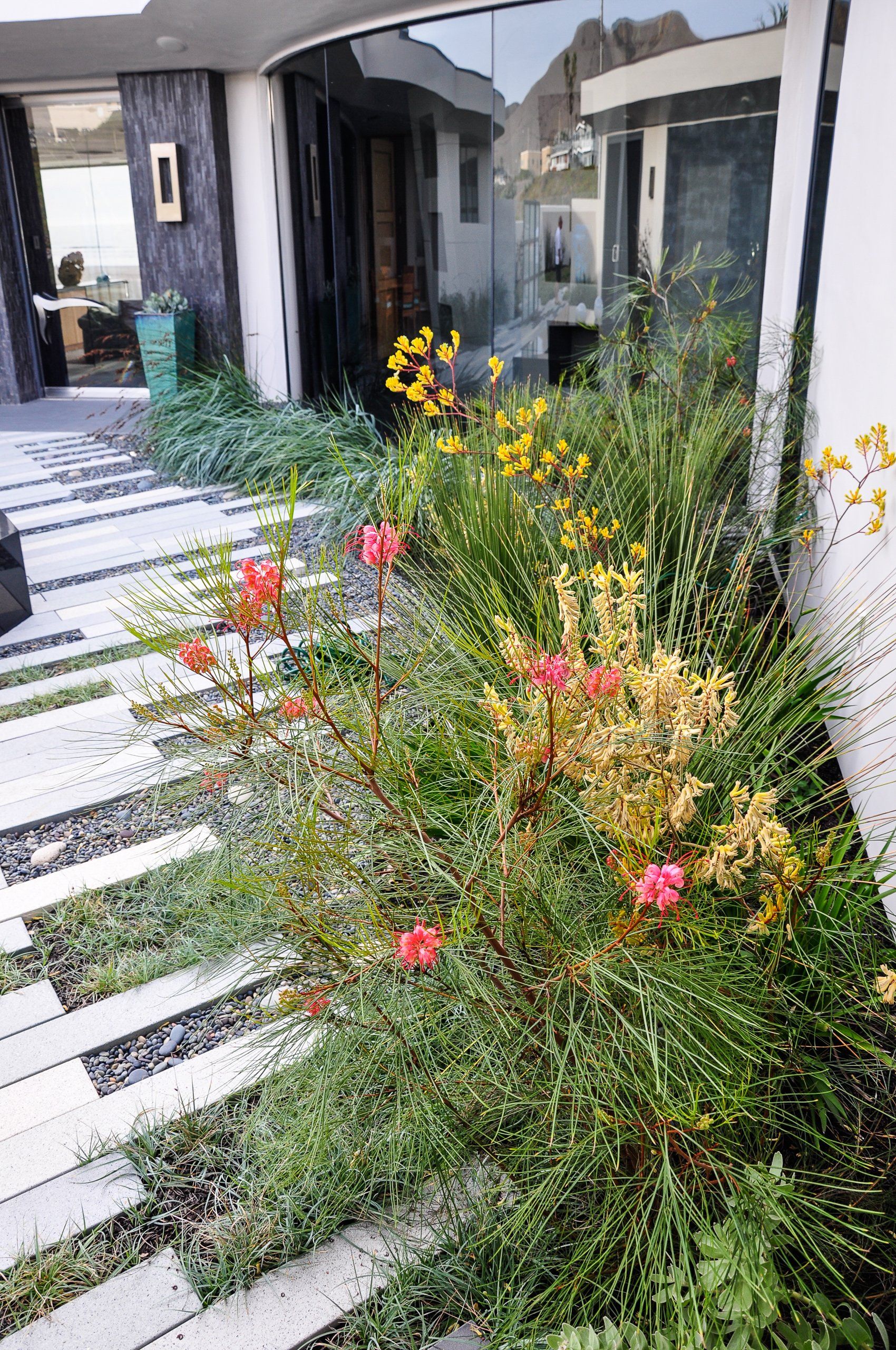 Glass walls all collapse back making a true indoor-outdoor experience that is softened by flowing beach grasses and beach pebbles of different sizes.