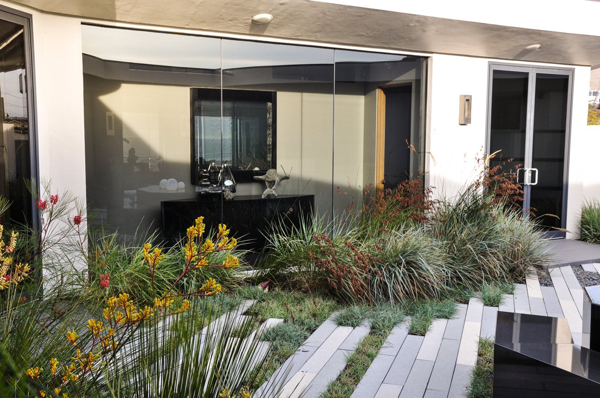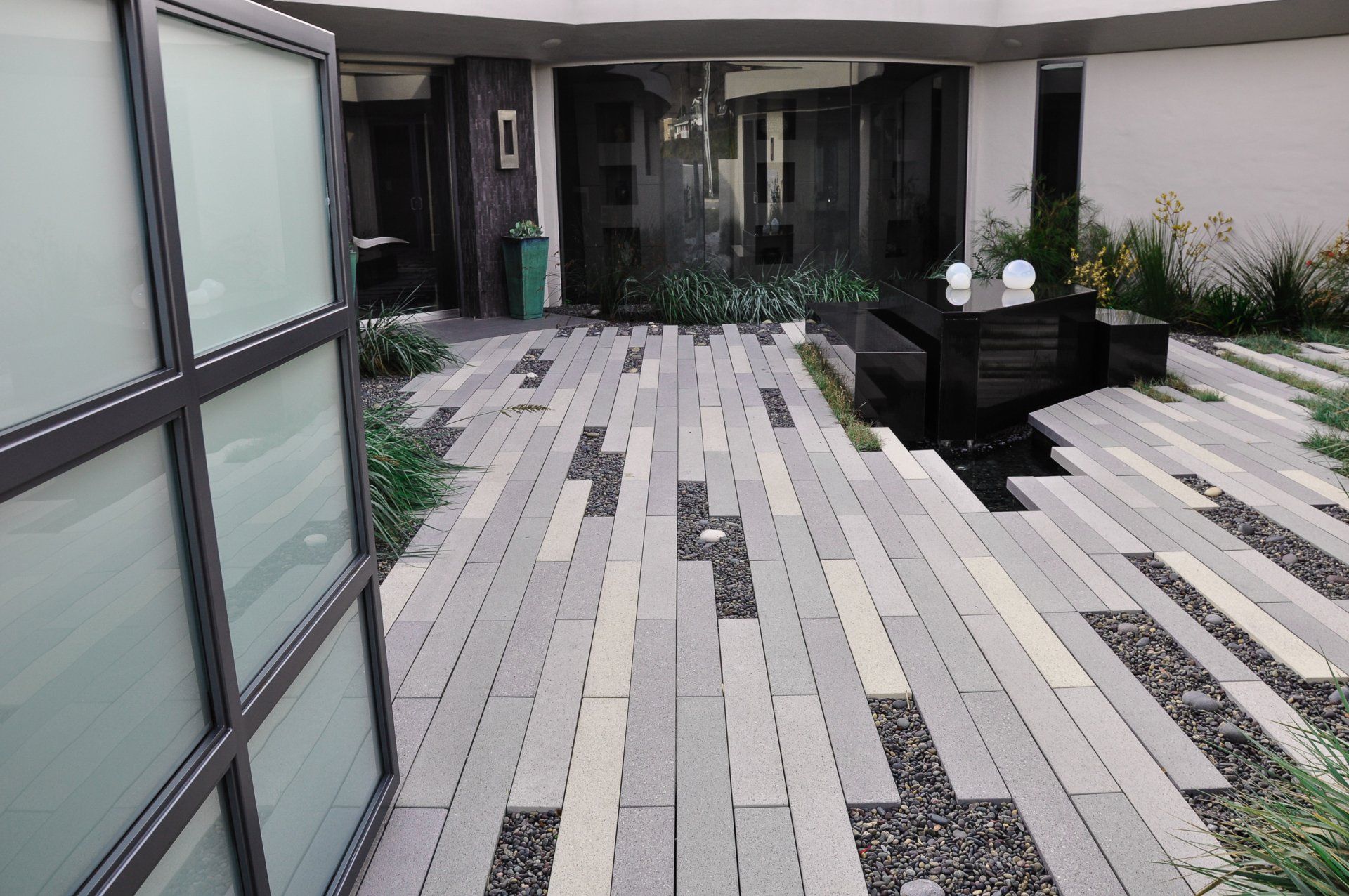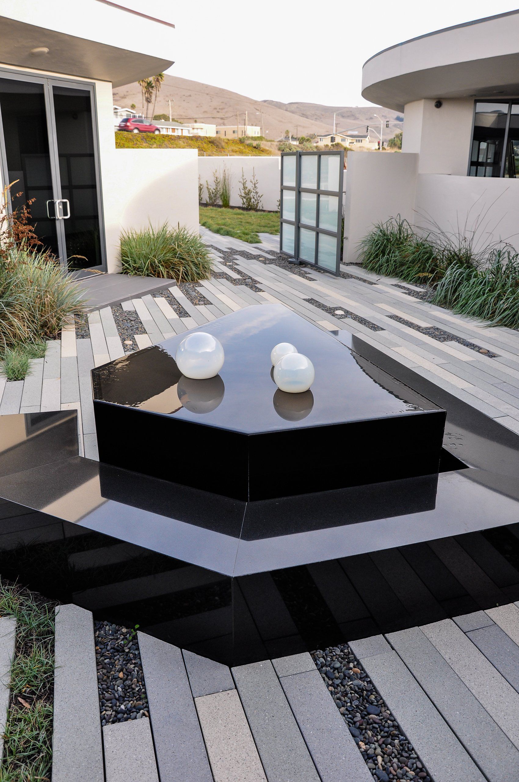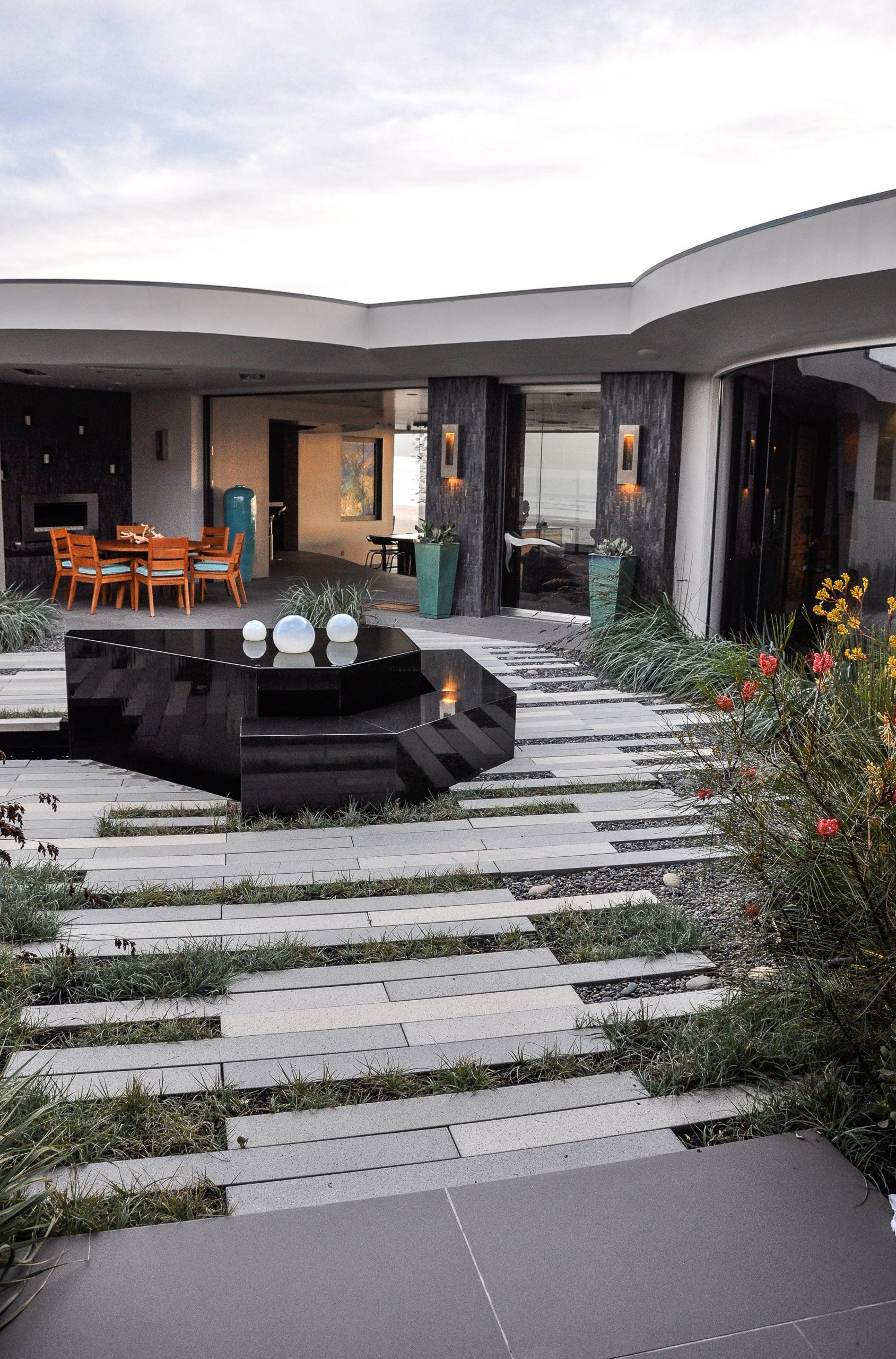 California coastal with a modern twist is what inspired this landscapes pallet. One of the greatest challenges of this project was the straightforward driveway approach that leads to the garage door. Large format pavers,(6”x48”) in the ground plane distract the eye and reorient the viewer to a large courtyard. The driveway gives way to a European dune grass, Carex flacca bringing the courtyard out into the driveway. Coastal winds make the central courtyard one of the main protected areas for entertainment and the heart of the home. All of the interior rooms have views into this meditative piece of art that focuses on a water feature that doubles as seating to interact with the elements.