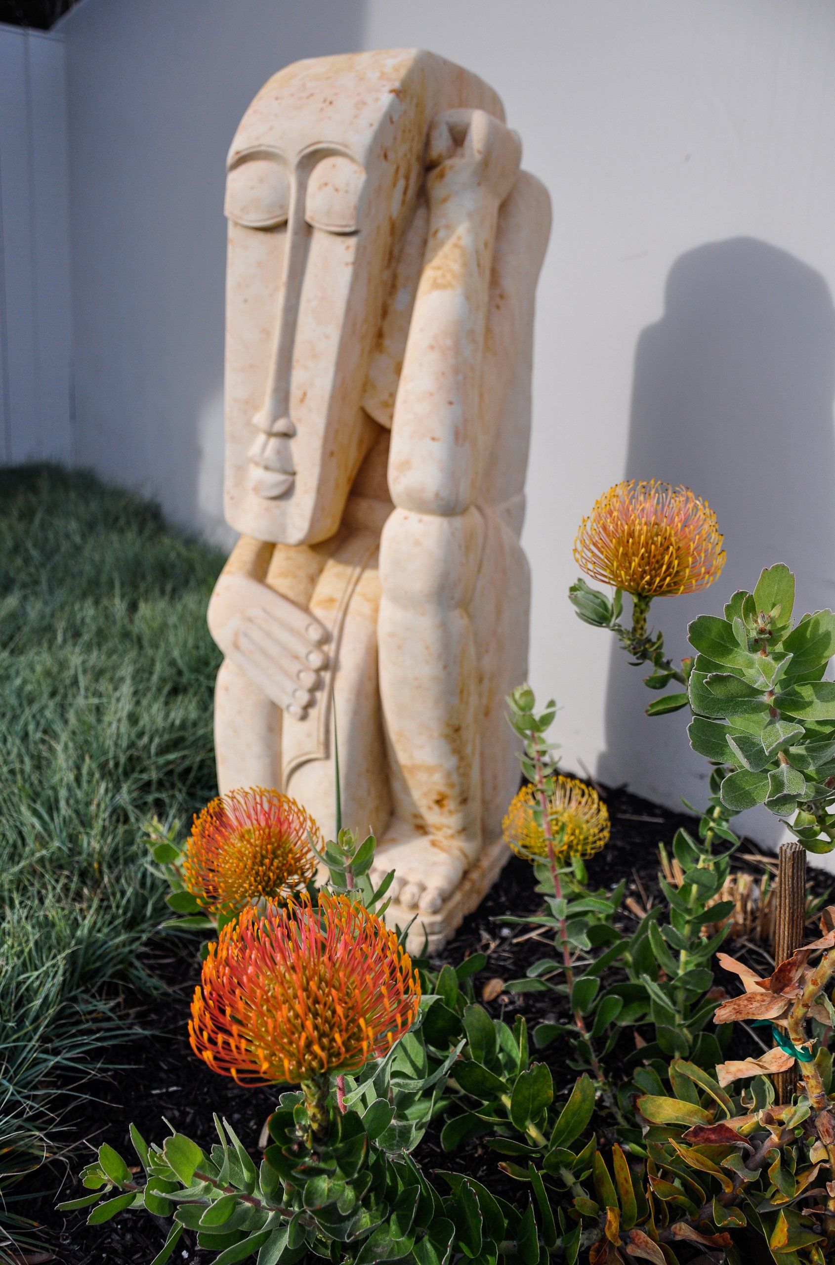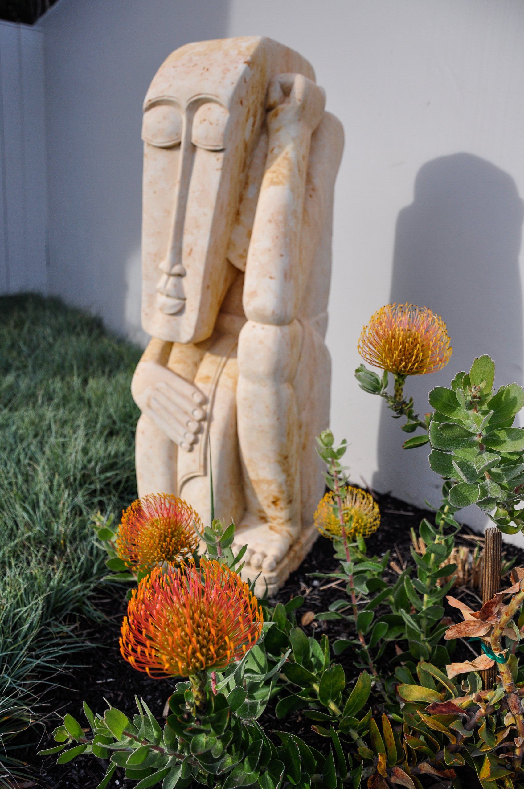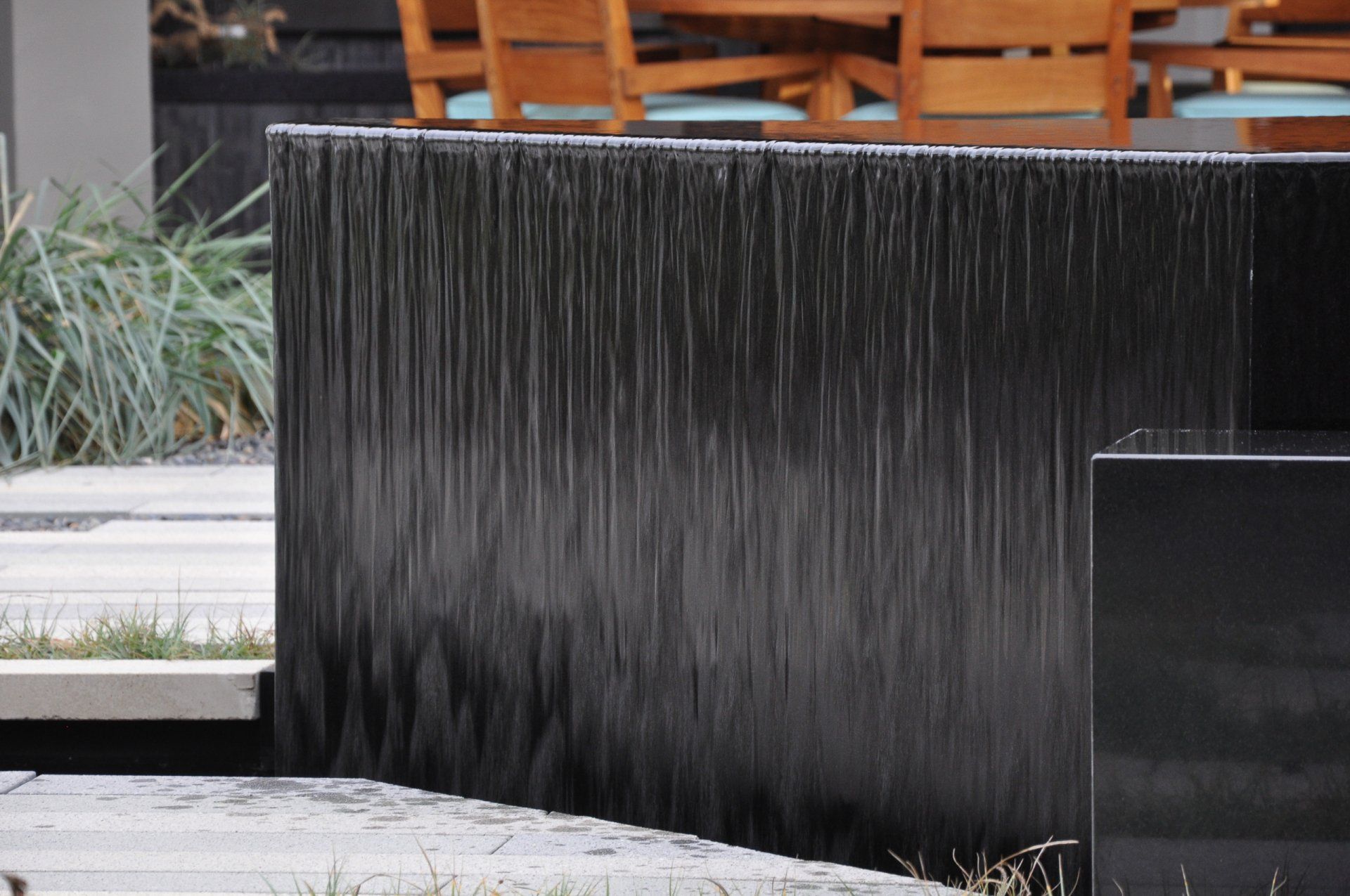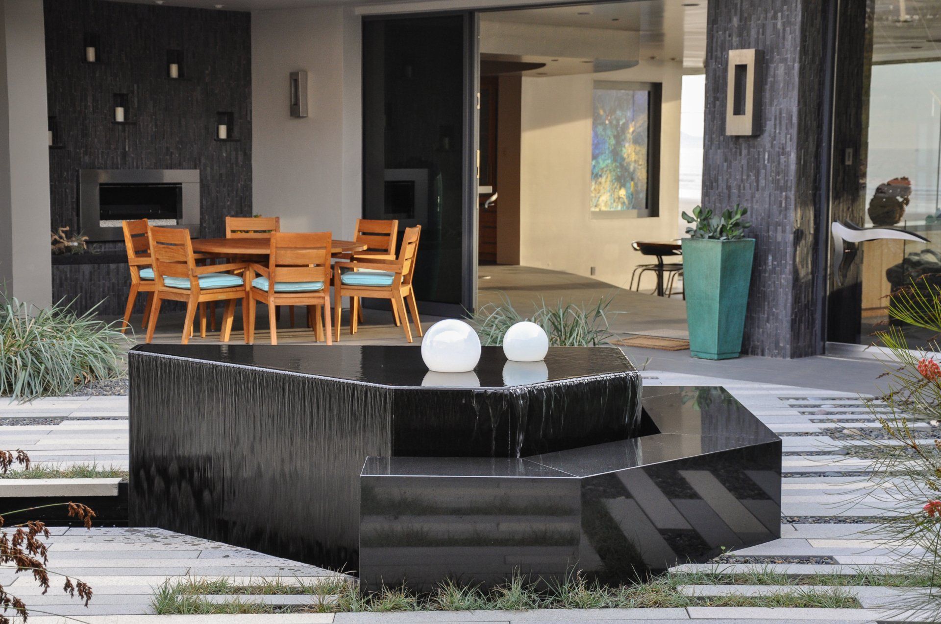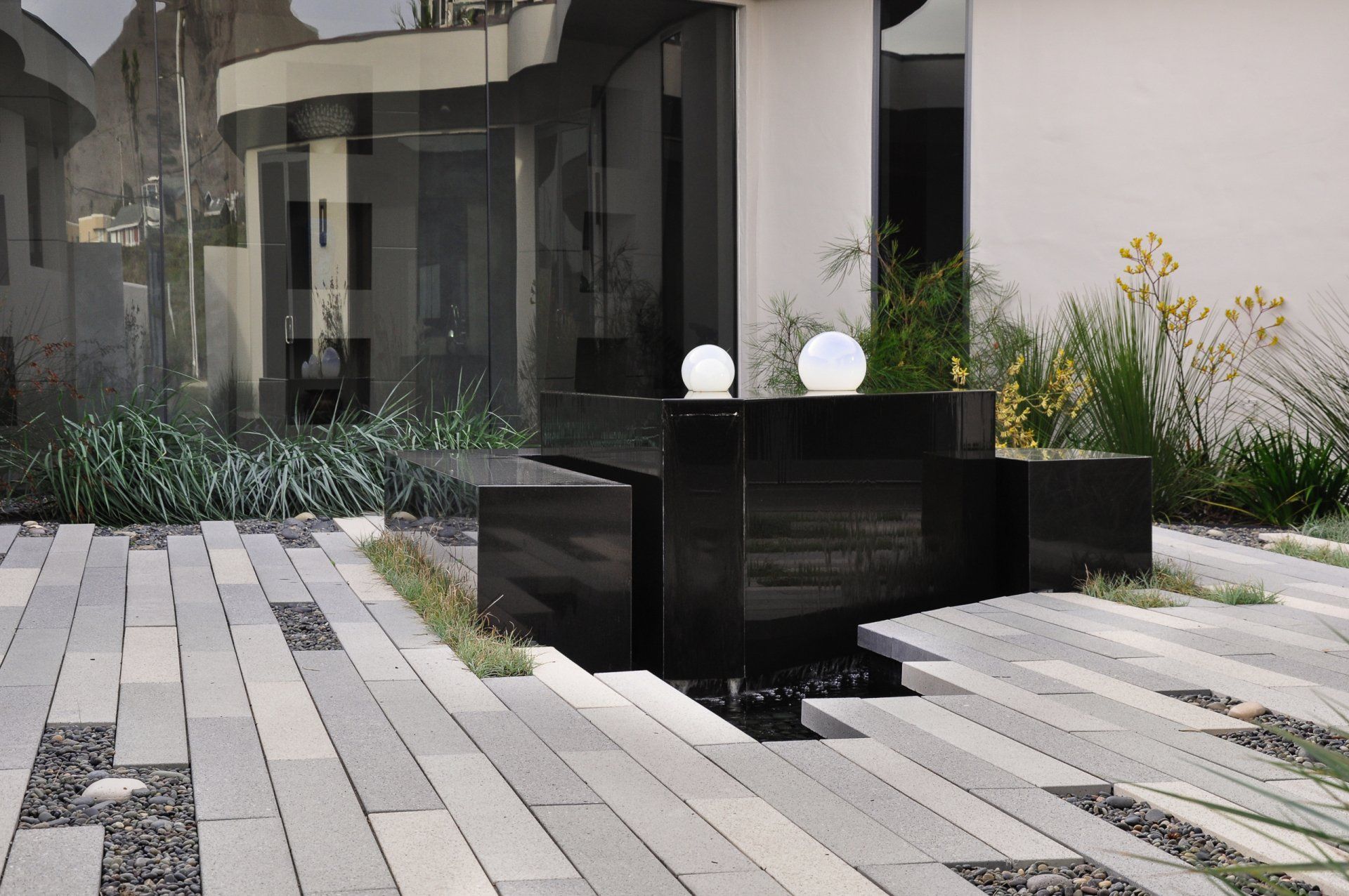 California coastal with a modern twist is what inspired this landscapes pallet. One of the greatest challenges of this project was the straightforward driveway approach that leads to the garage door. Large format pavers,(6”x48”) in the ground plane distract the eye and reorient the viewer to a large courtyard. The driveway gives way to a European dune grass, Carex flacca bringing the courtyard out into the driveway. Coastal winds make the central courtyard one of the main protected areas for entertainment and the heart of the home. All of the interior rooms have views into this meditative piece of art that focuses on a water feature that doubles as seating to interact with the elements.