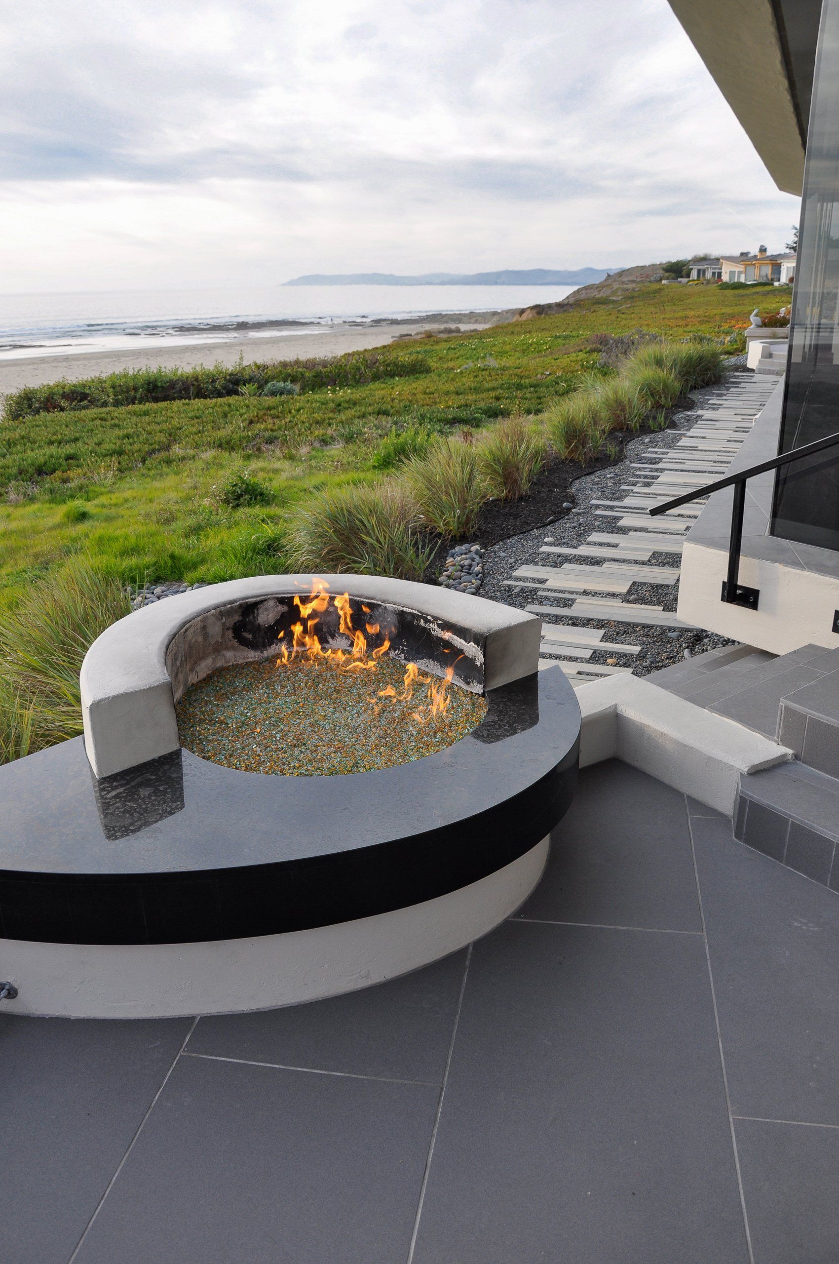 A lush garden seating room equipped with a fire pit was designed in the front yard utilize an often untapped outdoor space. Using the house as a powerful windbreak from the Pacific winds, this gave the clients more options for outdoor entertainment on windy days.