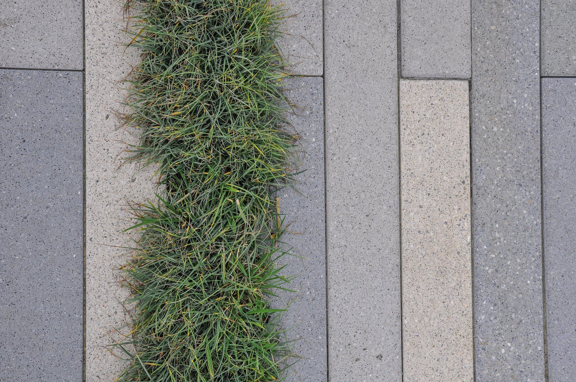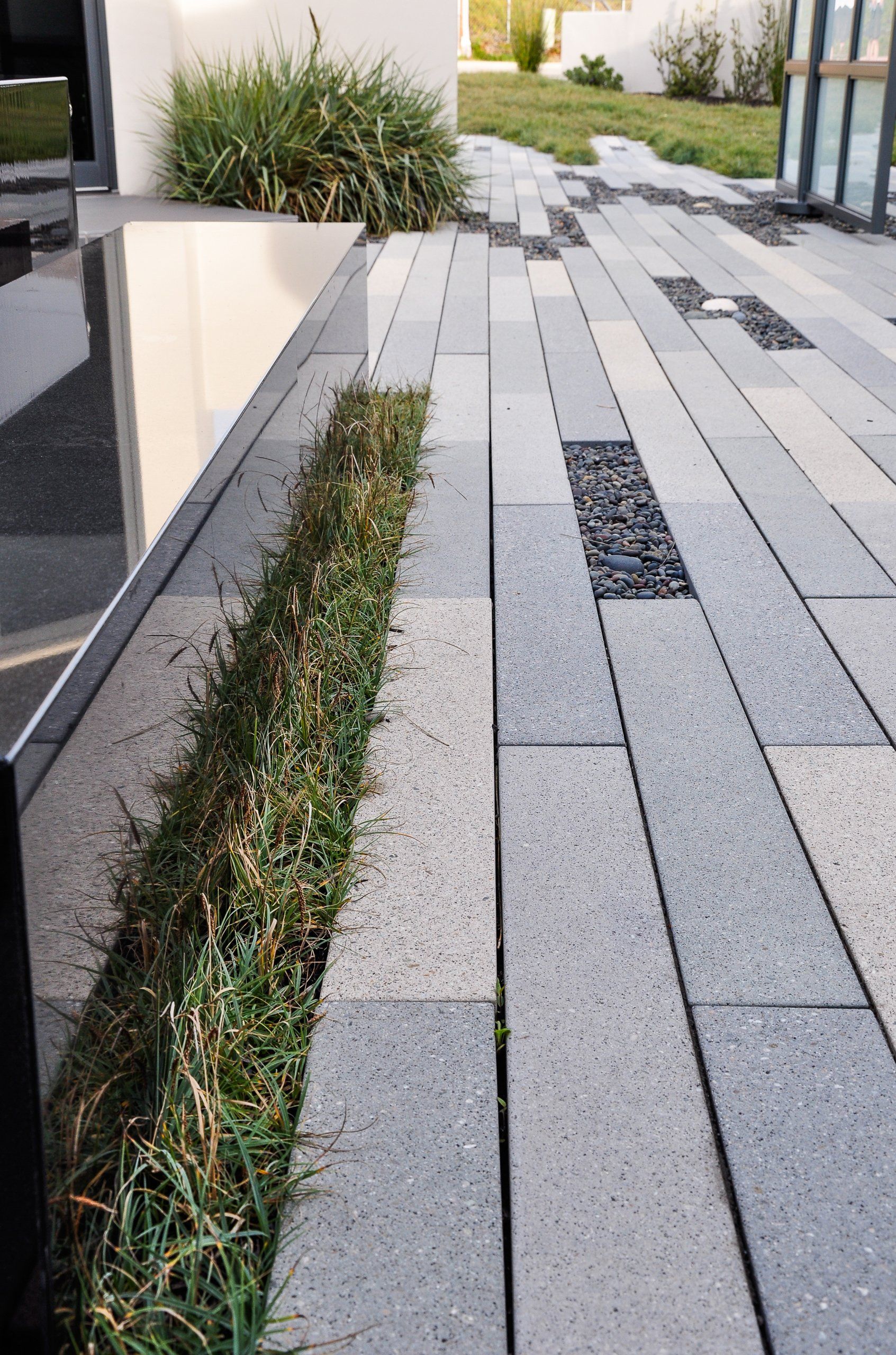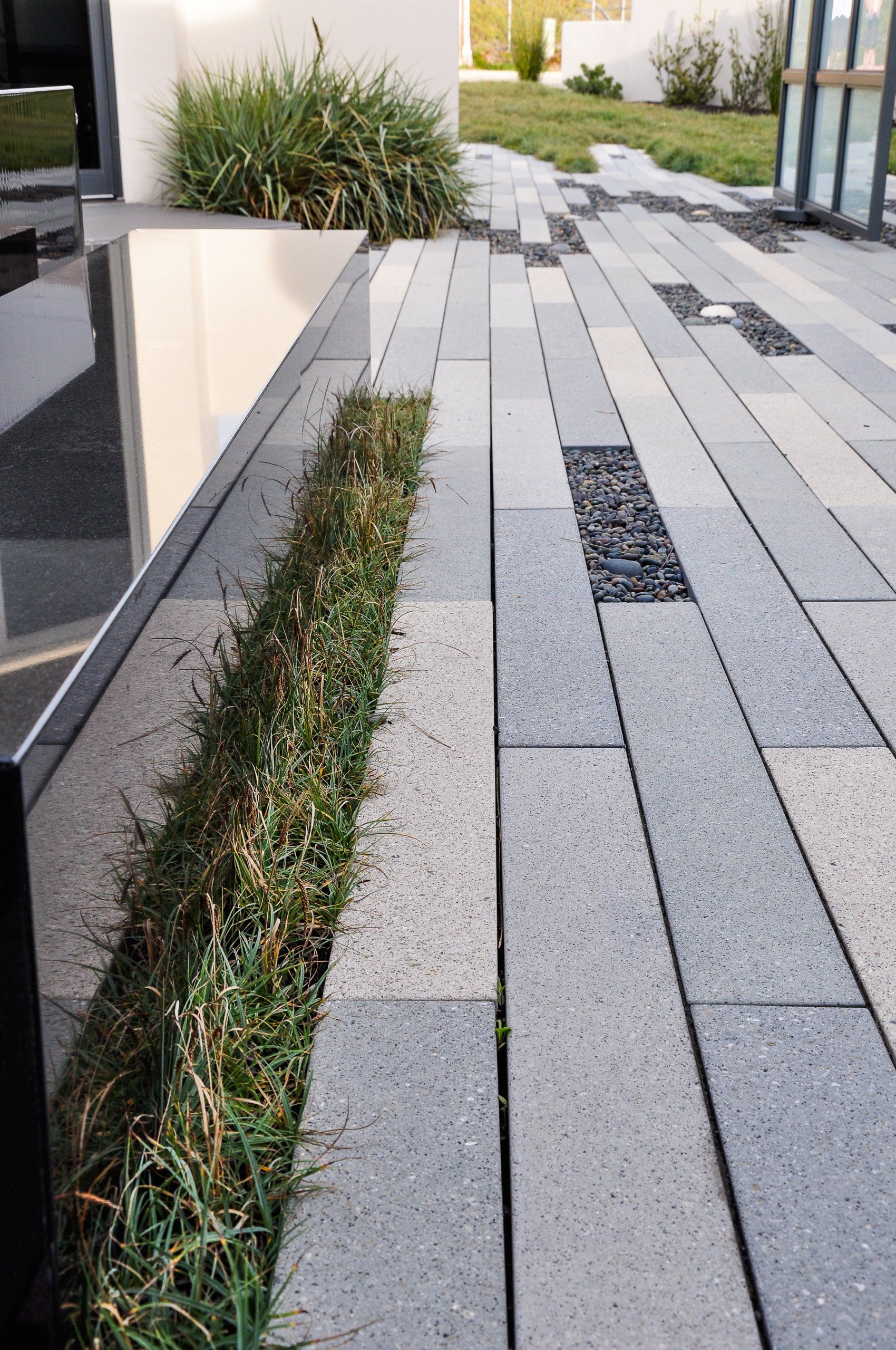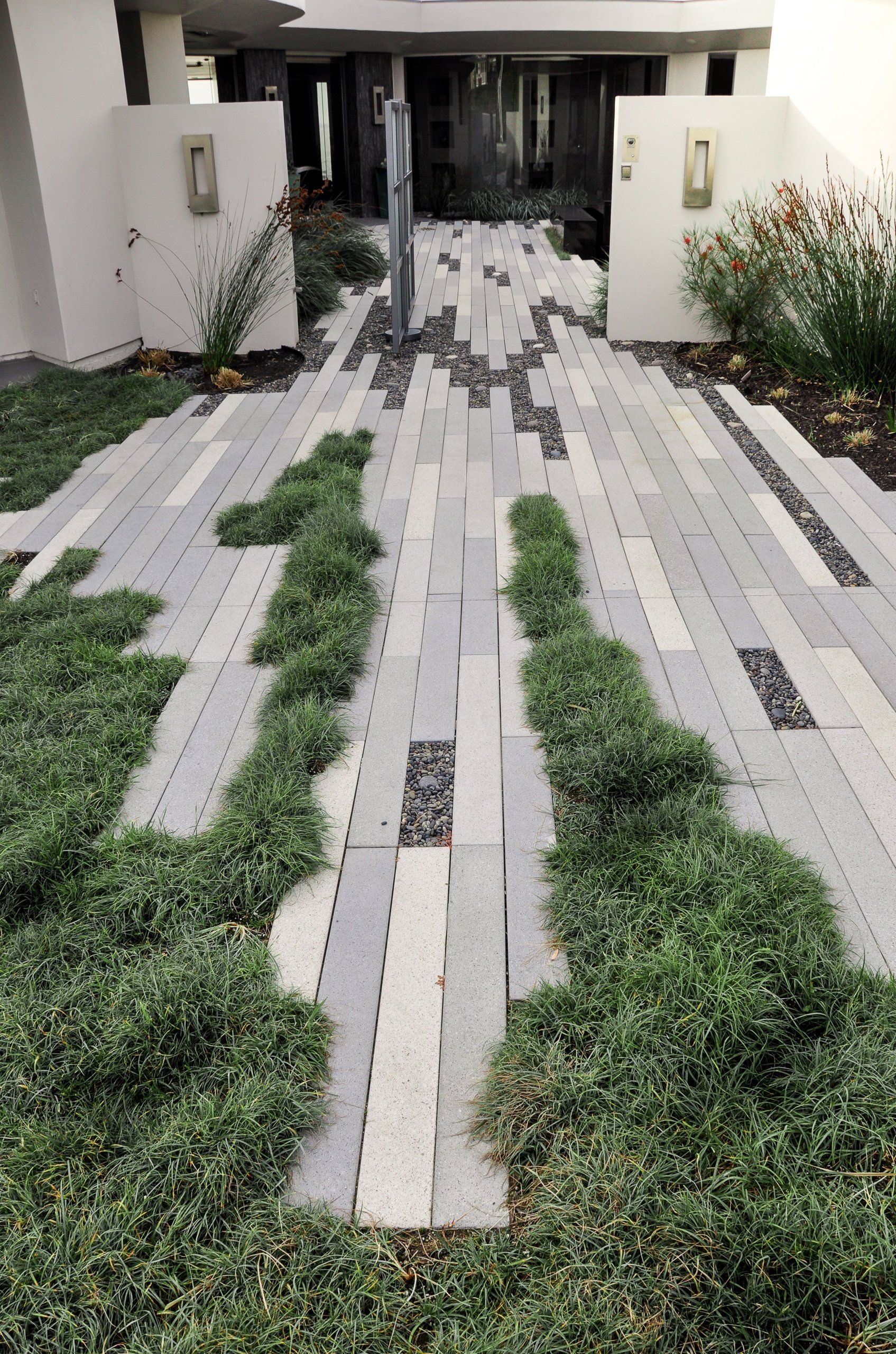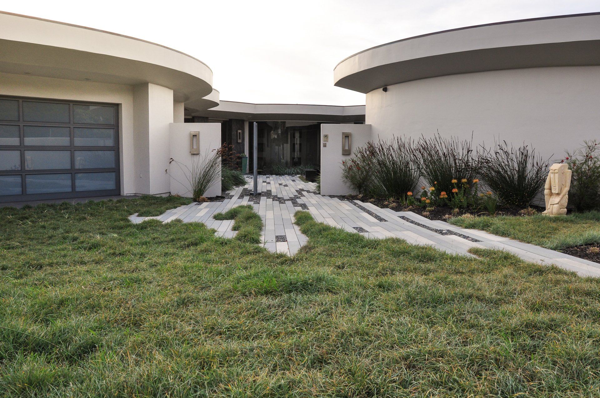 The entry to the home was redesigned to subdue the garage; breaking the driveway with turf planted over a subsurface structure able to support cars.