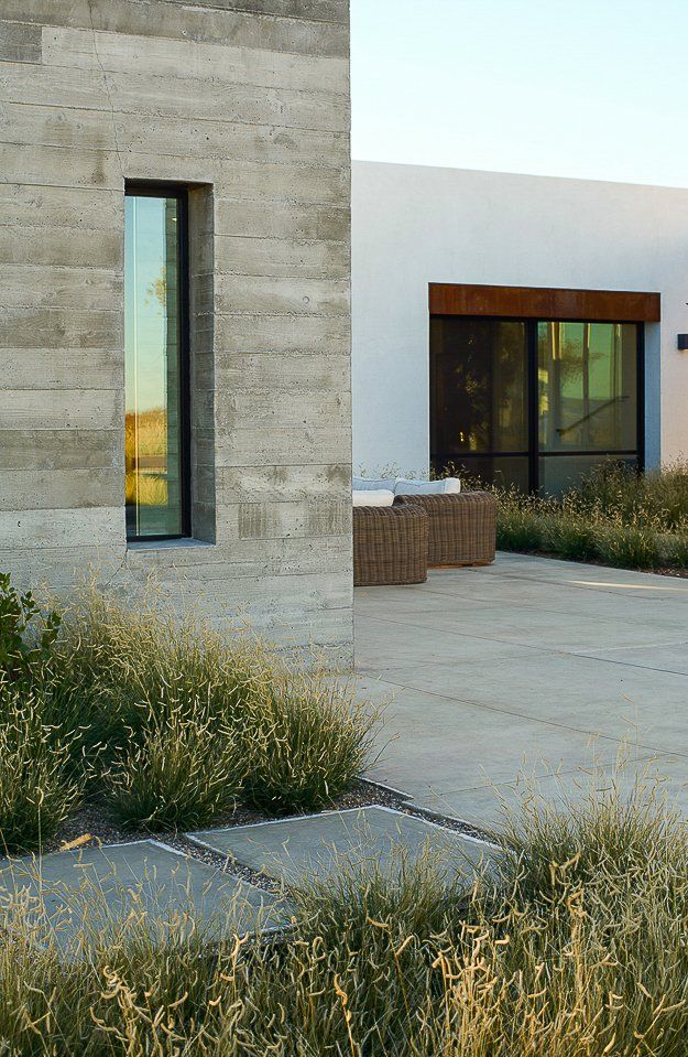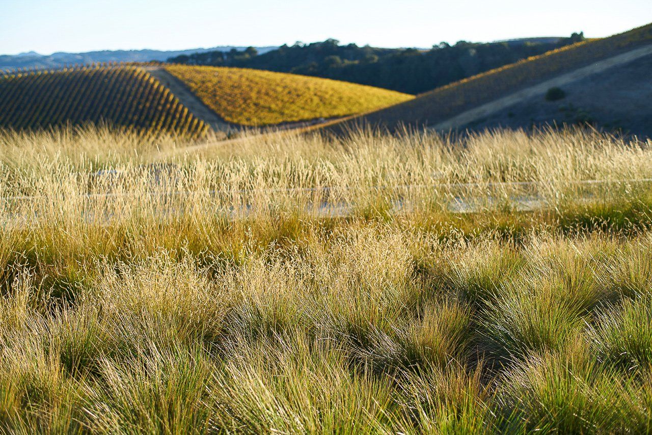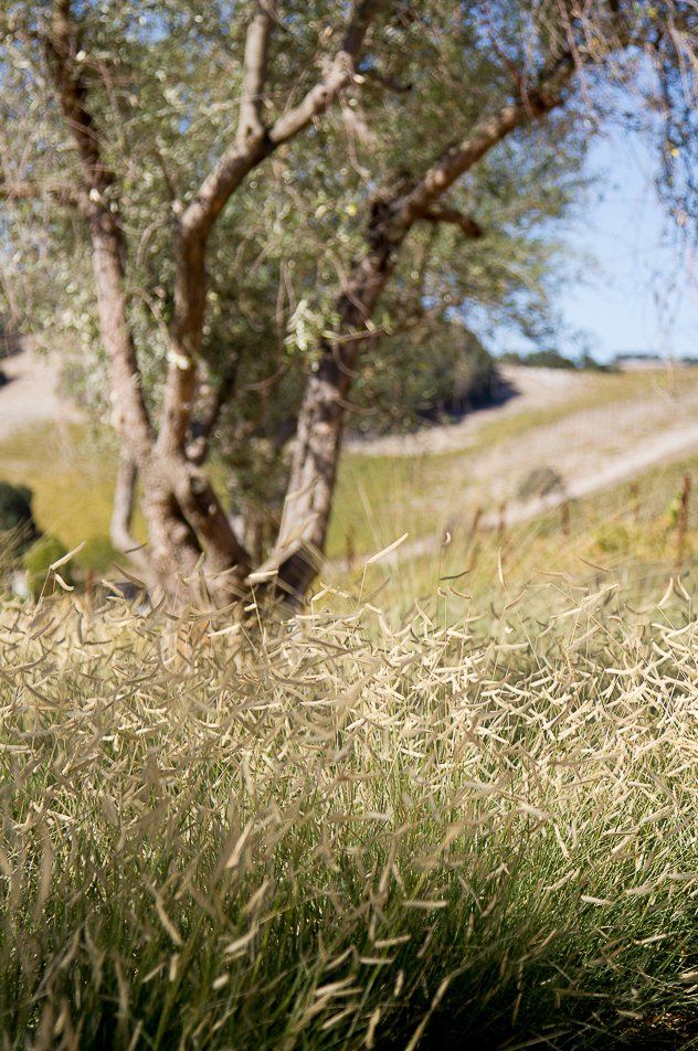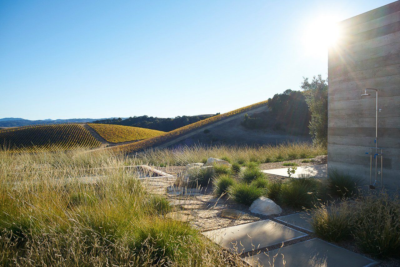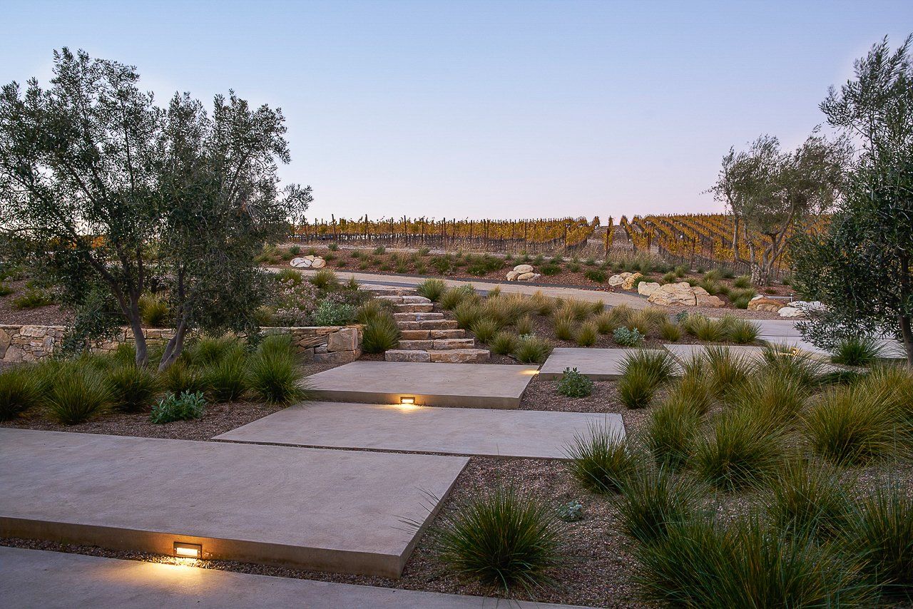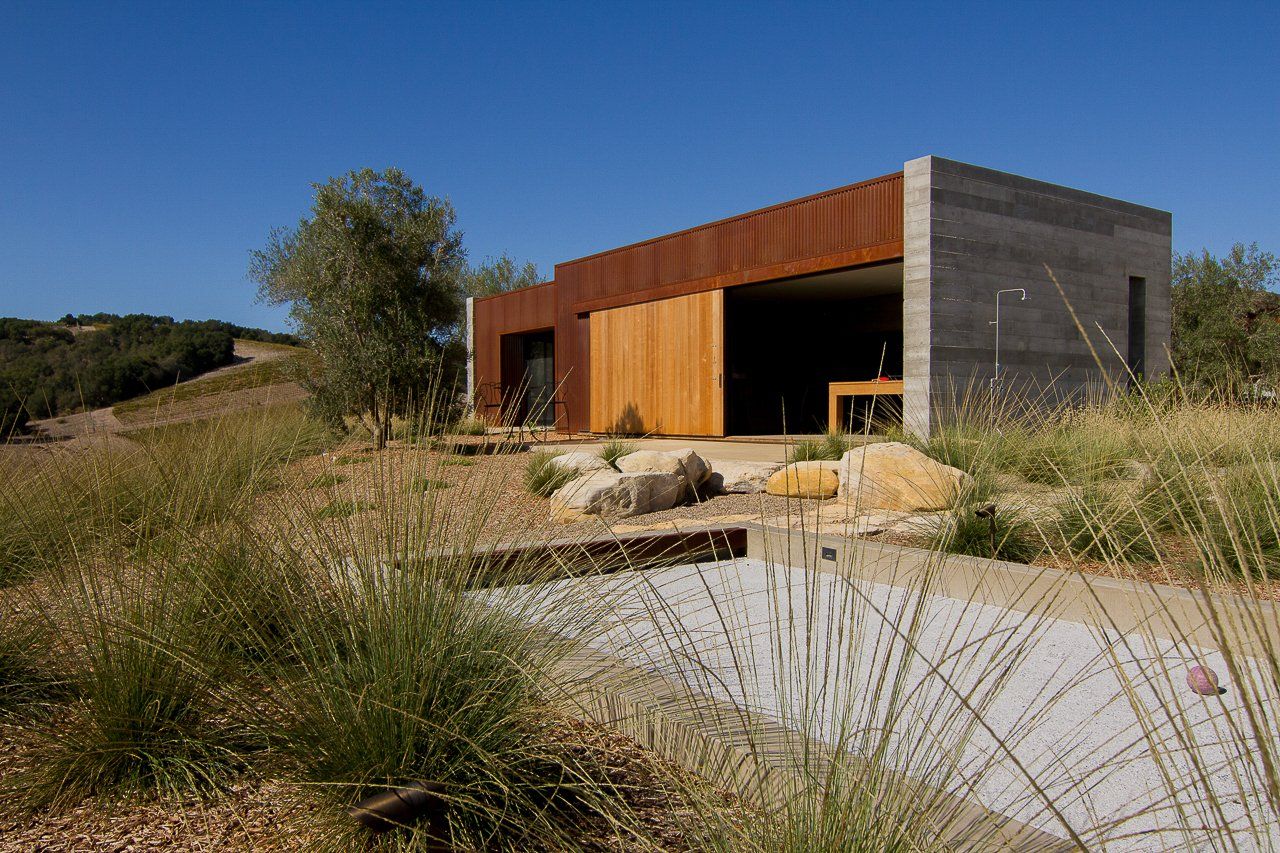 Delicate plant textures that flutter in the wind softened the modern hardscape and architecture; creating a striking balance between the built and natural environments. Large drifts of drought tolerant grasses allowed for sweeping views to continue past the property line, to the clients’ vineyards and the rolling hills beyond.