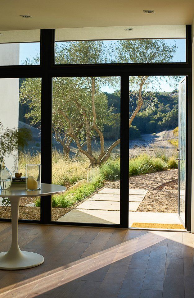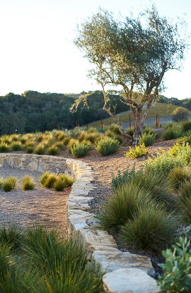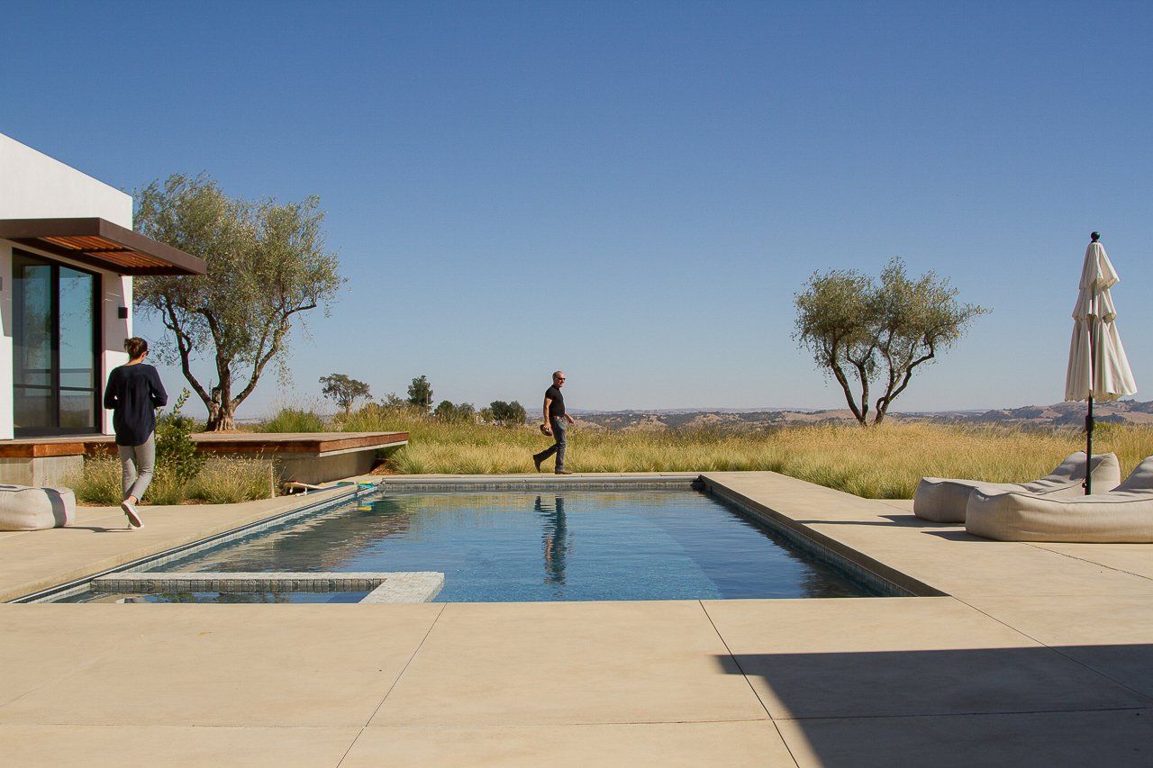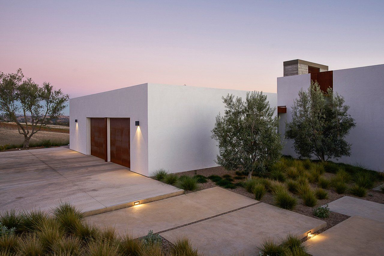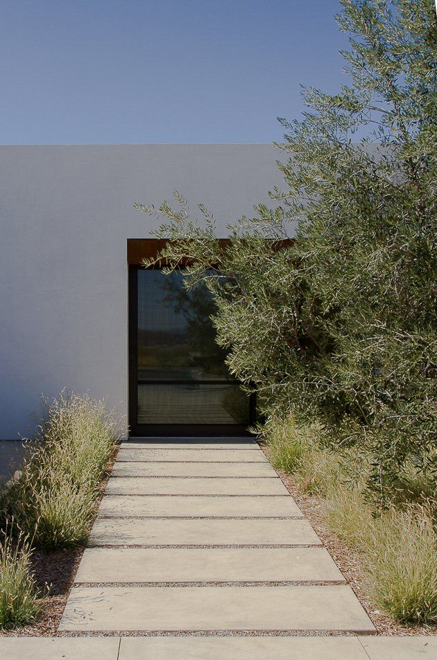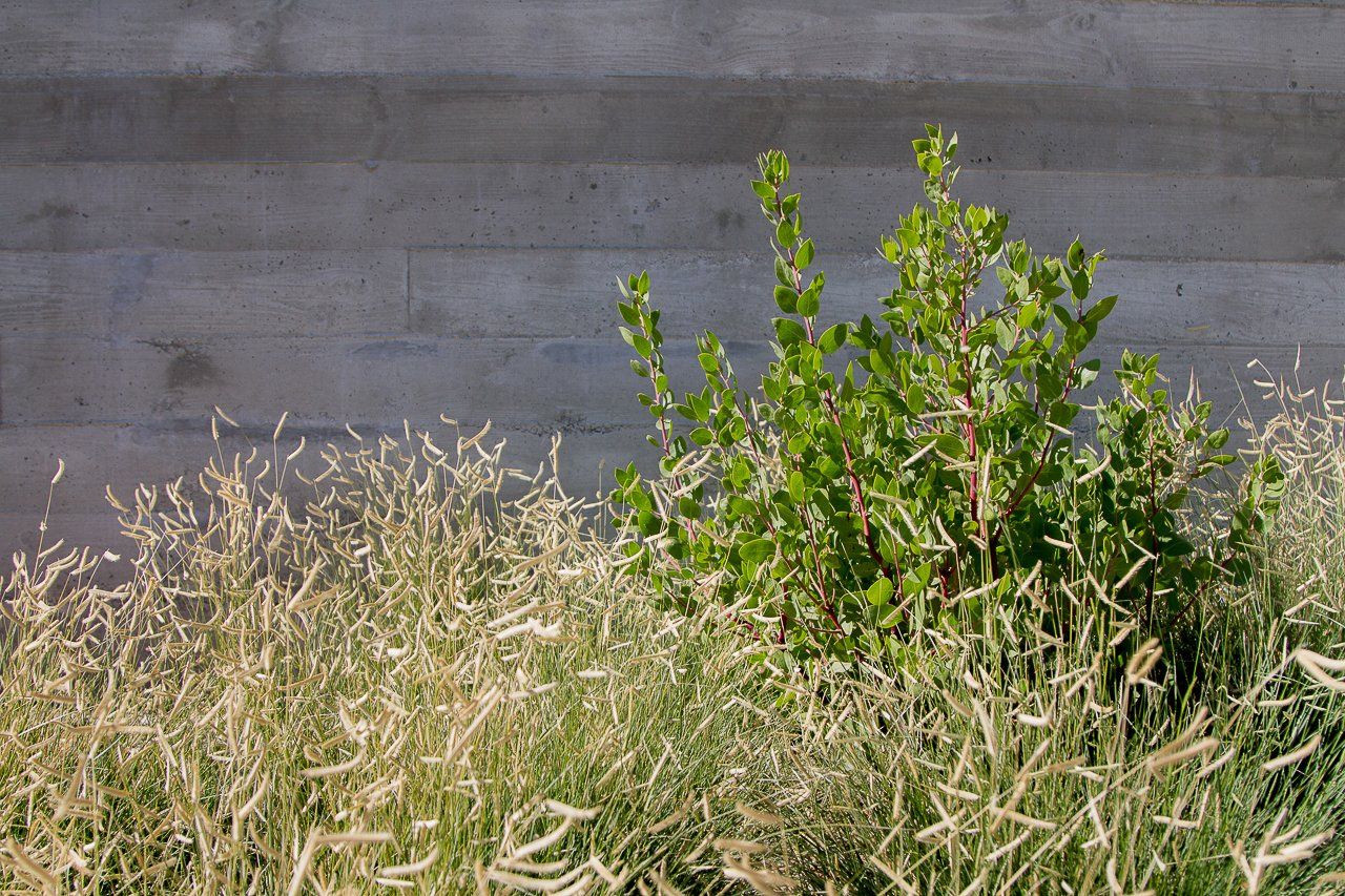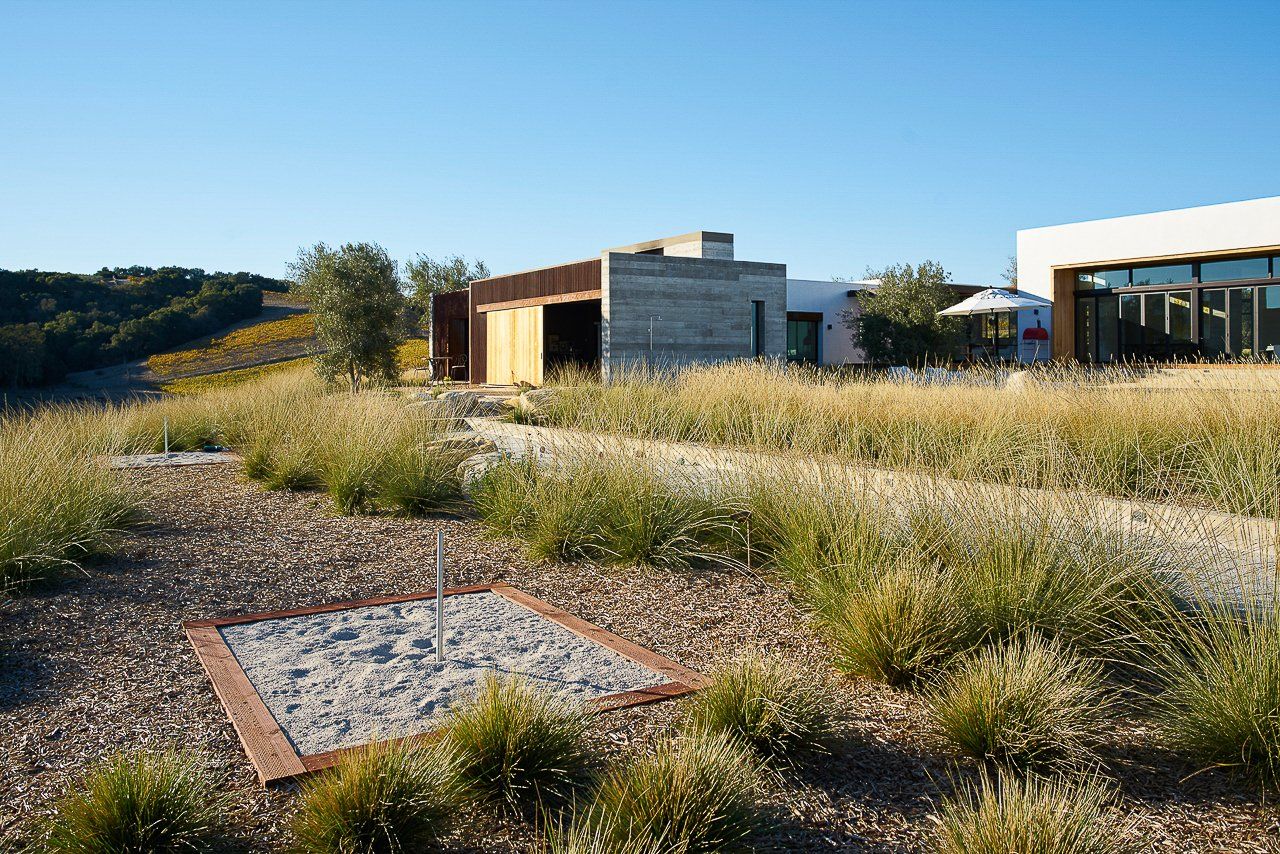 Delicate plant textures that flutter in the wind softened the modern hardscape and architecture; creating a striking balance between the built and natural environments. Large drifts of drought tolerant grasses allowed for sweeping views to continue past the property line, to the clients’ vineyards and the rolling hills beyond.