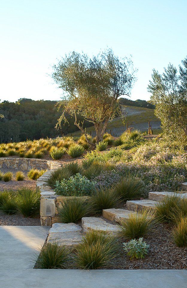 Applying a subdued color palette accentuated with Mediterranean grasses and timeworn olive trees, the new landscape anchored and blended the home into its surrounding environment.