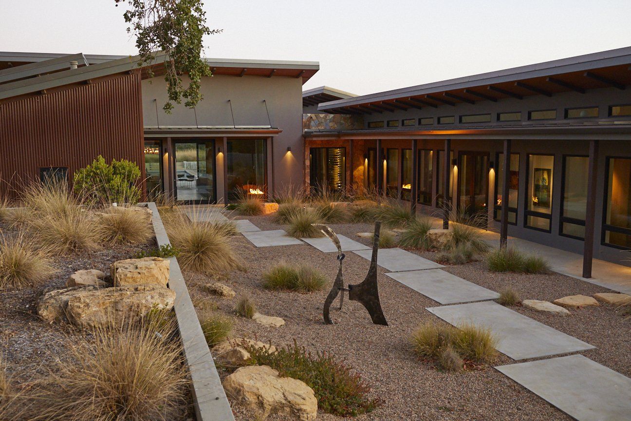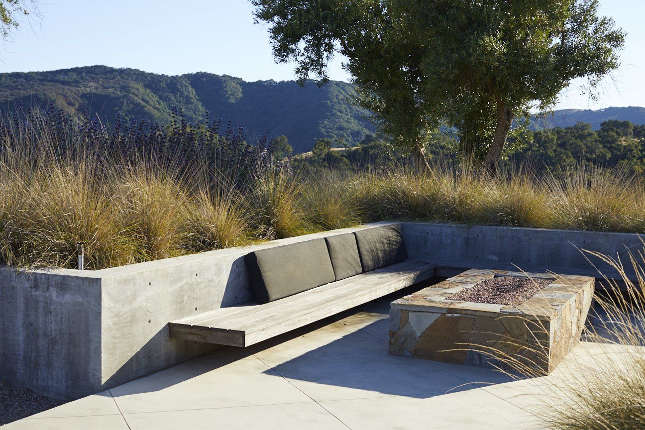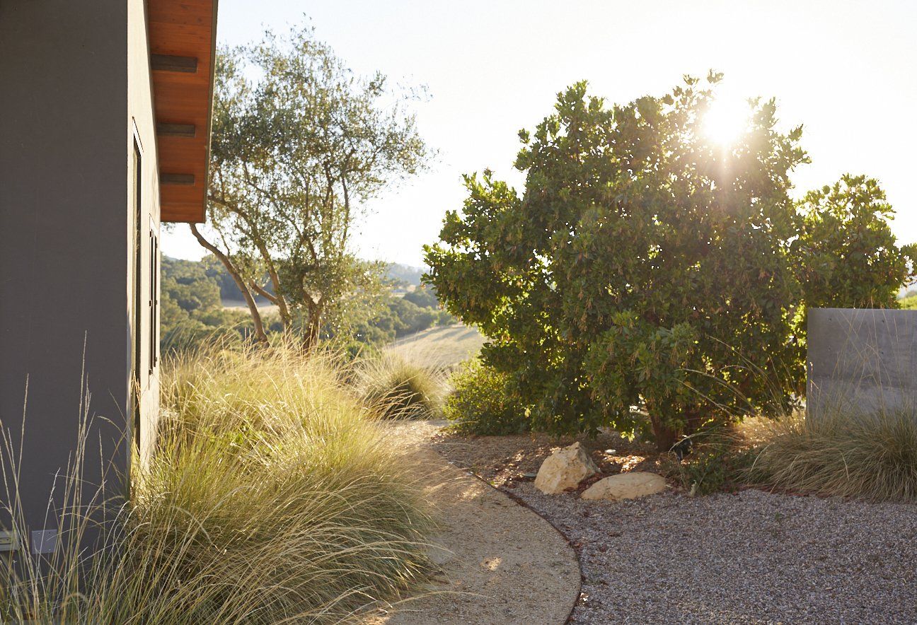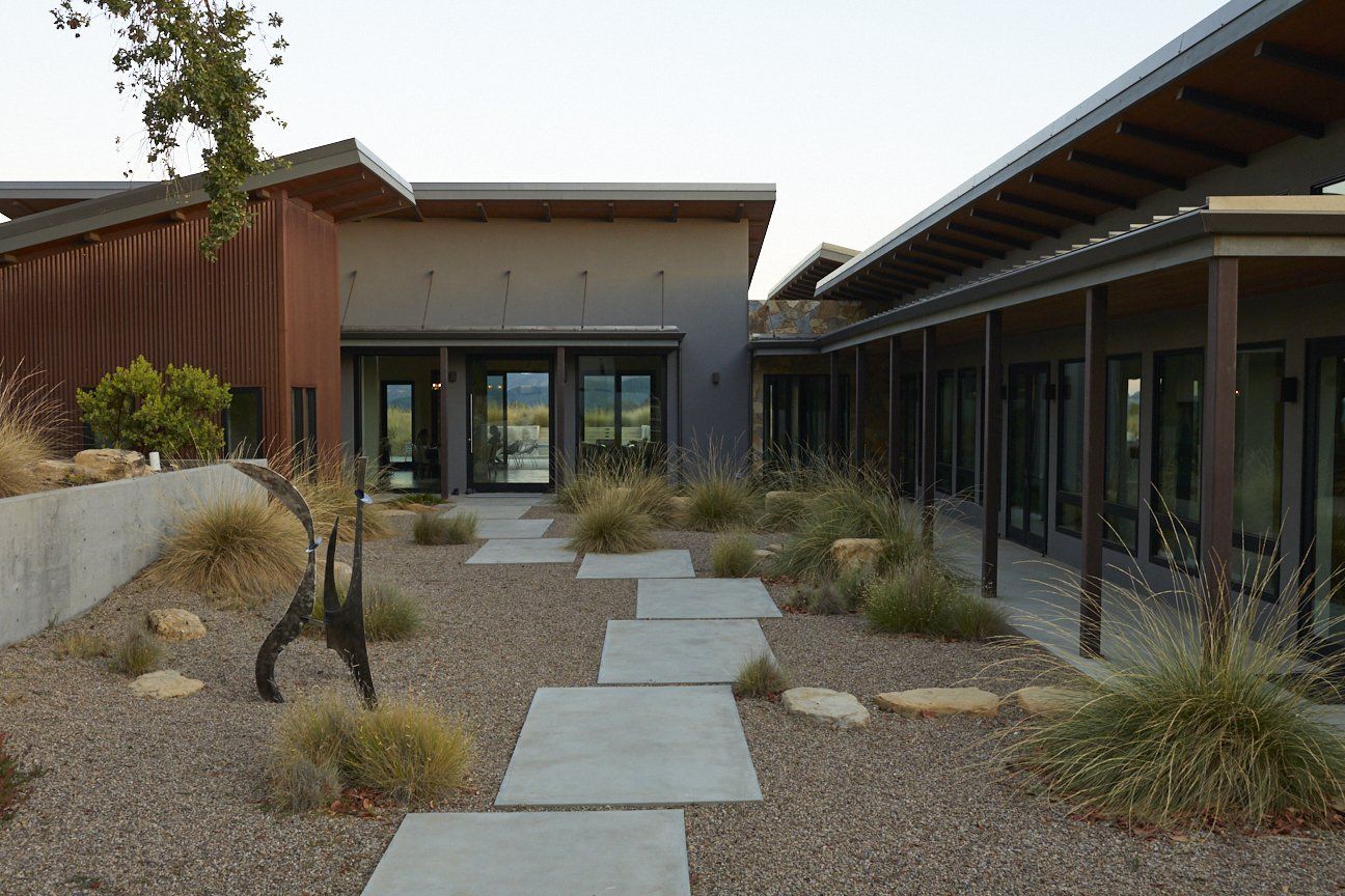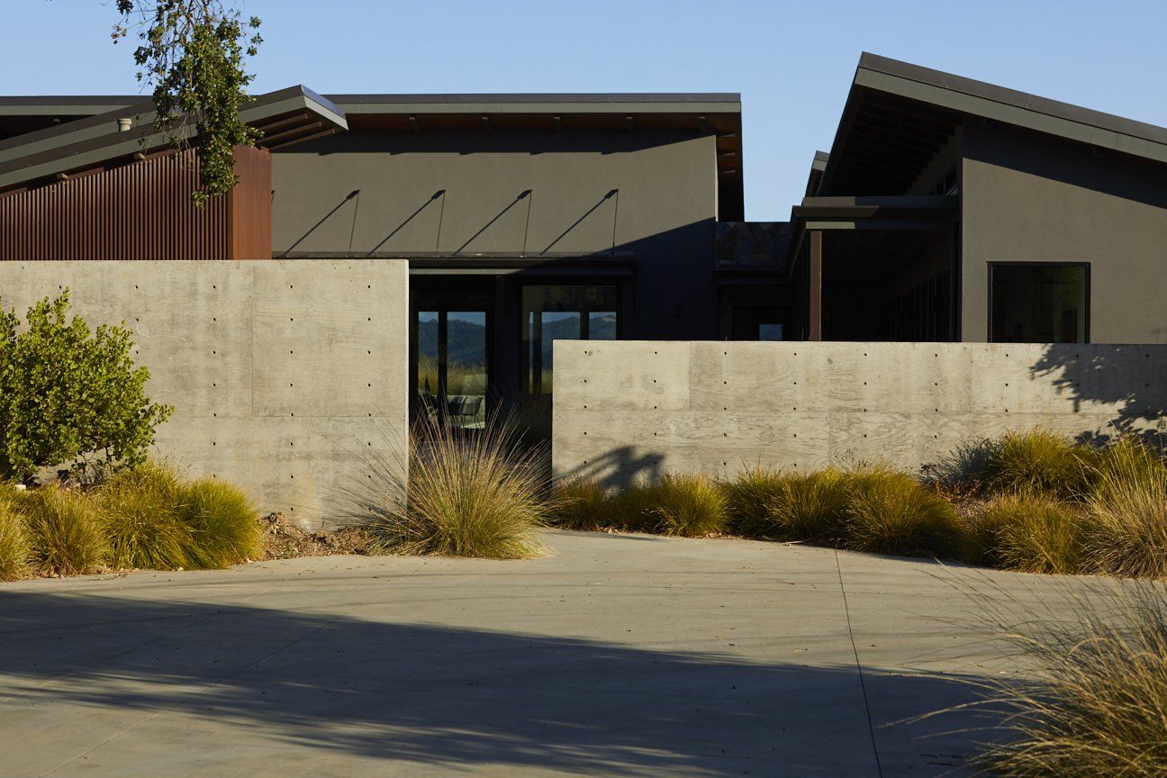Located on top of a hill surrounded by valley ridgetops this project has 360-degree views of the region. The client's approach to the site was to drop it into part of the hill to keep the privacy and protect against coastal afternoon winds. The landscape design plays a major role in extending the indoor-outdoor connections to the surrounding regional views. Courtyard walls of board form concrete were used to insert the home and pool into the site and topography was brought back upon the walls to mimic the silhouettes of the valley hills. Views from the interior glass walls look out into these courtyard spaces as meditative vignettes of the natural surroundings.