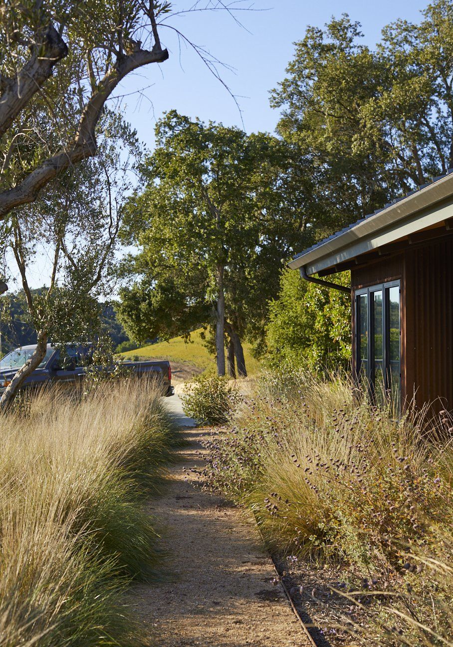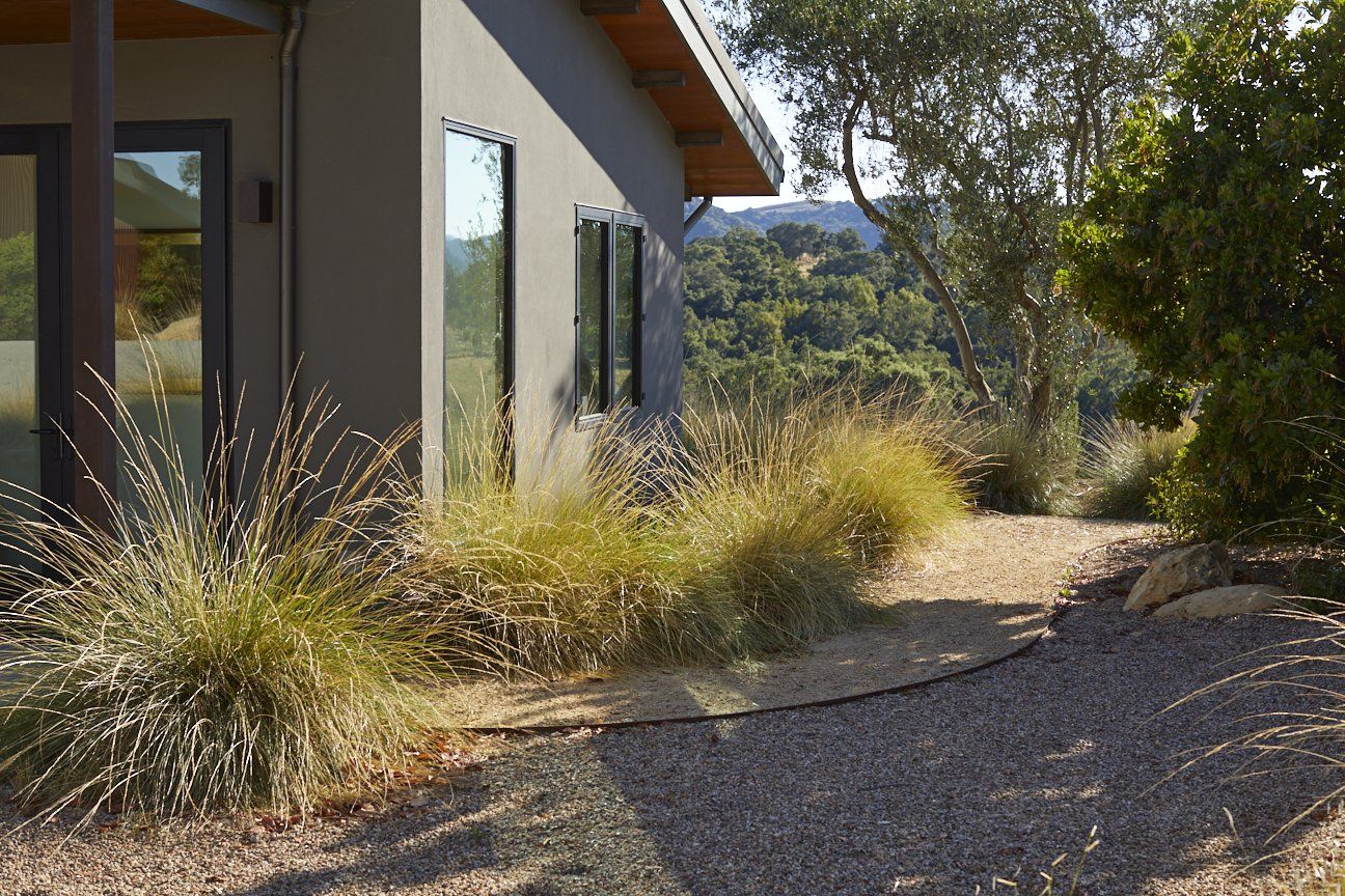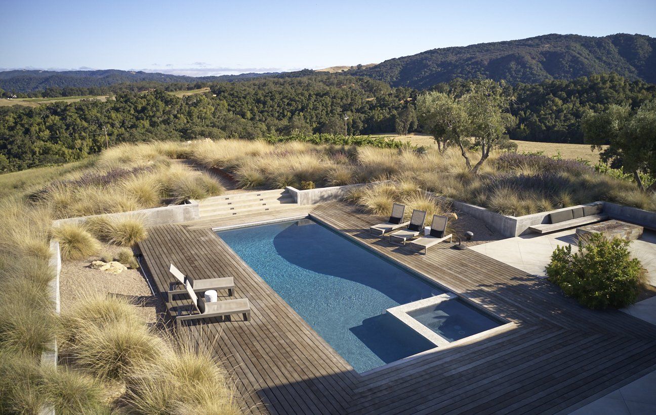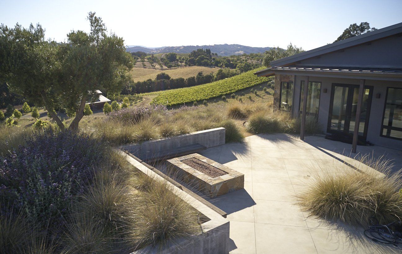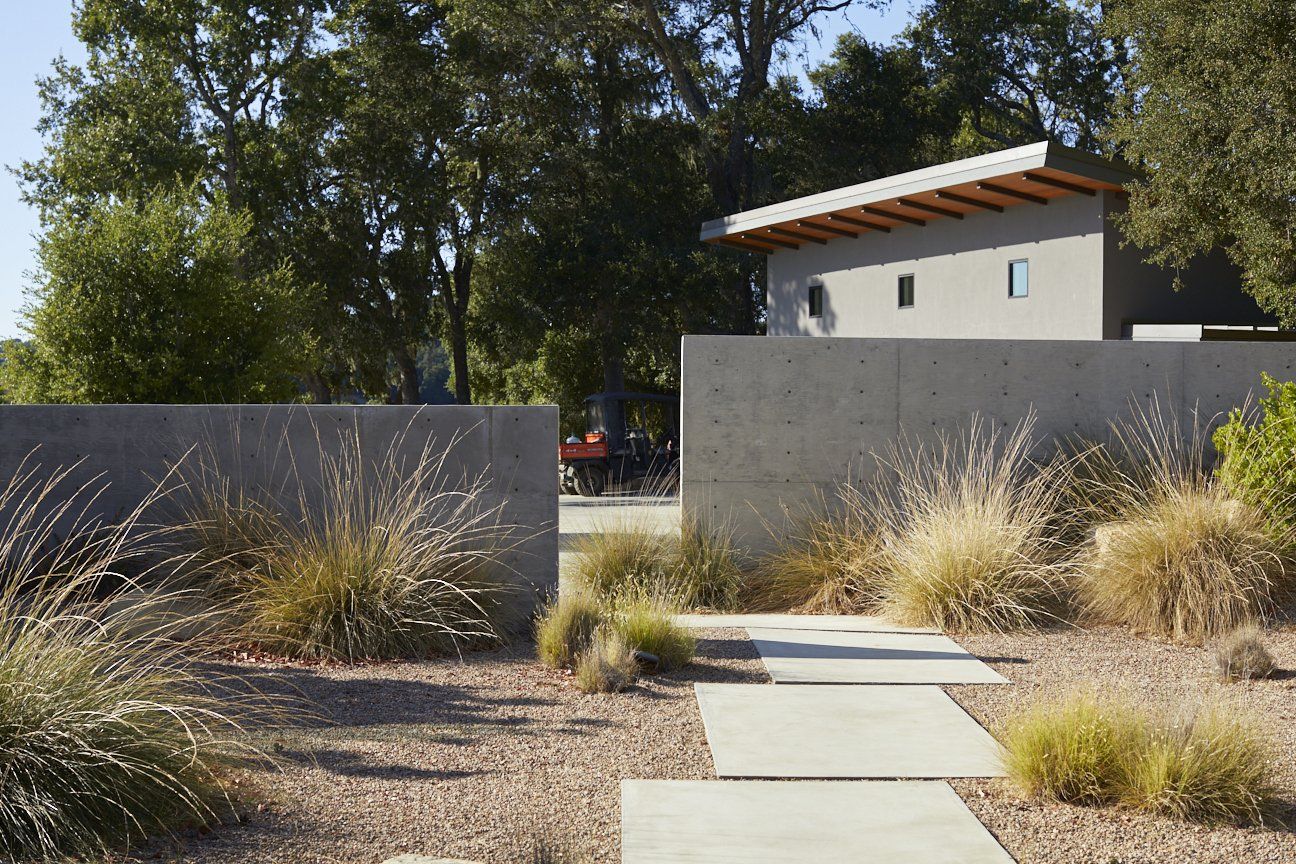Located on top of a hill surrounded by valley ridgetops this project has 360-degree views of the region. The client's approach to the site was to drop it into part of the hill to keep the privacy and protect against coastal afternoon winds. The landscape design plays a major role in extending the indoor-outdoor connections to the surrounding regional views. Courtyard walls of board form concrete were used to insert the home and pool into the site and topography was brought back upon the walls to mimic the silhouettes of the valley hills. Views from the interior glass walls look out into these courtyard spaces as meditative vignettes of the natural surroundings.